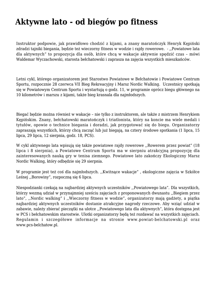 Aktywne lato - od biegów po fitness Instruktor podpowie, jak prawidłowo chodzić z kijami, a znany maratończyk Henryk Kępiński zdradzi tajniki biegania, będzie też wieczorny fitness w wodzie i rajdy rowerowe. - ,,Powiatowe lata dla aktywnych” to propozycja dla osób, które chcą w wakacje aktywnie spędzić czas – mówi Waldemar Wyczachowski, starosta bełchatowski i zaprasza na zajęcia wszystkich mieszkańców. Letni cykl, którego organizatorem jest Starostwo Powiatowe w Bełchatowie i Powiatowe Centrum Sportu, rozpocznie 28 czerwca VII Bieg Rekreacyjny i Marsz Nordic Walking. Uczestnicy spotkają się w Powiatowym Centrum Sportu i wystartują o godz. 11, w programie oprócz biegu głównego na 10 kilometrów i marszu z kijami, także bieg krasnala dla najmłodszych. Biegać będzie można również w wakacje – nie tylko z instruktorem, ale także z mistrzem Henrykiem Kępińskim. Znany, bełchatowski maratończyk i triatlonista, który na koncie ma wiele medali i tytułów, opowie o technice biegania i doradzi, jak przygotować się do biegu. Organizatorzy zapraszają wszystkich, którzy chcą zacząć lub już biegają, na cztery środowe spotkania (1 lipca, 15 lipca, 29 lipca, 12 sierpnia, godz. 18, PCS). W cykl aktywnego lata wpisują się także powiatowe rajdy rowerowe ,,Rowerem przez powiat” (18 lipca i 8 sierpnia), a Powiatowe Centrum Sportu ma w sierpniu atrakcyjną propozycję dla zainteresowanych nauką gry w tenisa ziemnego. Powiatowe lato zakończy Ekologiczny Marsz Nordic Walking, który odbędzie się 29 sierpnia. W programie jest też coś dla najmłodszych. ,,Kwitnące wakacje” , ekologiczne zajęcia w Szkółce Leśnej ,,Borowiny”, rozpoczną się 6 lipca. Niespodzianki czekają na najbardziej aktywnych uczestników ,,Powiatowego lata”. Dla wszystkich, którzy wezmą udział w przynajmniej sześciu zajęciach z proponowanych dwunastu ,,Biegiem przez lato”, ,,Nordic walking” i ,,Wieczorny fitness w wodzie”, organizatorzy mają gadżety, a piątka najbardziej aktywnych uczestników dostanie atrakcyjne nagrody rzeczowe. Aby wziąć udział w zabawie, należy zbierać pieczątki na ulotce ,,Powiatowego lata dla aktywnych”, która dostępna jest w PCS i bełchatowskim starostwie. Ulotki organizatorzy będą też rozdawać na wszystkich zajęciach. Regulamin i szczegółowe informacje na stronie www.powiat-belchatowski.pl oraz www.pcs-belchatow.pl.