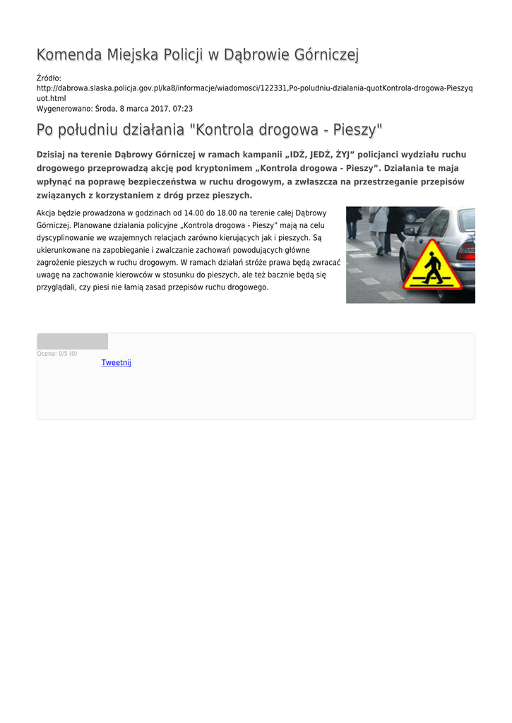 Komenda Miejska Policji w Dąbrowie Górniczej Źródło: http://dabrowa.slaska.policja.gov.pl/ka8/informacje/wiadomosci/122331,Po-poludniu-dzialania-quotKontrola-drogowa-Pieszyq uot.html Wygenerowano: Środa, 8 marca 2017, 07:23 Po południu działania "Kontrola drogowa - Pieszy" Dzisiaj na terenie Dąbrowy Górniczej w ramach kampanii „IDŹ, JEDŹ, ŻYJ” policjanci wydziału ruchu drogowego przeprowadzą akcję pod kryptonimem „Kontrola drogowa - Pieszy”. Działania te maja wpłynąć na poprawę bezpieczeństwa w ruchu drogowym, a zwłaszcza na przestrzeganie przepisów związanych z korzystaniem z dróg przez pieszych. Akcja będzie prowadzona w godzinach od 14.00 do 18.00 na terenie całej Dąbrowy Górniczej. Planowane działania policyjne „Kontrola drogowa - Pieszy” mają na celu dyscyplinowanie we wzajemnych relacjach zarówno kierujących jak i pieszych. Są ukierunkowane na zapobieganie i zwalczanie zachowań powodujących główne zagrożenie pieszych w ruchu drogowym. W ramach działań stróże prawa będą zwracać uwagę na zachowanie kierowców w stosunku do pieszych, ale też bacznie będą się przyglądali, czy piesi nie łamią zasad przepisów ruchu drogowego. Ocena: 0/5 (0) Tweetnij