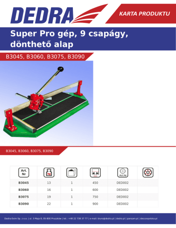 Super Pro gép, 9 csapágy, dönthető alap B3045, B3060, B3075, B3090 B3045, B3060, B3075, B3090 B3045 13 1 450 DED002 B3060 16 1 600 DED002 B3075 19 1 750 DED002 B3090 22 1 900 DED002 Dedra-Exim Sp. z o.o. | ul. 3 Maja 8, 05-800 Pruszków | tel.: +48 22 738 37 77 | e-mail: [email protected] | dedra.pl | pansam.pl | desconpolska.pl Dedra-Exim Sp. z o.o. | ul. 3 Maja 8, 05-800 Pruszków | tel.: +48 22 738 37 77 | e-mail: [email protected] | dedra.pl | pansam.pl | desconpolska.pl