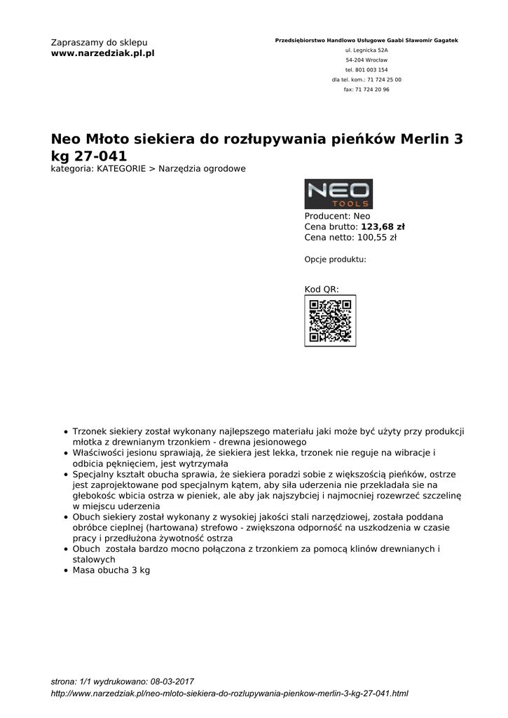 Zapraszamy do sklepu www.narzedziak.pl.pl Przedsiębiorstwo Handlowo Usługowe Gaabi Sławomir Gagatek ul. Legnicka 52A 54-204 Wrocław tel. 801 003 154 dla tel. kom.: 71 724 25 00 fax: 71 724 20 96 Neo Młoto siekiera do rozłupywania pieńków Merlin 3 kg 27-041 kategoria: KATEGORIE > Narzędzia ogrodowe Producent: Neo Cena brutto: 123,68 zł Cena netto: 100,55 zł Opcje produktu: Kod QR: Trzonek siekiery został wykonany najlepszego materiału jaki może być użyty przy produkcji młotka z drewnianym trzonkiem - drewna jesionowego Właściwości jesionu sprawiają, że siekiera jest lekka, trzonek nie reguje na wibracje i odbicia pęknięciem, jest wytrzymała Specjalny kształt obucha sprawia, że siekiera poradzi sobie z większością pieńków, ostrze jest zaprojektowane pod specjalnym kątem, aby siła uderzenia nie przekladała sie na głebokośc wbicia ostrza w pieniek, ale aby jak najszybciej i najmocniej rozewrzeć szczelinę w miejscu uderzenia Obuch siekiery został wykonany z wysokiej jakości stali narzędziowej, została poddana obróbce cieplnej (hartowana) strefowo - zwiększona odporność na uszkodzenia w czasie pracy i przedłużona żywotność ostrza Obuch została bardzo mocno połączona z trzonkiem za pomocą klinów drewnianych i stalowych Masa obucha 3 kg strona: 1/1 wydrukowano: 08-03-2017 http://www.narzedziak.pl/neo-mloto-siekiera-do-rozlupywania-pienkow-merlin-3-kg-27-041.html