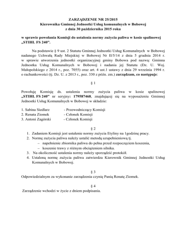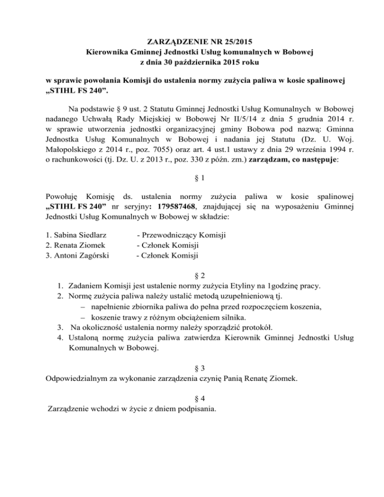 ZARZĄDZENIE NR 25/2015 Kierownika Gminnej Jednostki Usług komunalnych w Bobowej z dnia 30 października 2015 roku w sprawie powołania Komisji do ustalenia normy zużycia paliwa w kosie spalinowej „STIHL FS 240”. Na podstawie § 9 ust. 2 Statutu Gminnej Jednostki Usług Komunalnych w Bobowej nadanego Uchwałą Rady Miejskiej w Bobowej Nr II/5/14 z dnia 5 grudnia 2014 r. w sprawie utworzenia jednostki organizacyjnej gminy Bobowa pod nazwą: Gminna Jednostka Usług Komunalnych w Bobowej i nadania jej Statutu (Dz. U. Woj. Małopolskiego z 2014 r., poz. 7055) oraz art. 4 ust.1 ustawy z dnia 29 września 1994 r. o rachunkowości (tj. Dz. U. z 2013 r., poz. 330 z późn. zm.) zarządzam, co następuje: §1 Powołuję Komisję ds. ustalenia normy zużycia paliwa w kosie spalinowej „STIHL FS 240” nr seryjny: 179587468, znajdującej się na wyposażeniu Gminnej Jednostki Usług Komunalnych w Bobowej w składzie: 1. Sabina Siedlarz 2. Renata Ziomek 3. Antoni Zagórski 1. 2. 3. 4. - Przewodniczący Komisji - Członek Komisji - Członek Komisji §2 Zadaniem Komisji jest ustalenie normy zużycia Etyliny na 1godzinę pracy. Normę zużycia paliwa należy ustalić metodą uzupełnieniową tj. napełnienie zbiornika paliwa do pełna przed rozpoczęciem koszenia, koszenie trawy z różnym obciążeniem silnika. Na okoliczność ustalenia normy należy sporządzić protokół. Ustaloną normę zużycia paliwa zatwierdza Kierownik Gminnej Jednostki Usług Komunalnych w Bobowej. §3 Odpowiedzialnym za wykonanie zarządzenia czynię Panią Renatę Ziomek. §4 Zarządzenie wchodzi w życie z dniem podpisania.