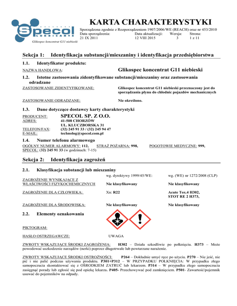 KARTA CHARAKTERYSTYKI Sporządzona zgodnie z Rozporządzeniem 1907/2006/WE (REACH) oraz nr 453/2010 Data sporządzenia: Data aktualizacji: Wersja: Strona: 21 IX 2011 12 VIII 2015 3 1 z 11 Glikospec koncentrat G11 niebieski Sekcja 1: 1.1. Identyfikacja substancji/mieszaniny i identyfikacja przedsiębiorstwa Identyfikator produktu: Glikospec koncentrat G11 niebieski NAZWA HANDLOWA: 1.2. Istotne zastosowania zidentyfikowane substancji/mieszaniny oraz zastosowania odradzane ZASTOSOWANIE ZIDENTYFIKOWANE: Glikospec koncentrat G11 niebieski przeznaczony jest do sporządzania płynu do chłodnic pojazdów mechanicznych ZASTOSOWANIE ODRADZANE: Nie określono. 1.3. Dane dotyczące dostawcy karty charakterystyki PRODUCENT: ADRES: TELEFON/FAX: E-MAIL: 1.4. SPECOL SP. Z O.O. 41-508 CHORZÓW UL. KLUCZBORSKA 31 (32) 245 91 33 / (32) 245 94 47 [email protected] Numer telefonu alarmowego OGÓLNY NUMER ALARMOWY: 112, STRAŻ POŻARNA: 998, SPECOL: (32) 245 91 33 (w godzinach: 7-15) Sekcja 2: 2.1. POGOTOWIE MEDYCZNE: 999, Identyfikacja zagrożeń Klasyfikacja substancji lub mieszaniny wg. dyrektywy 1999/45/WE: wg. (WE) nr 1272/2008 (CLP) ZAGROŻENIE WYNIKAJĄCE Z WŁAŚCIWOŚCI FIZYKOCHEMICZNYCH Nie klasyfikowany Nie klasyfikowany ZAGROŻENIE DLA CZŁOWIEKA: Xn: R22 Acute Tox.4 H302, STOT RE 2 H373, ZAGROŻENIE DLA ŚRODOWISKA: Nie klasyfikowany Nie klasyfikowany 2.2. Elementy oznakowania PIKTOGRAM: HASŁO OSTRZEGAWCZE: UWAGA ZWROTY WSKAZUJĄCE ŚRODKI ZAGROŻENIA: H302 – Działa szkodliwie po połknięciu. H373 – Może powodować uszkodzenie narządów (nerki) poprzez długotrwałe lub powtarzane narażenie. ZWROTY WSKAZUJĄCE ŚRODKI OSTROŻNOŚCI: P264 – Dokładnie umyć ręce po użyciu. P270 – Nie jeść, nie pić i nie palić podczas używania produktu. P301+P312 – W PRZYPADKU POŁKNIĘCIA: W przypadku złego samopoczucia skontaktować się z OŚRODKIEM ZATRUĆ lub lekarzem. P314 – W przypadku złego samopoczucia zasięgnąć porady lub zgłosić się pod opiekę lekarza. P405- Przechowywać pod zamknięciem. P501- Zawartość/pojemnik usuwać do pojemników na odpady. KARTA CHARAKTERYSTYKI Sporządzona zgodnie z Rozporządzeniem 1907/2006/WE (REACH) oraz nr 453/2010 Data sporządzenia: Data aktualizacji: Wersja: Strona: 21 IX 2011 12 VIII 2015 3 2 z 11 Glikospec koncentrat G11 niebieski Uwaga: Zawiera glikol etylenowy. 2.3. Inne zagrożenia Substancja nie spełnia kryteriów PBT lub vPvB zgodnie z załącznikiem XIII Długotrwałe narażenie lub wysokie stężenia par lub mgły mogą powodować słabe podrażnienie dróg oddechowych oraz bóle głowy i zawroty głowy, nudności, wymioty, senność, zaburzenia ze strony ośrodkowego układu nerwowego, mimowolny ruch oczu, śpiączkę. Kontakt ze skórą powoduje słabe podrażnienie skóry. Zanieczyszczenie oczu w warunkach przedłużającego się kontaktu powoduje umiarkowane podrażnienie oczu. Sekcja 3: 3.1. Skład/informacje o składnikach Substancje Nie dotyczy 3.2. Mieszaniny Niebezpieczne składniki, zakresy ich stężeń w mieszaninie: NAZWA: ZAKRES STĘŻEŃ: NUMER CAS: NUMER WE: NR. REJESTRACYJNY: KLASYFIKACJA WG. 67/548/EWG: KLASYFIKACJA WG. 1272/2008/WE: Glikol monoetylenowy ok. 90-96% 107-21-1 203-473-3 01-2119456816-XXXX Xn: R22 Acute Tox. 4: H302, STOT RE. 2: H373 NAZWA: ZAKRES STĘŻEŃ: NUMER CAS: NUMER WE: KLASYFIKACJA WG. 67/548/EWG: KLASYFIKACJA WG. 1272/2008/WE: 2-etyloheksanian sodu 0,105 – 2,80% 19766-89-3 243-283-8 Repro. Kat.3 R63 Repr. 2 H361d NAZWA: ZAKRES STĘŻEŃ: NUMER CAS: NUMER WE: KLASYFIKACJA WG. 67/548/EWG: KLASYFIKACJA WG. 1272/2008/WE: 1,2,3-benzotriazol 0,07-0,21% 95-14-7 202-394-1 Xn: R20/22, R37-41, R52 Acute Tox. 4 H332, Acute Tox. 4 H302, Eye Irrit. 2 H319, STOT SE 3 H335, Sekcja 4: 4.1. Środki pierwszej pomocy Opis środków pierwszej pomocy WDYCHANIE: W przypadku narażenia drogą oddechową przenieść/wyprowadzić poszkodowanego ze skażonego rejonu na świeże powietrze, co w większości przypadków powinno być działaniem wystarczającym. W razie wystąpienia trudności z oddychaniem podawać tlen, w przypadku zatrzymania oddechu stosować sztuczne oddychanie. W przypadku utrzymywania się dolegliwości ze strony układu oddechowego zapewnić pomoc lekarską. KONTAKT Z OCZAMI: Zanieczyszczone oczy płukać, przy szeroko rozwartych powiekach, ciągłym strumieniem wody przez około 15 min. Skonsultować się z lekarzem okulistą. KONTAKT ZE SKÓRĄ: Zanieczyszczoną skórę spłukać dokładnie dużą ilością wody. Zdjąć zanieczyszczoną odzież. KARTA CHARAKTERYSTYKI Sporządzona zgodnie z Rozporządzeniem 1907/2006/WE (REACH) oraz nr 453/2010 Data sporządzenia: Data aktualizacji: Wersja: Strona: 21 IX 2011 12 VIII 2015 3 3 z 11 Glikospec koncentrat G11 niebieski POŁKNIĘCIE: Natychmiast wypłukać usta wodą i następnie wypić 200 – 300 ml wody, natychmiast wezwać pomoc lekarską. Skutkiem długotrwałego lub powtarzanego narażenia droga pokarmową może dojść do uszkodzenia nerek. INNE INFORMACJE: W przypadku udzielania pierwszej pomocy w warunkach narażenia na wysokie stężenia substancji zapewnić uczestnikom akcji ratunkowej odpowiednie środki ochrony dróg oddechowych. W przypadku utraty przytomności ułożyć poszkodowanego w pozycji bocznej ustalonej, kontrolować i utrzymywać drożność dróg oddechowych. 4.2. Najważniejsze ostre i opóźnione objawy oraz skutki narażenia W pierwszym okresie zatrucia po połknięciu występują objawy podobne do stanu upojenia alkoholowego: stan pobudzenia, zaburzenia mowy, zaburzenia równowagi i koordynacji ruchów, bóle i zawroty głowy, senność itp.; następnie występują nudności i wymioty, biegunka; mogą wystąpić zaburzenia oddychania; w przypadku ciężkich zatruć zaburzenia krążenia, przyspieszenie akcji serca, spadek ciśnienia krwi, śpiączka, utrata przytomności z drgawkami, zapaść; możliwa śmierć z powodu zatrzymania oddychania. Dawka śmiertelna dla człowieka wynosi ok. 100 ml Kontakt ze skó