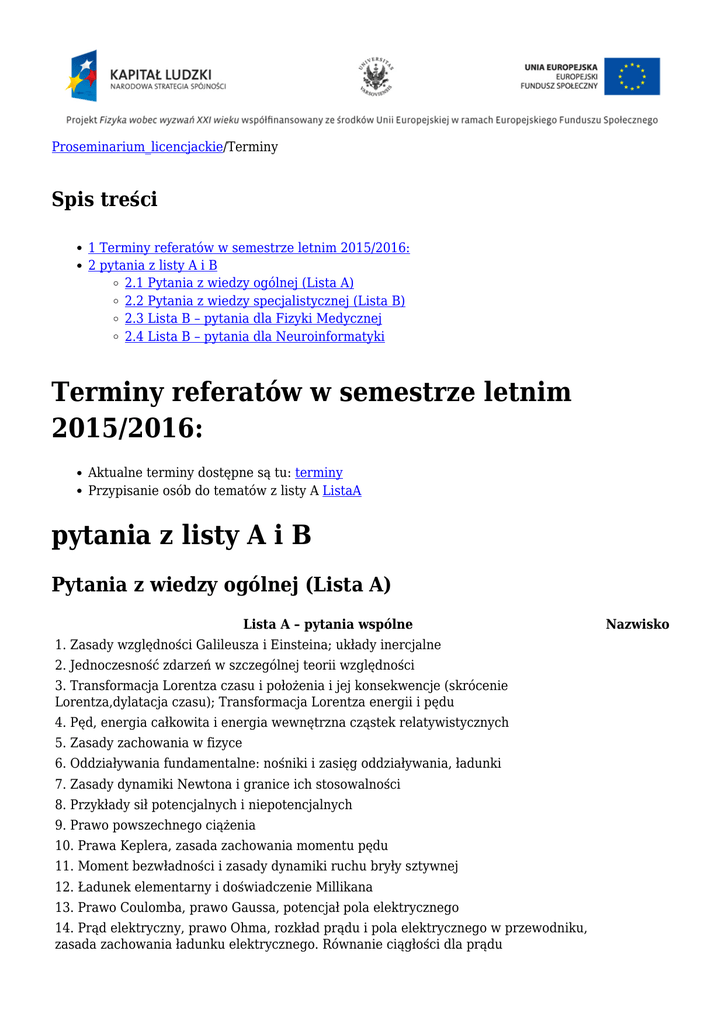 Proseminarium_licencjackie/Terminy Spis treści 1 Terminy referatów w semestrze letnim 2015/2016: 2 pytania z listy A i B 2.1 Pytania z wiedzy ogólnej (Lista A) 2.2 Pytania z wiedzy specjalistycznej (Lista B) 2.3 Lista B – pytania dla Fizyki Medycznej 2.4 Lista B – pytania dla Neuroinformatyki Terminy referatów w semestrze letnim 2015/2016: Aktualne terminy dostępne są tu: terminy Przypisanie osób do tematów z listy A ListaA pytania z listy A i B Pytania z wiedzy ogólnej (Lista A) Lista A – pytania wspólne 1. Zasady względności Galileusza i Einsteina; układy inercjalne 2. Jednoczesność zdarzeń w szczególnej teorii względności 3. Transformacja Lorentza czasu i położenia i jej konsekwencje (skrócenie Lorentza,dylatacja czasu); Transformacja Lorentza energii i pędu 4. Pęd, energia całkowita i energia wewnętrzna cząstek relatywistycznych 5. Zasady zachowania w fizyce 6. Oddziaływania fundamentalne: nośniki i zasięg oddziaływania, ładunki 7. Zasady dynamiki Newtona i granice ich stosowalności 8. Przykłady sił potencjalnych i niepotencjalnych 9. Prawo powszechnego ciążenia 10. Prawa Keplera, zasada zachowania momentu pędu 11. Moment bezwładności i zasady dynamiki ruchu bryły sztywnej 12. Ładunek elementarny i doświadczenie Millikana 13. Prawo Coulomba, prawo Gaussa, potencjał pola elektrycznego 14. Prąd elektryczny, prawo Ohma, rozkład prądu i pola elektrycznego w przewodniku, zasada zachowania ładunku elektrycznego. Równanie ciągłości dla prądu Nazwisko 15. Metale, półprzewodniki 16. Obwody elektryczne: prawo Ohma i prawa Kirchhoffa 17. Pole magnetyczne prądu stałego, prawo Biota-Savarta 18. Siła Lorentza i ruch cząstek naładowanych w polach elektrycznym i magnetycznym 19. Wyznaczanie stosunku e/m, spektroskop masowy i wyznaczanie mas atomów (izotopów) 20. Prawo indukcji Faradaya i reguła Lenza 21. Obwody LC i RLC: drgania, drgania tłumione i wymuszone oraz zjawisko rezonansu 22. Równania Maxwella 23. Fale elektromagnetyczne jako rozwiązanie równania Maxwella 24. Prawa odbicia i załamania fal elektromagnetycznych; współczynnik odbicia, polaryzacja fali odbitej i załamanej (kąt Brewstera) 25. Ruch okresowy (parametry); rozkład na drgania proste (analiza Fouriera) 26. Oscylator harmoniczny: drgania swobodne, tłumione i wymuszone oraz zjawisko rezonansu 27. Rozkład drgań układów o wielu stopniach swobody (np. układu punktów materialnych połączonych sprężynami) na drgania własne 28. Prawa odbicia i załamania fal na granicy ośrodków 29. Zjawisko Dopplera dla różnych rodzajów fal (akustycznych i elektromagnetycznych w próżni) 30. Spójność, dyfrakcja i interferencja fal: dyfrakcja na pojedynczej szczelinie, doświadczenie Younga, siatka dyfrakcyjna 31. Równowaga termiczna i temperatura; skale temperatury 32. Ciepło, procesy wymiany ciepła 33. Promieniowanie cieplne ciał: współczynniki absorpcji i emisji promieniowania, ciało doskonale czarne, prawo przesunięć Wiena, prawo Stefana-Boltzmanna 34. Równanie stanu gazu doskonałego, przemiany gazowe, molowe ciepła właściwe gazów Pytania z wiedzy specjalistycznej (Lista B) Lista B – pytania wspólne 1. Sumy kontrolne – znaczenie i wykorzystanie 2. Protokoły TCP/IP i HTTP 3. Rola systemu operacyjnego komputera, kompatybilność, wirtualizacja i sterowniki urządzeń 4. Kompresja stratna i bezstratna 5. Grafika rastrowa i wektorowa 6. Instrukcje sterujące w języku Python 7. Podstawowe struktury danych w języku Python 8. Estymacja widma mocy sygnałów 9. Próbkowanie i aliasing Nazwisko 10. Gęstość energii sygnałów w przestrzeni czas-częstość 11. Widmo mocy sygnałów okresowych a szereg Fouriera 12. System liniowy niezmienniczy w czasie - definicja i własności 13. Model autoregresyjny - definicja i zastosowanie w analizie sygnałów 14. Test t Studenta 15. Centralne Twierdzenie Graniczne 16. Statystyki i estymatory (np. zgodny i nieobciążony estymator wariancji) 17. Testy permutacyjne 18. Omów schemat weryfikacji hipotez statystycznych na przykładzie wybranego testu 19. Poziom istotności testu 20. Test serii jako przykład testu nieparametrycznego 21. Jakie zjawiska fizyczne biorą udział w procesie tworzenia obrazu diagnostycznego w rentgenowskiej tomografii komputerowej? 22. Jakie zjawiska fizyczne biorą udział w procesie tworzenia obrazu diagnostycznego w pozytonowej tomografii emisyjnej (PET) oraz tomografii emisyjnej pojedynczego fotonu? 23. Podstawy zjawiska magnetycznego rezonansu jądrowego. Jak to zjawisko wykorzystywane jest w tworzeniu obrazu diagnostycznego 24. Jaki wpływ na tworzenie obrazu diagnostycznego mają rozpraszanie Comptona oraz efekt fotoelektryczny? 25. Budowa i działanie lampy rentgenowskiej 26. Podstawy fizyczne obrazowania ultrasonograficznego 27. Wykorzystanie laserów w obrazowaniu medycznym 28. Rodzaje tkanek i ich funkcje 29. Budowa komórki zwierzęcej 30. Funkcje organelli komórkowych komórki zwierzęcej 31. Rodzaje praw autorskich i zasady ich przenoszenia 32. Zasady ochrony danych osobowych i prawa osoby, której dotyczą dane osobowe Lista B – pytania dla Fizyki Medycznej Lista B – pytania dla Fizyki Medycznej 33. Prawo rozpadu promieniotwórczego 34. Widmo ciągłe i promieniowanie charakterystyczne w promieniowaniu rentgenowskim 35. Konsekwencje diagnostyczno terapeutyczne osłabienia wiązek promieniowania X i gamma 36. Warunki energetyczne rozpadów promieniotwórczych na przykładzie rozpadów beta 37. Wytwarzanie izotopów promieniotwórczych 38. Skutki biologiczne promieniowania jonizującego 39. Dawka pochłonięta, dawka równoważna i dawka skuteczna 40. Detektory promieniowania jonizującego, klasyfikacja i zastosowanie w dozymetrii Nazwisko Lista B – pytania dla Neuroinformatyki Lista B – pytania dla Neuroinformatyki 41. Podstawowe architektury sieci neuronowych 42. Podstawowe metody uczenia sieci neuronowych 43. Generalizacja wiedzy w sieciach neuronowych 