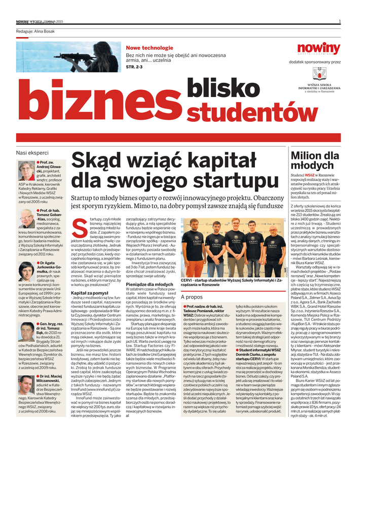 1 NOWINY MAJA 2015 Wtorek,WTOREK, 12 maja122015 Redaguje: Alina Bosak Nowe technologie Bez nich nie może się obejść ani nowoczesna armia, ani... uczelnia dodatek sponsorowany przez STR. 2-3 biznes A Prof. zw. Andrzej Głowacki, projektant, grafik, architekt wnętrz, profesor ASP w Krakowie, kierownik Katedry Reklamy, Grafiki i Nowych Mediów WSIiZ w Rzeszowie, z uczelnią związany od 2005 roku A Prof. dr hab. Tomasz Goban-Klas, socjolog, medioznawca, specjalista z zakresu teorii komunikowania, komunikowania społecznego, teorii i badania mediów, z Wyższą Szkołą Informatyki i Zarządzania w Rzeszowie związany od 2011 roku. A Dr Agata Jurkowska-Gomułka, dr nauk prawnych, specjalizuje się w prawie konkurencji i konsumentów oraz prawie Unii Europejskiej, od 1999 r. pracuje w Wyższej Szkole Informatyki i Zarządzania w Rzeszowie, obecnie jest kierownikiem Katedry Prawa Administracyjnego. A Gen. bryg. rez. dr inż. Tomasz Bąk, do 2010 roku dowódca 21. Brygady Strzelców Podhalańskich, adiunkt w Katedrze Bezpieczeństwa Wewnętrznego, Dyrektor ds. bezpieczeństwa WSIiZ w Rzeszowie, związany z uczelnią od 2009 roku. A Dr inż. Maciej Milczanowski, adiunkt w Katedrze Bezpieczeństwa Wewnętrznego, Kierownik Katedry Bezpieczeństwa Wewnętrznego WSIiZ, związany z uczelnią od 2008 roku. Milion dla młodych Skąd wziąć kapitał dla swojego startupu Studenci WSIiZ w Rzeszowie rozpoczęli realizację staży i warsztatów podnoszących ich atrakcyjność na rynku pracy. Uczelnia pozyskała na ten cel ponad milion złotych. Startup to młody biznes oparty o rozwój innowacyjnego projektu. Obarczony jest sporym ryzykiem. Mimo to, na dobry pomysł zawsze znajdą się fundusze tartupy, czyli młode biznesy, najczęściej prowadzą młodzi ludzie. Z zapałem poświęcają swoim projektom każdą wolną chwilę i zaoszczędzoną złotówkę. Jednak w większości takich przedsięwzięć przychodzi czas, kiedy oszczędności topnieją,a zespół liderów zastanawia się, w jaki sposób kontynuować prace, by zrealizować marzenia o dużym biznesie. Skąd wziąć pieniądze na biznes, o którym marzysz, by w końcu go zrealizować? S Kapitał za pomysł - Jedną z możliwości są tzw. fundusze seed capital, nazywane również funduszami kapitału zalążkowego - podpowiada dr Marta Czyżewska,dyrektor Centrum Innowacji i Przedsiębiorczości Wyższej Szkoły Informatyki i Zarządzania w Rzeszowie. - Są one przeznaczone dla osób, które mają ciekawe, wyróżniające się od innych i rokujące duże zyski pomysły na biznes. Jeśli nie prowadziłeś jeszcze biznesu, nie masz tzw. historii kredytowej, zatem banki nie będą chętne,aby udzielić ci pożyczki. Zrobią to jednak fundusze seed capital, które zaakceptują wyższe ryzyko i nie będą żądać żadnych zabezpieczeń.Jednym z takich funduszy - nazwanym InnoFund (www.innofund.pl) zarządza WSIiZ. InnoFund może zainwestować w pomysł na biznes kapitał nie większy niż 200 tys.euro,stając się mniejszościowym wspólnikiem przedsięwzięcia. Ty jako zarządzający zatrzymasz decydujący głos, a rolą specjalistów funduszu będzie wspieranie cię w rozwijaniu wspólnego biznesu. - Fundusz nie ingeruje w bieżące zarządzanie spółką - zapewnia Wojciech Pitura z InnoFund.-Autor pomysłu posiada swobodę w działaniach w ramach ustalonego z funduszem planu. Inwestycja trwa zazwyczaj od 3 do 7 lat, potem fundusz będzie chciał zrealizować zyski, sprzedając swoje udziały. Pieniądze dla młodych W ostatnim czasie w Polsce powstało wiele funduszy seed capital, które kapitał na inwestycje posiadają ze środków unijnych. Wyróżnia je to, że oferują dużą pomoc doradczą m.in. z finansów, prawa, marketingu, biznesplanu i analiz finansowych. Startupy planujące ekspansję na Europę lub inne kraje świata mogą poszukiwać kapitału na swój biznes także w innych krajach UE.Warto zwrócić uwagę na tzw. Startup Factories czy FIWARE.Wnadchodzącychkilkulatach ze środków Unii Europejskiej także będzie wiele możliwości finansowania dla nowych ciekawych biznesów. W Programie Operacyjnym Polska Wschodnia zaplanowano działanie „Platformy startowe dla nowych pomysłów”,w ramach którego wspierane będzie powstawanie i rozwój startupów. Będzie to znakomita szansa dla młodych, przedsiębiorczych osób na pomoc doradczą i kapitałową w rozwijaniu innowacyjnych biznesów. al FOT.WSIIZ Nasi eksperci blisko studentów CERVI - startup studentów Wyższej Szkoły Informatyki i Zarządzania w Rzeszowie A propos A Prof.nadzw.dr hab.inż. Tadeusz Pomianek,rektor WSIiZ: Dobrze wykształcić studentów i przygotować ich do spełnienia ambicji zawodowych może kadra,która ma osiągnięcia naukowe i skutecznie współpracuje z biznesem. Tylko wówczas może przekazać odpowiedniej jakości wiedzę merytoryczną i kształcić praktycznie.Z tych względów od wielu lat dbamy,żeby nauczyciele akademiccy byli aktywni w obu sferach.Przychody komercyjne z usług świadczonych na rzecz gospodarki (biznesu) sytuują nas w ścisłej czołówce polskich uczelni i są zdecydowanie najwyższe spośród uczelni niepublicznych.Jeśli dodać przychody z działalności naukowej i projektowej,to razem są większe niż przychody dydaktyczne.To się udało tylko kilku polskim szkołom wyższym.W rezultacie nasza kadra ma odpowiednie kompetencje w procesie kształcenia , a studenci osiągają bardzo wiele sukcesów,jakże często międzynarodowych.Ważnym efektem takiej strategii jest odporność na niż demograficzny i możliwość stałego rozwoju. A Student informatykiWSIiZ Dominik Ciurko,z zespołu startupu CERVI: Wstartupie najważniejszyjestzespół-toon stoizarealizacjąprojektu,który masięprzerodzićwdochodowy biznes.Odludzizależy,czyprojektudasięzrealizowaćitowłaśniewteamswojepieniądze wkładająinwestorzy.Ważniejsze odpieniędzysąkontaktyzpotencjalnymiklientamiorazkanałysprzedaży.Finansowanienatomiastpomagasz