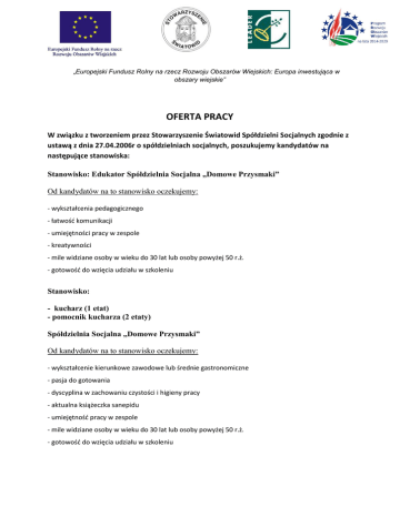 „Europejski Fundusz Rolny na rzecz Rozwoju Obszarów Wiejskich: Europa inwestująca w obszary wiejskie” OFERTA PRACY W związku z tworzeniem przez Stowarzyszenie Światowid Spółdzielni Socjalnych zgodnie z ustawą z dnia 27.04.2006r o spółdzielniach socjalnych, poszukujemy kandydatów na następujące stanowiska: Stanowisko: Edukator Spółdzielnia Socjalna „Domowe Przysmaki” Od kandydatów na to stanowisko oczekujemy: - wykształcenia pedagogicznego - łatwośd komunikacji - umiejętności pracy w zespole - kreatywności - mile widziane osoby w wieku do 30 lat lub osoby powyżej 50 r.ż. - gotowośd do wzięcia udziału w szkoleniu Stanowisko: - kucharz (1 etat) - pomocnik kucharza (2 etaty) Spółdzielnia Socjalna „Domowe Przysmaki” Od kandydatów na to stanowisko oczekujemy: - wykształcenie kierunkowe zawodowe lub średnie gastronomiczne - pasja do gotowania - dyscyplina w zachowaniu czystości i higieny pracy - aktualna książeczka sanepidu - umiejętnośd pracy w zespole - mile widziane osoby w wieku do 30 lat lub osoby powyżej 50 r.ż. - gotowośd do wzięcia udziału w szkoleniu „Europejski Fundusz Rolny na rzecz Rozwoju Obszarów Wiejskich: Europa inwestująca w obszary wiejskie” Stanowisko: - opiekun (3 etaty) - pomocnik opiekuna (1 etat) - pracownik fizyczny (2 etaty) Spółdzielnia Socjalna „Pomocnik od zaraz” Od kandydatów na to stanowisko oczekujemy: - predyspozycji osobistych (np. kreatywnośd, odpowiedzialnośd, łagodne usposobienie) - sumienności -umiejętności pracy pod presją w różnych warunkach - prawo jazdy - mile widziane osoby w wieku do 30 lat lub osoby powyżej 50 r.ż. - gotowośd do wzięcia udziału w szkoleniu Stanowisko: - edukator dzieci i seniorów (4 etaty) - psycholog (1 etat) Spółdzielnia Socjalna „Razem być” Od kandydatów na to stanowisko oczekujemy: - wykształcenie pedagogiczne, socjalne lub psychologiczne - umiejętnośd pracy z dziedmi i osobami starszymi - cierpliwośd - wyrozumiałośd - odpowiedzialnośd - Umiejętnośd szybkiego reagowania w sytuacjach kryzysowych - Odpowiednie podejście do podopiecznych - mile widziane osoby w wieku do 30 lat lub osoby powyżej 50 r.ż. - gotowośd do wzięcia udziału w szkoleniu „Europejski Fundusz Rolny na rzecz Rozwoju Obszarów Wiejskich: Europa inwestująca w obszary wiejskie” CV wraz z listem motywacyjnym i uzasadnianiem kandydowania na stanowisko proszę dostarczyć do Stowarzyszenia Światowid 1) mailowo na adres [email protected] 2) osobiście do biura stowarzyszenia mieszczące się w Małachowie Szemborowicach 12 62230 Witkowo W dokumentach aplikacyjnych prosimy zawrzeć sformułowanie: „Wyrażam zgodę na przetworzenie moich danych osobowych dla potrzeb procesu rekrutacji zgodnie z ustawą z dnia 29 sierpnia 1997 r. o ochronie danych osobowych (tekst jednolity: Dz. U. z 2002 r . Nr. 101., poz. 926. ze zmianami)”.