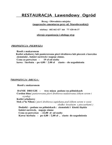 RESTAURACJA Lawendowy Ogród Brzeg - Obwodnica miejska (naprzeciw cmentarza przy ul. Starobrzeskiej) telefony: 602 662 427 lub 77/ 420-46-37 oferuje organizację i obsługę styp PROPOZYCJA PIERWSZA Rosół z makaronem Kotlet schabowy lub panierowana pierś drobiowa lub pieczeń z karczku ziemniaki , bukiet surówek i napoje zimne. Cena za powyższe 19 zł od osoby kawa / herbata - po 4,00 / 2.00 zł ciasto – do uzgodnienia PROPOZYCJA DRUGA ; Rosół z makaronem DANIE DRUGIE trzy mięsa podane na półmiskach Cordon blue( panierowana pierś drobiowa nadziewana żółtym serem i szynką) Kotlet schabowy Stek a”la Nilsen ( pierś drobiowa zapiekana pod żółtym serem w sosie słodko- kwaśnym z pieczarkami ) Dodatki – podane na półmiskach : ziemniaki i kluski śląskie bukiet surówek, napoje zimne Cena za powyższe - 22,00 zł od osoby Kawa/ herbata - po 4,00 / 2,00 zł , ciasto do uzgodnienia