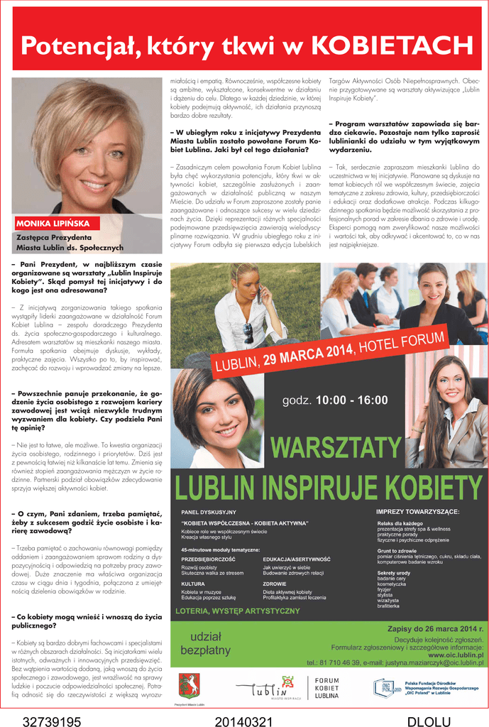 Potencjał, który tkwi w KOBIETACH miałością i empatią. Równocześnie, współczesne kobiety są ambitne, wykształcone, konsekwentne w działaniu i dążeniu do celu. Dlatego w każdej dziedzinie, w której kobiety podejmują aktywność, ich działania przynoszą bardzo dobre rezultaty. MONIKA LIPIŃSKA Zastępca Prezydenta Miasta Lublin ds. Społecznych Targów Aktywności Osób Niepełnosprawnych. Obecnie przygotowywane są warsztaty aktywizujące „Lublin Inspiruje Kobiety”. – W ubiegłym roku z inicjatywy Prezydenta Miasta Lublin zostało powołane Forum Kobiet Lublina. Jaki był cel tego działania? – Program warsztatów zapowiada się bardzo ciekawie. Pozostaje nam tylko zaprosić lublinianki do udziału w tym wyjątkowym wydarzeniu. – Zasadniczym celem powołania Forum Kobiet Lublina była chęć wykorzystania potencjału, który tkwi w aktywności kobiet, szczególnie zasłużonych i zaangażowanych w działalność publiczną w naszym Mieście. Do udziału w Forum zaproszone zostały panie zaangażowane i odnoszące sukcesy w wielu dziedzinach życia. Dzięki reprezentacji różnych specjalności podejmowane przedsięwzięcia zawierają wielodyscyplinarne rozwiązania. W grudniu ubiegłego roku z inicjatywy Forum odbyła się pierwsza edycja Lubelskich – Tak, serdecznie zapraszam mieszkanki Lublina do uczestnictwa w tej inicjatywie. Planowane są dyskusje na temat kobiecych ról we współczesnym świecie, zajęcia tematyczne z zakresu zdrowia, kultury, przedsiębiorczości i edukacji oraz dodatkowe atrakcje. Podczas kilkugodzinnego spotkania będzie możliwość skorzystania z profesjonalnych porad w zakresie dbania o zdrowie i urodę. Eksperci pomogą nam zweryfikować nasze możliwości i wartości tak, aby odkrywać i akcentować to, co w nas jest najpiękniejsze. – Pani Prezydent, w najbliższym czasie organizowane są warsztaty „Lublin Inspiruje Kobiety”. Skąd pomysł tej inicjatywy i do kogo jest ona adresowana? – Z inicjatywą zorganizowania takiego spotkania wystąpiły liderki zaangażowane w działalność Forum Kobiet Lublina – zespołu doradczego Prezydenta ds. życia społeczno-gospodarczego i kulturalnego. Adresatem warsztatów są mieszkanki naszego miasta. Formuła spotkania obejmuje dyskusje, wykłady, praktyczne zajęcia. Wszystko po to, by inspirować, zachęcać do rozwoju i wprowadzać zmiany na lepsze. – Powszechnie panuje przekonanie, że godzenie życia osobistego z rozwojem kariery zawodowej jest wciąż niezwykle trudnym wyzwaniem dla kobiety. Czy podziela Pani tę opinię? – Nie jest to łatwe, ale możliwe. To kwestia organizacji życia osobistego, rodzinnego i priorytetów. Dziś jest z pewnością łatwiej niż kilkanaście lat temu. Zmienia się również stopień zaangażowania mężczyzn w życie rodzinne. Partnerski podział obowiązków zdecydowanie sprzyja większej aktywności kobiet. – O czym, Pani zdaniem, trzeba pamiętać, żeby z sukcesem godzić życie osobiste i karierę zawodową? – Trzeba pamiętać o zachowaniu równowagi pomiędzy oddaniem i zaangażowaniem sprawom rodziny a dyspozycyjnością i odpowiedzią na potrzeby pracy zawodowej. Duże znaczenie ma właściwa organizacja czasu w ciągu dnia i tygodnia, połączona z umiejętnością dzielenia obowiązków w rodzinie. – Co kobiety mogą wnieść i wnoszą do życia publicznego? – Kobiety są bardzo dobrymi fachowcami i specjalistami w różnych obszarach działalności. Są inicjatorkami wielu istotnych, odważnych i innowacyjnych przedsięwzięć. Bez wątpienia wartością dodaną, jaką wnoszą do życia społecznego i zawodowego, jest wrażliwość na sprawy ludzkie i poczucie odpowiedzialności społecznej. Potrafią odnosić się do rzeczywistości z większą wyrozu- 32739195 20140321 DLOLU