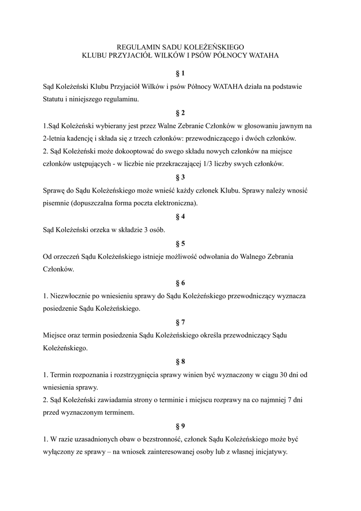 REGULAMIN SADU KOLEŻEŃSKIEGO KLUBU PRZYJACIÓŁ WILKÓW I PSÓW PÓŁNOCY WATAHA §1 Sąd Koleżeński Klubu Przyjaciół Wilków i psów Północy WATAHA działa na podstawie Statutu i niniejszego regulaminu. §2 1.Sąd Koleżeński wybierany jest przez Walne Zebranie Członków w głosowaniu jawnym na 2-letnia kadencję i składa się z trzech członków: przewodniczącego i dwóch członków. 2. Sąd Koleżeński może dokooptować do swego składu nowych członków na miejsce członków ustępujących - w liczbie nie przekraczającej 1/3 liczby swych członków. §3 Sprawę do Sądu Koleżeńskiego może wnieść każdy członek Klubu. Sprawy należy wnosić pisemnie (dopuszczalna forma poczta elektroniczna). §4 Sąd Koleżeński orzeka w składzie 3 osób. §5 Od orzeczeń Sądu Koleżeńskiego istnieje możliwość odwołania do Walnego Zebrania Członków. §6 1. Niezwłocznie po wniesieniu sprawy do Sądu Koleżeńskiego przewodniczący wyznacza posiedzenie Sądu Koleżeńskiego. §7 Miejsce oraz termin posiedzenia Sądu Koleżeńskiego określa przewodniczący Sądu Koleżeńskiego. §8 1. Termin rozpoznania i rozstrzygnięcia sprawy winien być wyznaczony w ciągu 30 dni od wniesienia sprawy. 2. Sąd Koleżeński zawiadamia strony o terminie i miejscu rozprawy na co najmniej 7 dni przed wyznaczonym terminem. §9 1. W razie uzasadnionych obaw o bezstronność, członek Sądu Koleżeńskiego może być wyłączony ze sprawy – na wniosek zainteresowanej osoby lub z własnej inicjatywy. 2. O wyłączeniu członka rozstrzygają pozostali członkowie Sądu Koleżeńskiego. Przewodniczący wyznacza innego członka Klubu do wzięcia udziału w rozpatrywaniu danej sprawy. § 10 1. Rozprawy Sądu Koleżeńskiego odbywają się ustnie i jawnie. 2. Sąd Koleżeński na życzenie stron może wyłączyć jawność całości lub części posiedzenia – rozprawy. § 11 Rozpatrywanie spraw odbywa się z zachowaniem następujących zasad: a) domniemania niewinności b) kontradyktoryjności (dwie przeciwstawne strony toczące spór) c) obiektywizmu (bezstronności) d) prawdy materialnej (zgodna ze stanem faktycznym) e) prawa do obrony. § 12 W imieniu strony może występować upoważniony przez nią przedstawiciel. § 13 1. Przewodniczący Sądu Koleżeńskiego prowadzi rozprawę. 2. Rozprawę rozpoczyna się od wywołania sprawy; następnie przewodniczący Sądu Koleżeńskiego sprawdza, czy osoby wezwane i zawiadomione o terminie rozprawy stawiły się oraz, czy nie ma przeszkód do rozpoznania sprawy. 3. Przewodniczący Sądu Koleżeńskiego czuwa nad jej prawidłowym i sprawnym przebiegiem zwracając uwagę, aby w toku rozprawy zostały wyjaśnione wszystkie okoliczności sprawy przemawiające zarówno na korzyść, jak i na niekorzyść obwinionego. 4. Z przebiegu rozprawy sporządza się zwięzły protokół podpisywany przez przewodniczącego. § 14 W razie nieusprawiedliwionego niestawiennictwa obwinionego, któremu doręczono wezwanie na rozprawę, można przeprowadzić rozprawę zaocznie. § 15 1. Rozpoczynając postępowanie dowodowe przewodniczący Sądu Koleżeńskiego zapoznaje obwinionego z treścią zarzucanego mu czynu. 2. Po upewnieniu się, że obwiniony zrozumiał treść zarzutu, przewodniczący zapytuje go, czy przyznaje się do winy i jakie chce złożyć wyjaśnienia. 3. Obwinionemu przysługuje prawo obecności przy wszystkich czynnościach postępowania dowodowego, zadawania pytań osobom przesłuchiwanym oraz składania wyjaśnień co do poszczególnych dowodów. 4. Świadków przesłuchuje się podczas nieobecności tych świadków, którzy jeszcze nie składali zeznań. 5. Przewodniczący Sądu Koleżeńskiego uchyla pytania, które uznaje za nieistotne w sprawie lub niedopuszczalne. 6. Po przeprowadzeniu postępowania dowodowego, przewodniczący Sądu Koleżeńskiego zamyka postępowanie dowodowe i udziela głosu stronom, a następnie zarządza przerwę celem odbycia narady i wydania orzeczenia. § 16 1. Sąd Koleżeński na podstawie zebranego materiału dowodowego rozstrzyga większością głosów w kwestii winy i kary. 2. Naradą i głosowaniem kieruje przewodniczący. 4. Rozstrzygnięcie podpisuje cały skład orzekający, nie wyłączając przegłosowanego, który podpisuje rozstrzygnięcie i ma prawo w terminie tygodnia złożyć na piśmie zdanie odrębne. § 17 Sąd Koleżeński może stosować następując kary organizacyjne: 1) upomnienia, 2) nagany, 3) okresowe pozbawienie praw reprezentowania Klubu 4) okresowe pozbawienie praw członkowskich 4) wykluczenia z grona członków Klubu. § 18 Sąd Koleżeński wydaje orzeczenie: 1) o ukaraniu, 2) o odstąpieniu od wymierzenia kary, 3) o uniewinnieniu, 4) o umorzeniu postępowania § 19 Przewodniczący Sądu Koleżeńskiego w każdym stadium sprawy może wyznaczyć posiedzenie pojednawcze, jeśli przemawia za tym charakter sprawy oraz przyczyni się to do jej polubownego zakończenia odpowiadającego zasadom współżycia społecznego. § 20 Orzeczenie o ukaraniu powinno zawierać: 1) imiona i nazwiska osób orzekających w sprawie, 2) datę i miejsce wydania orzeczenia, 3) imię i nazwisko oraz adres obwinionego, 4) określenie czynu zarzucanego obwinionemu oraz wskazanie naruszonego przepisu statutu, regulaminu lub uchwał władz Klubu, 5) decyzję co do kary, 6) pouczenie o trybie i terminie zaskarżenia orzeczenia, 7) uzasadnienie. § 21 1. Orzeczenie ogłasza się bezpośrednio po zakończeniu narady. 2. Jeżeli obwiniony po złożeniu wyjaśnień samowolnie opuścił miejsce rozprawy przed jej zakończeniem, orzeczenie ogłasza się także, gdy na Sali nie ma osób uprawnionych do wniesienia odwołania. § 22 Odwołanie winno zawierać: 1) oznaczenie orzeczenia, od którego jest wnoszone, 2) zwięzłe przedstawienie zarzutów, 3) uzasadnienie zarzutów, 4) wniosek o zmianę, o uchylenie orzeczenia z zaznaczeniem zakresu żądanej zmiany lub uchylenia lub przekazanie sprawy do ponownego rozpoznania