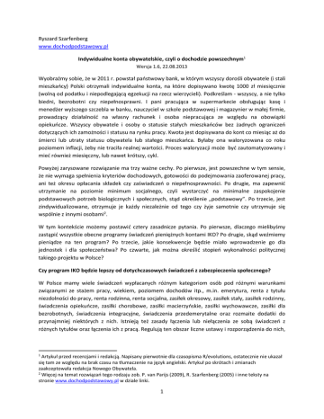 Ryszard Szarfenberg www.dochodpodstawowy.pl Indywidualne konta obywatelskie, czyli o dochodzie powszechnym1 Wersja 1.6, 22.08.2013 Wyobraźmy sobie, że w 2011 r. powstał państwowy bank, w którym wszyscy dorośli obywatele (i stali mieszkańcy) Polski otrzymali indywidualne konta, na które dopisywano kwotę 1000 zł miesięcznie (wolną od podatku i niepodlegającą egzekucji na rzecz wierzycieli). Podkreślam - wszyscy, a nie tylko biedni, bezrobotni czy niepełnosprawni. I pani pracująca w supermarkecie obsługując kasę i menedżer wyższego szczebla w banku, nauczyciel w szkole podstawowej i magazynier w małej firmie, prowadzący działalność na własny rachunek i osoba niepracująca ze względu na obowiązki opiekuńcze. Wszyscy obywatele i osoby o statusie stałych mieszkańców bez żadnych ograniczeń dotyczących ich zamożności i statusu na rynku pracy. Kwota jest dopisywana do kont co miesiąc aż do śmierci lub utraty statusu obywatela lub stałego mieszkańca. Byłaby ona waloryzowana co roku poziomem inflacji, żeby nie traciła realnej wartości. Proces waloryzacji może być zautomatyzowany i mieć również miesięczny, lub nawet krótszy, cykl. Powyżej zarysowane rozwiązanie ma trzy ważne cechy. Po pierwsze, jest powszechne w tym sensie, że nie wymaga spełnienia kryteriów dochodowych, gotowości do podejmowania zaoferowanej pracy, ani też okresu opłacania składek czy zaświadczeń o niepełnosprawności. Po drugie, ma zapewnić utrzymanie na poziomie minimum socjalnego, czyli wystarczyć na minimalne zaspokojenie podstawowych potrzeb biologicznych i społecznych, stąd określenie „podstawowy”. Po trzecie, jest zindywidualizowane, otrzymuje je każdy niezależnie od tego czy żyje samotnie czy utrzymuje się wspólnie z innymi osobami2. W tym kontekście możemy postawić cztery zasadnicze pytania. Po pierwsze, dlaczego mielibyśmy zastąpić wszystkie obecne programy świadczeń pieniężnych kontami IKO? Po drugie, skąd weźmiemy pieniądze na ten program? Po trzecie, jakie konsekwencje będzie miało wprowadzenie go dla jednostek i dla społeczeństwa? Po czwarte, jak można określić stopień wykonalności politycznej takiego projektu w Polsce? Czy program IKO będzie lepszy od dotychczasowych świadczeń z zabezpieczenia społecznego? W Polsce mamy wiele świadczeń wypłacanych różnym kategoriom osób pod różnymi warunkami związanymi ze stażem pracy, wiekiem, poziomem dochodów itp., m.in. emerytura, renta z tytułu niezdolności do pracy, renta rodzinna, renta socjalna, zasiłek okresowy, zasiłek stały, zasiłek rodzinny, świadczenia opiekuńcze, zasiłki chorobowe, zasiłki macierzyńskie, zasiłki wychowawcze, zasiłki dla bezrobotnych, świadczenia integracyjne, świadczenia przedemerytalne oraz rozmaite dodatki do przynajmniej niektórych z nich. Istnieją też zasady łączenia lub niełączenia ze sobą świadczeń z różnych tytułów oraz łączenia ich z pracą. Regulują ten obszar liczne ustawy i rozporządzenia do nich, 1 Artykuł przed recenzjami i redakcją. Napisany pierwotnie dla czasopisma R/evolutions, ostatecznie nie ukazał się tam ze względu na brak czasu na tłumaczenie na język angielski. Artykuł po skrótach i zmianach zaakceptowała redakcja Nowego Obywatela. 2 Więcej na temat rozwiązań tego rodzaju zob. P. van Parijs (2009), R. Szarfenberg (2005) i inne teksty na stronie www.dochodpodstawowy.pl w dziale linki. 1 do ich realizacji powołano jednostki organizacyjne administracji publicznej, w których zatrudnionych są co najmniej dziesiątki tysięcy ludzi. Pierwsza i najbardziej oczywista zaleta programu IKO jest taka, że bardzo złożony system świadczeń pieniężnych staje się bardzo prosty. Nawet jeżeli niektóre świadczenia pieniężne zostałby z nami, albo do IKO przysługiwałyby dodatki z różnych tytułów, można przewidywać, że byłoby to coś prostszego w porównaniu z tym co mamy obecnie. Jeżeli tak, to również procedury administracyjne stałyby się dużo prostsze. Zastępuje się kilkanaście zaświadczeń i oświadczeń (z groźbą odpowiedzialności karnej za składanie fałszywych), dokumentów zobowiązujących do współpracy (kontrakty socjalne, indywidualne plany działań etc.), notatek służbowych i innych dokumentów służących monitorowaniu korzystających (czy świadczenia nie są marnotrawione, czy aktywność własna jest na wystarczającym poziomie), jednym dochodem powszechnym, dla którego wystarczają formalności związane z uzyskaniem numeru PESEL i program obsługujący bankowość elektroniczną. Czy program IKO lepiej by zabezpieczał dochody obywateli niż obecny system świadczeń? Po pierwsze, stały miesięczny dochód chroniony przed inflacją i egzekucją dawałby większą pewność w porównaniu z większością obecnych zasiłków, które wypłacane są jednorazowo lub przez pewien okres (np. renta okresowa, zasiłek dla bezrobotnych, świadczenie integracyjne, zasiłek okresowy). Jedyne świadczenia o porównywalnej pewności są obecnie dla osób, u których tradycyjnie nie przewidywano przywrócenia zdolności do pracy ze względu na wiek lub poważną niepełnosprawność (np. emerytury, renty stałe, zasiłki stałe). Pod względem poziomu nawet minimalna emerytura nie spełnia obecnie standardu minimum socjalnego. Po drugie, w przypadku wszystkich osób czy gospodarstw domowych, które są ubogie w obecnym systemie, a większość z nich utrzymuje się ze źródeł niezarobkowych (poza emeryturami i rentami) przestałyby być one ubogie. Wymaga to założenia, że inne warunki nie zmienią się gwałtownie po wprowadzeniu IKO. Głównie dotyczy to inflacji. Gdyby inflacja wzrosła i stała się hiperinflacją, wówczas założona powyżej waloryzacja IKO mogłaby być nieskuteczna w krótkim okresie, ale jej zautomatyzowanie i uczynienie miesięczną (lub tygodniową) przeciwdziałałoby takiej sytuacji. Podobnie rzecz się ma z