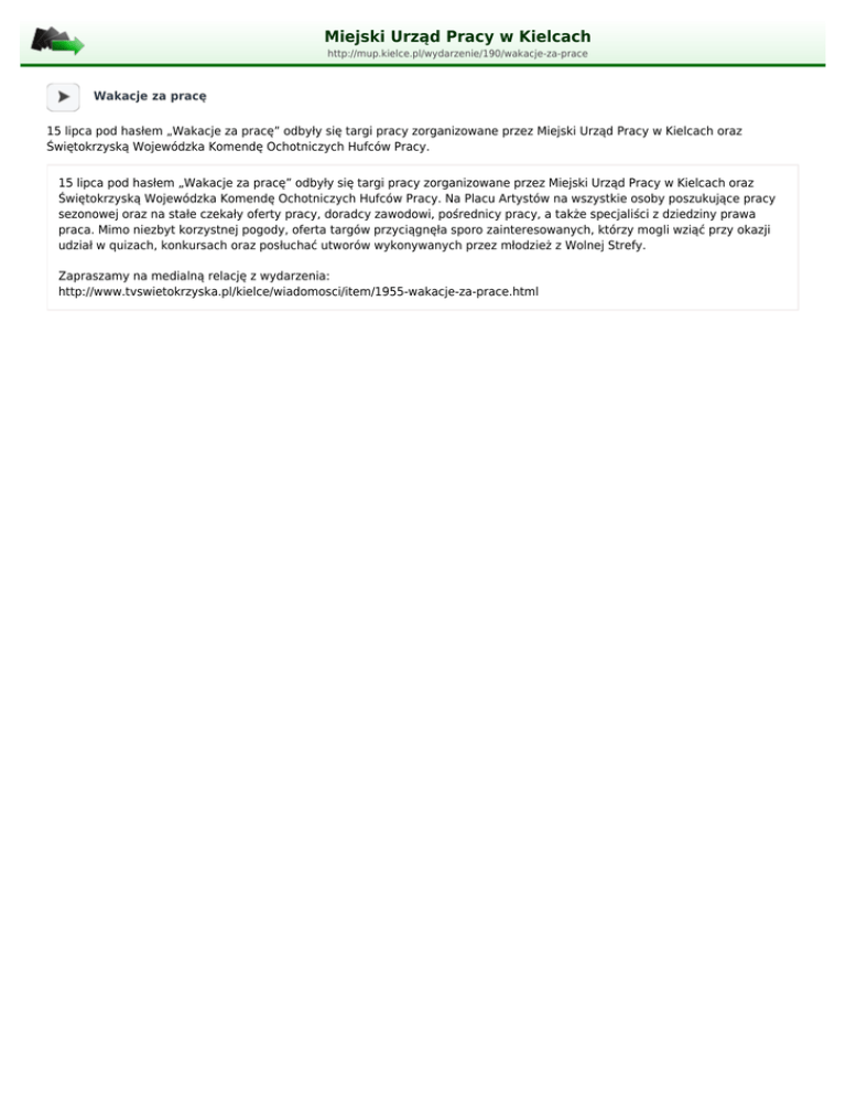 Miejski Urząd Pracy w Kielcach http://mup.kielce.pl/wydarzenie/190/wakacje-za-prace Wakacje za pracę 15 lipca pod hasłem „Wakacje za pracę” odbyły się targi pracy zorganizowane przez Miejski Urząd Pracy w Kielcach oraz Świętokrzyską Wojewódzka Komendę Ochotniczych Hufców Pracy. 15 lipca pod hasłem „Wakacje za pracę” odbyły się targi pracy zorganizowane przez Miejski Urząd Pracy w Kielcach oraz Świętokrzyską Wojewódzka Komendę Ochotniczych Hufców Pracy. Na Placu Artystów na wszystkie osoby poszukujące pracy sezonowej oraz na stałe czekały oferty pracy, doradcy zawodowi, pośrednicy pracy, a także specjaliści z dziedziny prawa praca. Mimo niezbyt korzystnej pogody, oferta targów przyciągnęła sporo zainteresowanych, którzy mogli wziąć przy okazji udział w quizach, konkursach oraz posłuchać utworów wykonywanych przez młodzież z Wolnej Strefy. Zapraszamy na medialną relację z wydarzenia: http://www.tvswietokrzyska.pl/kielce/wiadomosci/item/1955-wakacje-za-prace.html