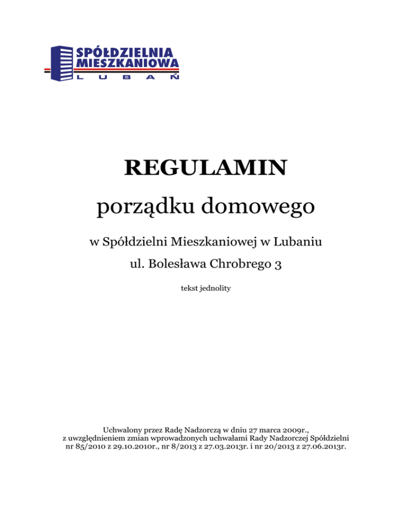 REGULAMIN porządku domowego w Spółdzielni Mieszkaniowej w Lubaniu ul. Bolesława Chrobrego 3 tekst jednolity Uchwalony przez Radę Nadzorczą w dniu 27 marca 2009r., z uwzględnieniem zmian wprowadzonych uchwałami Rady Nadzorczej Spółdzielni nr 85/2010 z 29.10.2010r., nr 8/2013 z 27.03.2013r. i nr 20/2013 z 27.06.2013r. Rada Nadzorcza Spółdzielni Mieszkaniowej w Lubaniu działając na podstawie ustawy z dnia 16.09.1982 r. „Prawo Spółdzielcze”, ustawy z dnia 15.12.2000 r. „O spółdzielniach mieszkaniowych” (z późniejszymi zmianami) oraz na podstawie §53 pkt. 1. ppkt. 22 Statutu Spółdzielni - ustala poniższy regulamin. I . Postanowienia ogólne §1 Spółdzielnia Mieszkaniowa jest organizacją zrzeszającą członków w celu zaspokojenia ich potrzeb mieszkaniowych oraz innych potrzeb gospodarczych, socjalnych i kulturalnych wynikających z zamieszkiwania we wspólnym osiedlu lub budynku. Budynki i ich otoczenie oraz wszelkie urządzenia w osiedlach Spółdzielni stanowią majątek członków zamieszkałych. 1.1. Niniejszy regulamin obowiązuje we wszystkich budynkach mieszkalnych oraz na terenach pozostających w zarządzie Spółdzielni Mieszkaniowej w Lubaniu zwanej dalej „Spółdzielnią”. 1.2. Do przestrzegania postanowień regulaminu obowiązani są: 1.2.1. „lokatorzy” – przez których należy rozumieć osoby posiadające tytuł prawny do zajmowania lokalu, jak: zamieszkali Członkowie Spółdzielni, właściciele lokali lub posiadacze własnościowego spółdzielczego prawa do lokalu nie należący do Spółdzielni, najemcy (podnajemcy) mieszkań lub lokali użytkowych, 1.2.2. „mieszkańcy” – przez których należy rozumieć Lokatorów oraz osoby zamieszkujące lub przebywające w lokalu za przyzwoleniem Lokatorów, jak: współmałżonkowie i inni członkowie rodzin, osoby pozostające faktycznie we wspólnym pożyciu z Lokatorem, wszelkie inne osoby przebywające w lokalu. 1.3. Postanowienia regulaminu stosuje się odpowiednio do użytkowników garaży i lokali użytkowych położonych poza obrębem budynków mieszkalnych oraz do dzierżawców gruntów należących do Spółdzielni. 1 1.4 Członek Spółdzielni i właściciel lokalu nie należący do Spółdzielni ponosi statutową odpowiedzialność za zachowanie osób, które wraz z nim korzystają z lokalu, a także osób, którym swój lokal wynajął lub oddał do używania. 1.5 Członek Spółdzielni i właściciel lokalu nie należący do Spółdzielni ponoszą również odpowiedzialność za przestrzeganie przez osoby wymienione w pkt. 1.4. postanowień niniejszego regulaminu i obowiązani są do zapoznania tych osób z regulaminem. 1.6 Rodzice lub opiekunowie obowiązani są dbać, aby dzieci stosowały się do postanowień niniejszego regulaminu. Za szkody wyrządzone na terenie posesji przez dzieci i małoletnią młodzież (np. niszczenie ścian, wybijanie szyb, dewastację urządzeń technicznych, niszczenie zieleni) odpowiadają ich rodzice lub opiekunowie. 1.7 Lokator powinien bezzwłocznie zgłaszać Administracji Spółdzielni wszelkie zmiany mające wpływ na wysokość opłat czynszowych. Zgłoszone zmiany będą uwzględnione w naliczeniu opłat począwszy od pierwszego dnia miesiąca następującego po dacie zgłoszenia zmiany. II. Przepisy w zakresie utrzymania w należytym stanie technicznym i sanitarnym budynków, lokali, urządzeń i instalacji. Obowiązki Spółdzielni §2 2. Do szczególnych obowiązków Spółdzielni w zakresie utrzymania czystości i porządku w pomieszczeniach wspólnych i otoczeniu budynków i posesji należy: 2.1. sprzątanie chodników, terenów przyległych do budynków i zespołów garaży codziennie, korytarzy piwnicznych raz w tygodniu, zamiatanie klatek schodowych trzy razy w tygodniu, 2.2. mycie klatek pomieszczeniach schodowych oraz gospodarczych okien na i korytarzach klatkach schodowych, piwnicznych w oraz drzwi wejściowych do budynków i lamperii w miarę potrzeb, 2.3. pielęgnacja terenów zielonych, 2.4. usuwanie z chodników śniegu, lodu oraz zapobieganie powstawania gołoledzi, usuwanie ewentualnych zagrożeń, które mogą wystąpić w zimie w miejscach 2 dostępnych dla mieszkańców lub innych użytkowników, 2.5. dokonywanie w miarę potrzeb dezynfekcji i deratyzacji pomieszczeń wspólnych takich jak pralnie, suszarnie, korytarze i pomieszczenia techniczne, oraz w szczególnych przypadkach lokali. §3 3. Służby techniczne Spółdzielni zobowiązane są do wykonywania następujących robót: 3.1 w zakresie instalacji centralnego ogrzewania: • remonty rozdzielaczy, • naprawa sieci c.o. w węzłach grupowych, • naprawy i modernizacja instalacji wewnętrznej, • uzupełniane wody uzdatnionej w instalacjach c.o., • montaż aparatury regulacyjnej, • wymian grzejników i zaworów w pomieszczeniach wspólnych, • montaż zaworów termostatycznych za odpłatnością lokatora, • naprawy instalacji wewnętrznej, w tym uszkodzonych grzejników żeliwnych, • przeprowadzanie przeglądów okresowych zgodnie z art.62 ustawy „Prawo Budowlane” , • dokonywanie spuszczenia i uzupełnienia wody uzdatnionej w instalacjach c.o. na życzenie użytkownika lokalu w okresie czerwiec – sierpień, a w innych terminach w szczególnych przypadkach za zgodą Zarządu Spółdzielni. Za dokonanie tych czynności Spółdzielnia pobiera opłatę w wysokości poniesionych kosztów robocizny. 3.2. w zakresie instalacji gazowej: • wymiana i uszczelnianie instalacji w oparciu zalecenia z przeglądów, • próby szczelności całej instalacji w budynku, za wyjątkiem sytuacji, kiedy konieczność wykonania próby szczelności w lokalu została zawiniona przez lokatora (np. samowolne przeróbki instalacji, odcięcie dopływu gazu przez Zakład Gazowniczy z winy lokatora). • przeprowadzanie okresowych przeglądów instalacji odbiorczych) zgodnie z art. 62 ustawy „Prawo Budowlane”, 3 (bez urządzeń 3.3. w zakresie instalacji elek