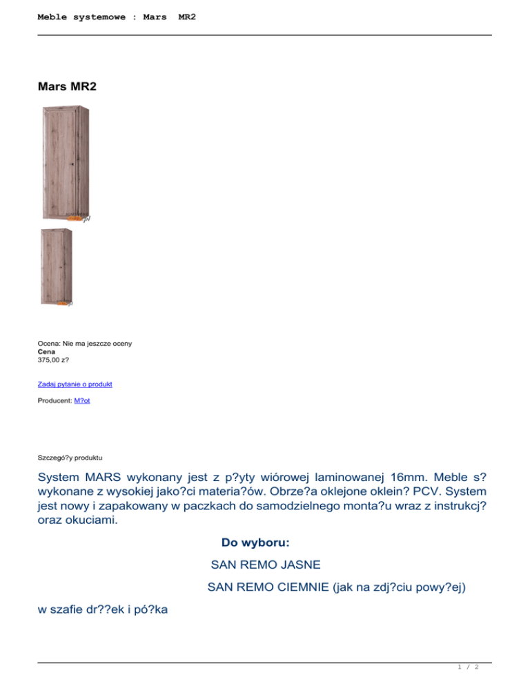 Meble systemowe : Mars MR2 Mars MR2 Ocena: Nie ma jeszcze oceny Cena 375,00 z? Zadaj pytanie o produkt Producent: M?ot Szczegó?y produktu System MARS wykonany jest z p?yty wiórowej laminowanej 16mm. Meble s? wykonane z wysokiej jako?ci materia?ów. Obrze?a oklejone oklein? PCV. System jest nowy i zapakowany w paczkach do samodzielnego monta?u wraz z instrukcj? oraz okuciami. Do wyboru: SAN REMO JASNE SAN REMO CIEMNIE (jak na zdj?ciu powy?ej) w szafie dr??ek i pó?ka 1 / 2 Meble systemowe : Mars Szeroko?? (cm) 60 MR2 WYMIARY Wysoko?? (cm) 194 G??boko?? (cm) 56 Opinie Nikt jeszcze nie ocenia? tego produktu. 2 / 2 Powered by TCPDF (www.tcpdf.org)