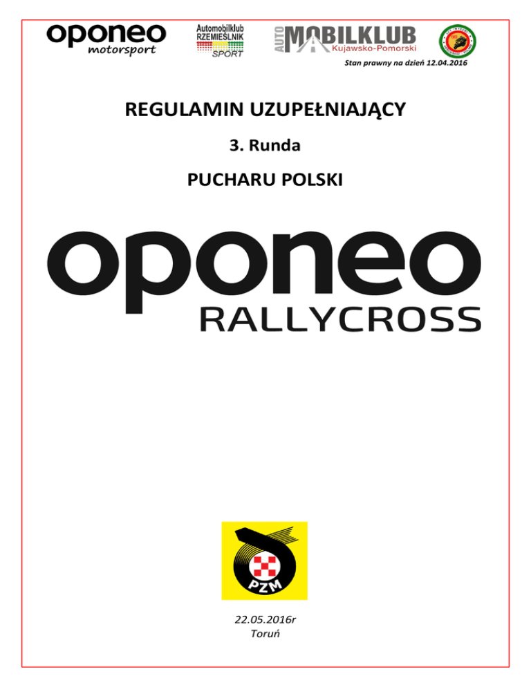Stan prawny na dzień 12.04.2016 REGULAMIN UZUPEŁNIAJĄCY 3. Runda PUCHARU POLSKI 22.05.2016r Toruń I. ZAWODY I ORGANIZATOR 1. Zawody stanowią 3. Rundę Pucharu Polski OPONEO Rallycross 2016 (zwane dalej PP ORX). 2. Niniejsze zawody organizowane są na podstawie : ZAWODY ZORGANIZOWANE ZGODNIE Z MIĘDZYNARODOWYM KODEKSEM SPORTOWYM FIA I JEGO ZAŁĄCZNIKAMI ORAZ REGULAMINEM KRAJOWYM SPORTU SAMOCHODOWEGO PZM - Międzynarodowego Kodeksu Sportu Samochodowego FIA wraz z załącznikami; - Regulaminu Pucharu Polski OPONEO Rallycross 2016 zatwierdzonego przez GKSS; - Komunikatów GKSS PZM; - Regulaminu Ochrony Środowiska w Sportach Motorowych ; - Regulaminu Medycznego PZM - Niniejszego regulaminu uzupełniającego. 3. Organizatorem zawodów jest: OPONEO Motorsport ul. Łucka nr 7 85-158 Bydgoszcz tel. +48 500 867 659 www.rallycross.com.pl Współorganizatorzy: Automobilklub Rzemieślnik ul. Żytnia nr 46 01-198 Warszawa tel. +48 22 632 81 49 Automobilklub Kujawsko-Pomorski ul. Chodkiewicza nr 30 85-064 Bydgoszcz tel. +48 791 777 111 www.akkp.pl przy współpracy z: LKT "Wyczół" Gościeradz 86-011 Wtelno tel. +48 604 112 025 4. Termin zawodów 22 maja 2016 roku. 5. Miejsce rozgrywania zawodów: OPONEO Moto-park Toruń ul. Bielańska 66. 6. Wiza GKSS PZM: ORX/3/BSPZM/160421 II. WŁADZE ZAWODÓW Zespół Sędziów Sportowych Przewodniczący Krzysztof Studziński I-003/12 Członek Krzysztof Karczewski I-254/12 Członek Piotr Kobus I-612/14 2 Obserwator GKSS TBA TBA Krzysztof Szeszko I-432/12 Dyrektor Zawodów Mirosław Urbaczewski I-560/13 Dyrektor Wyścigu Radosław Chrzanowski I-468/12 Lekarz Zawodów lek. med. Elżbieta Buszko-Sikora Delegat Techniczny GKSS PZM Kierownik zabezpieczenia i trasy tel. 606 911 003 Tomasz Błażejewski II-02014 Stanisław Ulandowski 16/2011/S/K/M Karol Marasek I-461/12 Przemysław Juszczyk II-02031 Kierownik Biura Zawodów Adam Jaros II-02048 Oficer ds. Kontaktu z Zawodnikami Marta Kobus II-02003 Miłosz Ostrowski CH 02/15 Komisarz Ochrony Środowiska Kierownik BK Sędzia Techniczny BK Kierownik Chronometrażu tel. 724 402 476 Pełna lista obsady sędziowskiej zostanie zweryfikowana i zatwierdzona przez GKSS PZM na 48 godzin przed badaniem kontrolnym i potwierdzona przez zespół sędziów sportowych po odbiorze administracyjnym. III. PROGRAM ZAWODÓW Sobota (21.05.2016) : 16:00 Otwarcie Biura Zawodów 16:00-20:45 Odbiór Administracyjny 16:30-21:00 Badania Kontrolne (zgodnie z harmonogramem) 21:15 I posiedzenie Zespołu Sędziów Sportowych (część pierwsza) - po 22:00 samochody nie będą wpuszczane na teren Parku Maszyn Niedziela (22.05.2016) : 7:00 Otwarcie Biura Zawodów 8:10 I posiedzenie Zespołu Sędziów Sportowych (część druga) 8:25 Odprawa z zawodnikami, losowanie pozycji na liście startowej 8:45-9:30 Trening Wolny 9:20 II posiedzenie Zespołu Sędziów Sportowych 9:40 Biegi Kwalifikacyjne I, II, przerwa techniczna, III, IV 3 14:45 III posiedzenie Zespołu Sędziów Sportowych 15:00 Półfinały A,B 15 min po Półfinałach – IV posiedzenie Zespołu Sędziów Sportowych 16:00 Finały 15 min po Finałach – V posiedzenie Zespołu Sędziów Sportowych 17:00 Wręczenie nagród 30 min po Wręczeniu nagród zamknięcie Biura Zawodów IV. POSTANOWIENIA OGÓLNE 1. Wszystkich zawodników/kierowców obowiązuje całkowity zakaz treningów na torze poza wyznaczonymi godzinami, jak również na terenie dróg dojazdowych i parku maszyn, pod rygorem kary aż do wykluczenia z zawodów włącznie (decyzja Dyrektora zawodów lub ZSS). 2. Treningi wolne zostaną zorganizowane wg harmonogramu zawodów. Będą miały formę wjazdu na 3 okrążenia toru – bez Joker Lap , z którym to kierowca zapoznaje się zjeżdżając z toru. W czasie przeznaczonym na trening wolny, ilość wyjazdów dowolna (pierwszeństwo mają kierowcy, którzy nie odbyli treningu). 3. Elektroniczny formularz zgłoszenia wypełnia zawodnik wyłącznie poprzez stronę internetową Inside PZM lub stronę internetową zawodów/organizatora (w przypadku zawodników posiadających licencję innego ASN-u). Po prawidłowym wypełnieniu, dołączeniu potwierdzenia wpłaty wpisowego i zatwierdzeniu zgłoszenie zostanie automatycznie wysłane pocztą elektroniczną do danego organizatora oraz do zawodnika na wskazany przez niego w formularzu adres e-mail. Zgłoszenie będzie przyjęte tylko i wyłącznie po opłaceniu pełnej kwoty wpisowego. 4. Zgłoszenia: https://inside.pzm.pl 5. Terminy zgłoszeń: - 1 termin zgłoszeń upływa z dniem: 12.05.2016 (zgłoszenie dostarczone do organizatora i wpłata zaksięgowana na koncie wskazanym przez Organizatora) - 2 termin zgłoszeń upływa z dniem: 15.05.2016 6. Wysokość wpisowego z reklamą dodatkową organizatora wynosi: Grupa / Klasa SuperCars SuperNational (K1, K2, K3) / Folkrace BMW E36 Folkrace SC Cup / 126p Cup I termin zgłoszeń 400,- PLN 380,- PLN 300,- PLN II termin zgłoszeń 600,- PLN 570,- PLN 450,- PLN Wysokość wpisowego bez reklamy dodatkowej organizatora wynosi: Grupa / Klasa SuperCars SuperNational (K1, K2, K3) / Folkrace BMW E36 Folkrace SC Cup / 126p Cup I termin zgłoszeń 800,- PLN 760,- PLN 600,- PLN II termin zgłoszeń 1200,- PLN 1140,- PLN 900,- PLN Wpłaty wpisowego należy dokonać na rachunek: Bank Millennium S.A. 94 1160 2202 0000 0002 7467 7892 4 7. Podział na grupy / klasy: 7.1. Grupa SuperCars Samochody z napędem na 4 koła, również z utraconą homologacją FIA zgodne z regulaminem technicznym PP ORX 2016 (zał. nr 1), lub art. 279 Zał. J. 7.1.1. Dla silników doładowanych, maksymalna dozwolona nominalna pojemność skokowa wynosi 2058 cm3 dla silników benzynowych i 2333 cm3 dla silników Diesla. Silniki wolnossące są dozwolone do przeliczonej pojemności równej silnikom turbodoładowanych. 7.2. Grupa SuperNational Samochody z napędem na 2 koła, również z utraconą homologacją FIA o pojemności skokowej silnika do 4000cm3, zgodne z regulaminem technicznym PP ORX (zał. nr 1), lub art. 279 Zał. J. 7.2.1