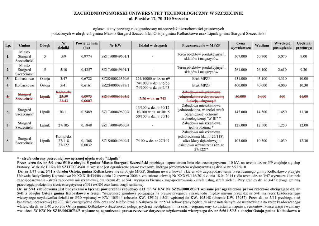 ZACHODNIOPOMORSKI UNIWERSYTET TECHNOLOGICZNY W SZCZECINIE al. Piastów 17, 70-310 Szczecin ogłasza ustny przetarg nieograniczony na sprzedaż nieruchomości gruntowych położonych w obrębie 5 gmina Miasto Stargard Szczeciński, Ostoja gmina Kołbaskowo oraz Lipnik gmina Stargard Szczeciński Lp. Gmina Obręb Nr działki Powierzchnia (ha) Nr KW Udział w drogach Przeznaczenie w MPZP Cena wywoławcza Wadium Wysokość postąpienia Godzina przetargu 5 5/9 0,9774 SZ1T/00049601/1 - Teren obiektów produkcyjnych, składów i magazynów 507.000 50.700 5.070 9.00 Teren obiektów produkcyjnych, składów i magazynów 261.000 26.100 2.610 9.30 Brak MPZP 431.000 43.100 4.310 10.00 Brak MPZP 400.000 40.000 4.000 10.30 50.000 5.000 500 11.00 145.000 14.500 1.450 11.30 125.000 12.500 1.250 12.00 103.000 10.300 1.030 12.30 5 5/10 0,4357 SZ1T/00049601/1 - 3. Miasto Stargard Szczeciński Miasto Stargard Szczeciński Kołbaskowo Ostoja 3/47 0,6722 SZ2S/00026320/6 4. Kołbaskowo Ostoja 5/41 0,6161 SZ2S/00003939/1 224/10000 w dz. nr 69 74/1000 w dz. nr 5/56 74/1000 w dz. nr 5/63 5. Stargard Szczeciński Lipnik Kompleks 23/59 23/43 0,0975 0,0007 SZ1T/00061693/2 6. Stargard Szczeciński Lipnik 30/11 0,2489 SZ1T/00049600/4 13/100 w dz. nr 30/12 10/100 w dz. nr 30/15 50/100 w dz. nr 30/16 7. Stargard Szczeciński Lipnik 27/105 0,1848 SZ1T/00049600/4 - 8. Stargard Szczeciński Lipnik Kompleks 27/118 27/122 0,1368 0,0032 SZ1S/00049600/4 7/100 w dz. nr 27/107 1. 2. 2/20 w dz. nr 742 Zabudowa mieszkaniowa jednorodzinna z dopuszczalną funkcją usługową * Zabudowa mieszkaniowa jednorodzinna, w części strefa ograniczonej ochrony archeologicznej "W III" * Zabudowa mieszkaniowa jednorodzinna * Zabudowa mieszkaniowa jednorodzinna (dz. nr 27/118), ulica klasy dojazdowej osiedlowa wewnętrzna (dz. nr 27/122)* * - strefa ochrony pośredniej zewnętrznej ujęcia wody "Lipnik" Przez teren dz. nr 5/9 oraz 5/10 z obrębu 5 gmina Miasto Stargard Szczeciński przebiega napowietrzna linia elektroenergetyczna 110 kV, na terenie dz. nr 5/9 znajduje się słup kratowy. W dziale III Kw Nr SZ1T/00049601/1 wpisane jest ograniczone prawo rzeczowe, którego przedmiotem wykonywania są działki nr 5/9 i 5/10. Dz. nr 3/47 oraz 5/41 z obrębu Ostoja, gmina Kołbaskowo nie są objęte MPZP. Studium uwarunkowań i kierunków zagospodarowania przestrzennego gminy Kołbaskowo przyjęte Uchwałą Rady Gminy Kołbaskowo Nr XXXIII/434/06 z dnia 12 czerwca 2006 r. zmienione uchwałą Nr XXXVI/446/2014 z dnia 18.04.2014 r. dla terenu dz. nr 3/47 wyznacza kierunek zagospodarowania - strefa zabudowy mieszkaniowej, dla terenu dz. nr 5/41 wyznacza kierunek zagospodarowania - strefa usług, strefa zieleni. Przy granicy dz. nr 3/47 z drogą gminną przebiegają podziemne sieci: energetyczna eNN i eANN oraz kanalizacji sanitarnej. Dz. nr 5/41 zabudowana jest budynkami o łącznej powierzchni zabudowy 613 m². W KW Nr SZ2S/00003939/1 wpisane jest ograniczone prawo rzeczowe obciążające dz. nr 5/41 z obrębu Ostoja gmina Kołbaskowo o treści: "służebność gruntowa polegająca na prawie przejazdu i przechodu między innymi przez dz. nr 5/41 na rzecz każdoczesnego wieczystego użytkownika działki nr 5/30 wpisanej w KW. 105144 (obecnie KW. 13913) i 5/31 wpisanej do KW. 105148 (obecnie KW. 15937). Przez dz. nr 5/41 przebiega sieć kanalizacji deszczowej kd 200, sieć energetyczna eNN oraz sieć telefoniczna t. Nabywca dz. nr 5/41 zobowiązany będzie, w akcie notarialnym, do ustanowienia na rzecz każdoczesnego właściciela dz. nr 5/40 z obrębu Ostoja gmina Kołbaskowo służebności, polegających na nieodpłatnym i na czas nieograniczony korzystaniu, naprawy, remontów, konserwacji i wymiany ww. sieci. W KW Nr SZ2S/00020736/3 wpisane są ograniczone prawa rzeczowe dotyczące użytkowania wieczystego dz. nr 5/56 i 5/63 z obrębu Ostoja gmina Kołbaskowo o treści: "służebność gruntowa na rzecz każdoczesnych właścicieli działek 5/12, 5/13 opisanych w KW 3939 (dawna 80375), polegająca na prawie przejazdu i przechodu przez dz. nr 5/63 i 5/56 oraz służebność gruntowa polegająca na prawie przejazdu i przechodu przez dz. nr 5/63 i 5/56 na rzecz każdoczesnego wieczystego użytkownika dz. nr 5/30 wpisanej w KW 105144 (obecnie 13913) i 5/31 wpisanej do KW 105148 (obecnie KW 15937). Do dz. nr 27/105 oraz 27/118 z obrębu Lipnik gmina Stargard Szczeciński doprowadzono energię elektryczną. Uczelnia zapewnia wgląd do dokumentacji umożliwiającej weryfikację stanu prawnego i faktycznego nieruchomości. Przetarg odbędzie się w dniu 22 października 2015 r. w Zachodniopomorskim Uniwersytecie Technologicznym w Szczecinie przy al. Piastów 48, V piętro, pok. 521. 1. Warunkiem uczestnictwa w przetargu jest wpłacenie wadium w pieniądzu. Wadium należy wpłacić na konto Zachodniopomorskiego Uniwersytetu Technologicznego w Szczecinie, Bank Zachodni WBK S.A. 3 O/Szczecin 11 1090 1492 0000 0001 0766 8908 z dopiskiem na dowodzie wpłaty „wadium na działkę nr ..........”. Wadium winno być uznane na rachunku Uczelni najpóźniej w dniu 20 października 2015 r. 2. Uczestnicy przetargu zobowiązani są posiadać potwierdzenie wpłacenia wadium oraz dokumenty tożsamości a osoby prawne dodatkowo pełnomocnictwa do udziału w przetargu. 3. Wpłata wadium powoduje przyjęcie wszelkich warunków przetargu bez zastrzeżeń, opisanych szczegółowo w Regulaminie zbywania lub oddawania do używania na podstawie umów cywilnoprawnych nieruchomości stanowiących własność Zachodniopomorskiego Uniwersytetu Technologicznego w Szczecinie, a także przenoszenia prawa użytkowania wieczystego oraz oddawania do używania na podstawie umów cywilnoprawnych nieruchomości będących w użytkowaniu wieczystym Uczelni, który znajduje się na stronie internetowej www.zut.edu.pl w zakładce „Biznes – nieruchomości”. 4. Cena wywoławcza, wartość postąpienia, cena wylicytowana podawana jest w kwocie netto. Do ceny ustalonej w wyniku przetargu doli