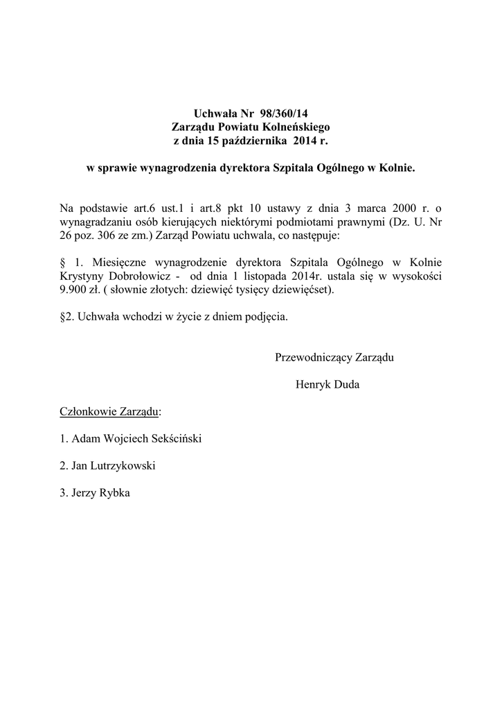 Uchwała Nr 98/360/14 Zarządu Powiatu Kolneńskiego z dnia 15 października 2014 r. w sprawie wynagrodzenia dyrektora Szpitala Ogólnego w Kolnie. Na podstawie art.6 ust.1 i art.8 pkt 10 ustawy z dnia 3 marca 2000 r. o wynagradzaniu osób kierujących niektórymi podmiotami prawnymi (Dz. U. Nr 26 poz. 306 ze zm.) Zarząd Powiatu uchwala, co następuje: § 1. Miesięczne wynagrodzenie dyrektora Szpitala Ogólnego w Kolnie Krystyny Dobrołowicz - od dnia 1 listopada 2014r. ustala się w wysokości 9.900 zł. ( słownie złotych: dziewięć tysięcy dziewięćset). §2. Uchwała wchodzi w życie z dniem podjęcia. Przewodniczący Zarządu Henryk Duda Członkowie Zarządu: 1. Adam Wojciech Sekściński 2. Jan Lutrzykowski 3. Jerzy Rybka
