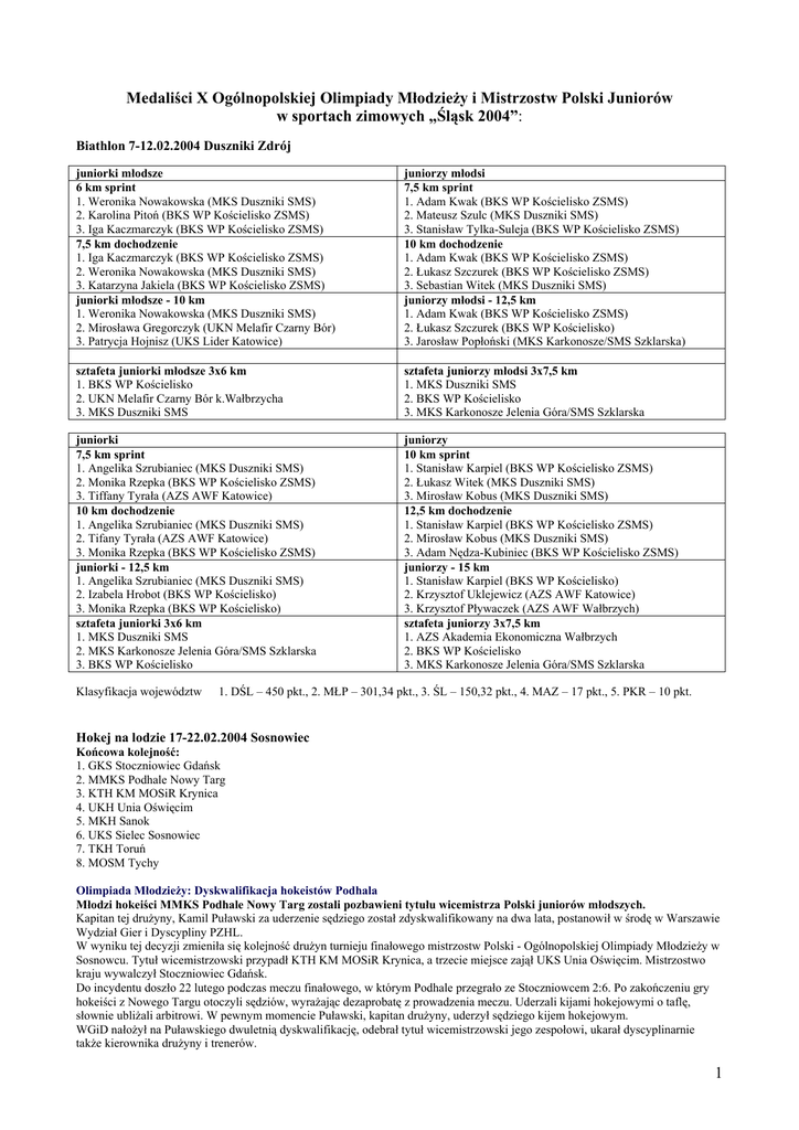 Medaliści X Ogólnopolskiej Olimpiady Młodzieży i Mistrzostw Polski Juniorów w sportach zimowych „Śląsk 2004”: Biathlon 7-12.02.2004 Duszniki Zdrój juniorki młodsze 6 km sprint 1. Weronika Nowakowska (MKS Duszniki SMS) 2. Karolina Pitoń (BKS WP Kościelisko ZSMS) 3. Iga Kaczmarczyk (BKS WP Kościelisko ZSMS) 7,5 km dochodzenie 1. Iga Kaczmarczyk (BKS WP Kościelisko ZSMS) 2. Weronika Nowakowska (MKS Duszniki SMS) 3. Katarzyna Jakiela (BKS WP Kościelisko ZSMS) juniorki młodsze - 10 km 1. Weronika Nowakowska (MKS Duszniki SMS) 2. Mirosława Gregorczyk (UKN Melafir Czarny Bór) 3. Patrycja Hojnisz (UKS Lider Katowice) juniorzy młodsi 7,5 km sprint 1. Adam Kwak (BKS WP Kościelisko ZSMS) 2. Mateusz Szulc (MKS Duszniki SMS) 3. Stanisław Tylka-Suleja (BKS WP Kościelisko ZSMS) 10 km dochodzenie 1. Adam Kwak (BKS WP Kościelisko ZSMS) 2. Łukasz Szczurek (BKS WP Kościelisko ZSMS) 3. Sebastian Witek (MKS Duszniki SMS) juniorzy młodsi - 12,5 km 1. Adam Kwak (BKS WP Kościelisko ZSMS) 2. Łukasz Szczurek (BKS WP Kościelisko) 3. Jarosław Popłoński (MKS Karkonosze/SMS Szklarska) sztafeta juniorki młodsze 3x6 km 1. BKS WP Kościelisko 2. UKN Melafir Czarny Bór k.Wałbrzycha 3. MKS Duszniki SMS sztafeta juniorzy młodsi 3x7,5 km 1. MKS Duszniki SMS 2. BKS WP Kościelisko 3. MKS Karkonosze Jelenia Góra/SMS Szklarska juniorki 7,5 km sprint 1. Angelika Szrubianiec (MKS Duszniki SMS) 2. Monika Rzepka (BKS WP Kościelisko ZSMS) 3. Tiffany Tyrała (AZS AWF Katowice) 10 km dochodzenie 1. Angelika Szrubianiec (MKS Duszniki SMS) 2. Tifany Tyrała (AZS AWF Katowice) 3. Monika Rzepka (BKS WP Kościelisko ZSMS) juniorki - 12,5 km 1. Angelika Szrubianiec (MKS Duszniki SMS) 2. Izabela Hrobot (BKS WP Kościelisko) 3. Monika Rzepka (BKS WP Kościelisko) sztafeta juniorki 3x6 km 1. MKS Duszniki SMS 2. MKS Karkonosze Jelenia Góra/SMS Szklarska 3. BKS WP Kościelisko juniorzy 10 km sprint 1. Stanisław Karpiel (BKS WP Kościelisko ZSMS) 2. Łukasz Witek (MKS Duszniki SMS) 3. Mirosław Kobus (MKS Duszniki SMS) 12,5 km dochodzenie 1. Stanisław Karpiel (BKS WP Kościelisko ZSMS) 2. Mirosław Kobus (MKS Duszniki SMS) 3. Adam Nędza-Kubiniec (BKS WP Kościelisko ZSMS) juniorzy - 15 km 1. Stanisław Karpiel (BKS WP Kościelisko) 2. Krzysztof Uklejewicz (AZS AWF Katowice) 3. Krzysztof Pływaczek (AZS AWF Wałbrzych) sztafeta juniorzy 3x7,5 km 1. AZS Akademia Ekonomiczna Wałbrzych 2. BKS WP Kościelisko 3. MKS Karkonosze Jelenia Góra/SMS Szklarska Klasyfikacja województw 1. DŚL – 450 pkt., 2. MŁP – 301,34 pkt., 3. ŚL – 150,32 pkt., 4. MAZ – 17 pkt., 5. PKR – 10 pkt. Hokej na lodzie 17-22.02.2004 Sosnowiec Końcowa kolejność: 1. GKS Stoczniowiec Gdańsk 2. MMKS Podhale Nowy Targ 3. KTH KM MOSiR Krynica 4. UKH Unia Oświęcim 5. MKH Sanok 6. UKS Sielec Sosnowiec 7. TKH Toruń 8. MOSM Tychy Olimpiada Młodzieży: Dyskwalifikacja hokeistów Podhala Młodzi hokeiści MMKS Podhale Nowy Targ zostali pozbawieni tytułu wicemistrza Polski juniorów młodszych. Kapitan tej drużyny, Kamil Puławski za uderzenie sędziego został zdyskwalifikowany na dwa lata, postanowił w środę w Warszawie Wydział Gier i Dyscypliny PZHL. W wyniku tej decyzji zmieniła się kolejność drużyn turnieju finałowego mistrzostw Polski - Ogólnopolskiej Olimpiady Młodzieży w Sosnowcu. Tytuł wicemistrzowski przypadł KTH KM MOSiR Krynica, a trzecie miejsce zajął UKS Unia Oświęcim. Mistrzostwo kraju wywalczył Stoczniowiec Gdańsk. Do incydentu doszło 22 lutego podczas meczu finałowego, w którym Podhale przegrało ze Stoczniowcem 2:6. Po zakończeniu gry hokeiści z Nowego Targu otoczyli sędziów, wyrażając dezaprobatę z prowadzenia meczu. Uderzali kijami hokejowymi o taflę, słownie ubliżali arbitrowi. W pewnym momencie Puławski, kapitan drużyny, uderzył sędziego kijem hokejowym. WGiD nałożył na Puławskiego dwuletnią dyskwalifikację, odebrał tytuł wicemistrzowski jego zespołowi, ukarał dyscyplinarnie także kierownika drużyny i trenerów. 1 Końcowa kolejność MP juniorów młodszych Ogólnopolskiej Olimpiady Młodzieży po decyzji WGiD PZHL: 1. Stoczniowiec Gdańsk 2. KTH KM MOSiR Krynica 3. UKS Unia Oświęcim 4. MKH Sanok 5. UKS Sielec Sosnowiec 6. TKH Toruń 7. MOSM Tychy MMKS Podhale Nowy Targ nie został sklasyfikowany. Klasyfikacja województw 1. MŁP – 76 pkt., 2. ŚL – 48 pkt., 3. POM – 45 pkt., 4. PKR – 32 pkt., 5. KPM – 24 pkt. Łyżwiarstwo figurowe 20-22.02.2004 Katowice solistki - junior młodszy A 1. Ilona Senderek (Marymont Warszawa) 2. Ewa Słupianek (Piast Opole) 3. Karolina Bulak (Marymont Warszawa) soliści - junior młodszy A 1. Mateusz Chruściński (Unia Oświęcim) 2. Janusz Karweta (Unia Oświęcim)) 3. Tomasz Grajcar (Piast Opole) pary sportowe junior młodszy A 1. Aneta Michałek, Mariusz Świerguła (Unia Oswięcim) solistki - junior młodszy B 1. Julia Szczerbowska (Unia Oświęcim) 2. Katarzyna Dusik (Unia Oświęcim) 3. Krystina Klimczak (Unia Oświęcim) soliści - junior młodszy B 1. Sebastian Iwasaki (Marymont Warszawa) 2. Kamil Białas (Unia Oświęcim) 3. Edwin Siwkowski (Marymont Warszawa) pary sportowe junior młodszy B 1. Julia Szczerbowska, Łukasz Chluba (Unia Oświęcim) 2. Krystina Klimczak, Janusz Karweta (Unia Oświęcim) 3. Agnieszka Klimek, Bartosz Paluchowski (Unia Oświęcim) pary taneczne junior młodszy B 1. Milena Szymczyk, Maciej Bernakowski (ŁTŁF Łódź) 2. Emilia Jaranowska, Michał Więcek (Stoczniowiec Gdańsk) 3. Natalia Helszer, Patryk Habrat (ŁTŁF Łódź) pary taneczne junior młodszy A 1. Patrycja Petrus, Robert Chudziński (Stoczniowiec Gdańsk) 2. Izabela Brzozowska, Łukasz Dzióbek (Stoczniowiec) Klasyfikacja województw 1. MŁP – 96,5 pkt., 2. MAZ – 94 pkt., 3. POM – 30,5 pkt., 4. KPM – 24 pkt., 5. OPO – 21 pkt., 6. ŁDZ – 16 pkt., 7. ŚL – 10 pkt., Łyżwiarstwo szybkie 7-8.02.2004 Tomaszów Mazowiecki juniorki 500 m 1. Karolina Ksyt (KS Pilica Tomaszów Maz.) 2. Luiza Złotkowska (Z