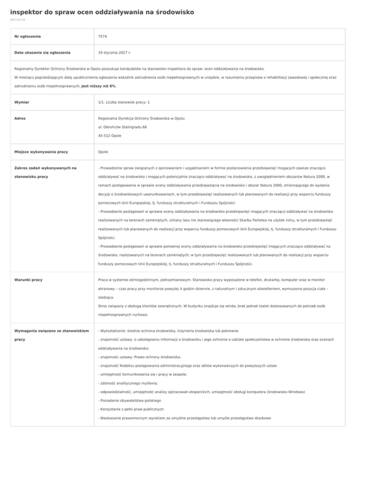inspektor do spraw ocen oddziaływania na środowisko 2017-01-19 Nr ogłoszenia 7574 Data ukazania się ogłoszenia 19 stycznia 2017 r. Regionalny Dyrektor Ochrony Środowiska w Opolu poszukuje kandydatów na stanowisko inspektora do spraw: ocen oddziaływania na środowisko. W miesiącu poprzedzającym datę upublicznienia ogłoszenia wskaźnik zatrudnienia osób niepełnosprawnych w urzędzie, w rozumieniu przepisów o rehabilitacji zawodowej i społecznej oraz zatrudnianiu osób niepełnosprawnych, jest niższy niż 6%. Wymiar 1/1. Liczba stanowisk pracy: 1 Adres Regionalna Dyrekcja Ochrony Środowiska w Opolu ul. Obrońców Stalingradu 66 45-512 Opole Miejsce wykonywania pracy Opole Zakres zadań wykonywanych na - Prowadzenie spraw związanych z opiniowaniem i uzgadnianiem w formie postanowienia przedsięwzięć mogących zawsze znacząco stanowisku pracy oddziaływać na środowisko i mogących potencjalnie znacząco oddziaływać na środowisko, z uwzględnieniem obszarów Natura 2000, w ramach postępowania w sprawie oceny oddziaływania przedsięwzięcia na środowisko i obszar Natura 2000, zmierzającego do wydania decyzji o środowiskowych uwarunkowaniach, w tym przedsięwzięć realizowanych lub planowanych do realizacji przy wsparciu funduszy pomocowych Unii Europejskiej, tj. funduszy strukturalnych i Funduszu Spójności - Prowadzenie postępowań w sprawie oceny oddziaływania na środowisko przedsięwzięć mogących znacząco oddziaływać na środowisko realizowanych na terenach zamkniętych, zmiany lasu nie stanowiącego własności Skarbu Państwa na użytek rolny, w tym przedsięwzięć realizowanych lub planowanych do realizacji przy wsparciu funduszy pomocowych Unii Europejskiej, tj. funduszy strukturalnych i Funduszu Spójności. - Prowadzenie postępowań w sprawie ponownej oceny oddziaływania na środowisko przedsięwzięć mogących znacząco oddziaływać na środowisko, realizowanych na terenach zamkniętych; w tym przedsięwzięć realizowanych lub planowanych do realizacji przy wsparciu funduszy pomocowych Unii Europejskiej, tj. funduszy strukturalnych i Funduszu Spójności. Warunki pracy Praca w systemie ośmiogodzinnym, jednozmianowym. Stanowisko pracy wyposażone w telefon, drukarkę, komputer oraz w monitor ekranowy – czas pracy przy monitorze powyżej 4 godzin dziennie, z naturalnym i sztucznym oświetleniem, wymuszona pozycja ciała – siedząca. Stres związany z obsługą klientów zewnętrznych. W budynku znajduje się winda, brak jednak toalet dostosowanych do potrzeb osób niepełnosprawnych ruchowo. Wymagania związane ze stanowiskiem - Wykształcenie: średnie ochrona środowiska, inżynieria środowiska lub pokrewne pracy - znajomość ustawy: o udostępianiu informacji o środowisku i jego ochronie o udziale społeczeństwa w ochronie środowiska oraz ocenach oddziaływania na środowisko; - znajomośc ustawy: Prawo ochrony środowiska; - znajomość Kodeksu postępowania administracyjnego oraz aktów wykonawczych do powyższych ustaw - umiejętność komunikowania się i pracy w zespole; - zdolność analitycznego myślenia; - odpowiedzialność, umiejętność analizy op[racowań eksperckich, umiejętność obsługi komputera (środowisko Windows) - Posiadanie obywatelstwa polskiego - Korzystanie z pełni praw publicznych - Nieskazanie prawomocnym wyrokiem za umyślne przestępstwo lub umyśle przestępstwo skarbowe Wymagane dokumenty i oświadczenia - Życiorys/CV i list motywacyjny - Kopie dokumentów potwierdzających spełnienie wymagania niezbędnego w zakresie wykształcenia - Oświadczenie o posiadaniu obywatelstwa polskiego albo kopia dokumentu potwierdzającego posiadanie polskiego obywatelstwa - Oświadczenie o wyrażeniu zgody na przetwarzanie danych osobowych do celów naboru - Oświadczenie o korzystaniu z pełni praw publicznych - Oświadczenie o nieskazaniu prawomocnym wyrokiem za umyślne przestępstwo lub umyślne przestępstwo skarbowe Inne dokumenty i oświadczenia - kopia dokumentu potwierdzającego niepełnosprawność - w przypadku kandydatek/kandydatów, zamierzających skorzystać z pierwszeństwa w zatrudnieniu w przypadku, gdy znajdą się w gronie najlepszych kandydatek/kandydatów - Kopie dokumentów potwierdzających spełnienie wymagania dodatkowego w zakresie wykształcenia - Kopie dokumentów potwierdzających spełnienie wymagania dodatkowego w zakresie doświadczenia zawodowego / stażu pracy Termin składania dokumentów 25 stycznia 2017 r. Miejsce składania dokumentów Regionalna Dyrekcja Ochrony Środowiska w Opolu ul. Obrońców Stalingradu 66 45-512 Opole lub osobiście: sekretariat III piętro pok.4.31 A z dopiskiem "Oferta pracy - inspektor w WOOŚ" Inne informacje W miesiącu poprzedzającym datę upublicznienia ogłoszenia wskaźnik zatrudnienia osób niepełnosprawnych w urzędzie, w rozumieniu przepisów o rehabilitacji zawodowej i społecznej oraz zatrudnianiu osób niepełnosprawnych, nie wynosi co najmniej 6%. Oferty niekompletne lub wpływające po terminie (decyduje data stempla pocztowego) nie będą brane pod uwagę. Życiorys (CV), list motywacyjny oraz oświadczenia powinny być opatrzone własnoręcznym podpisem kandydata. Oświadczenia dodatkowo powinny zawierać datę. Informacje dla osób zakwalifikowanych do kolejnych etapów rekrutacji zostaną przekazane na adres e-mail lub telefonicznie. Oferty odrzucone zostaną komisyjnie zniszczone. Oferta w celu zastępsta nieobecnego pracownika. Dodatkowe informacje można uzyskać pod nr tel. 77/ 4526254 lub 77/4526248. Autorzy Wprowadził: Zmodyfikował: Małgorzata Pach Małgorzata Pach Data wprowadzenia: Data ostatniej modyfikacji: 2017-01-19 11:05:23 2017-02-03 10:12:11 Ilość odsłon artykułu: 329