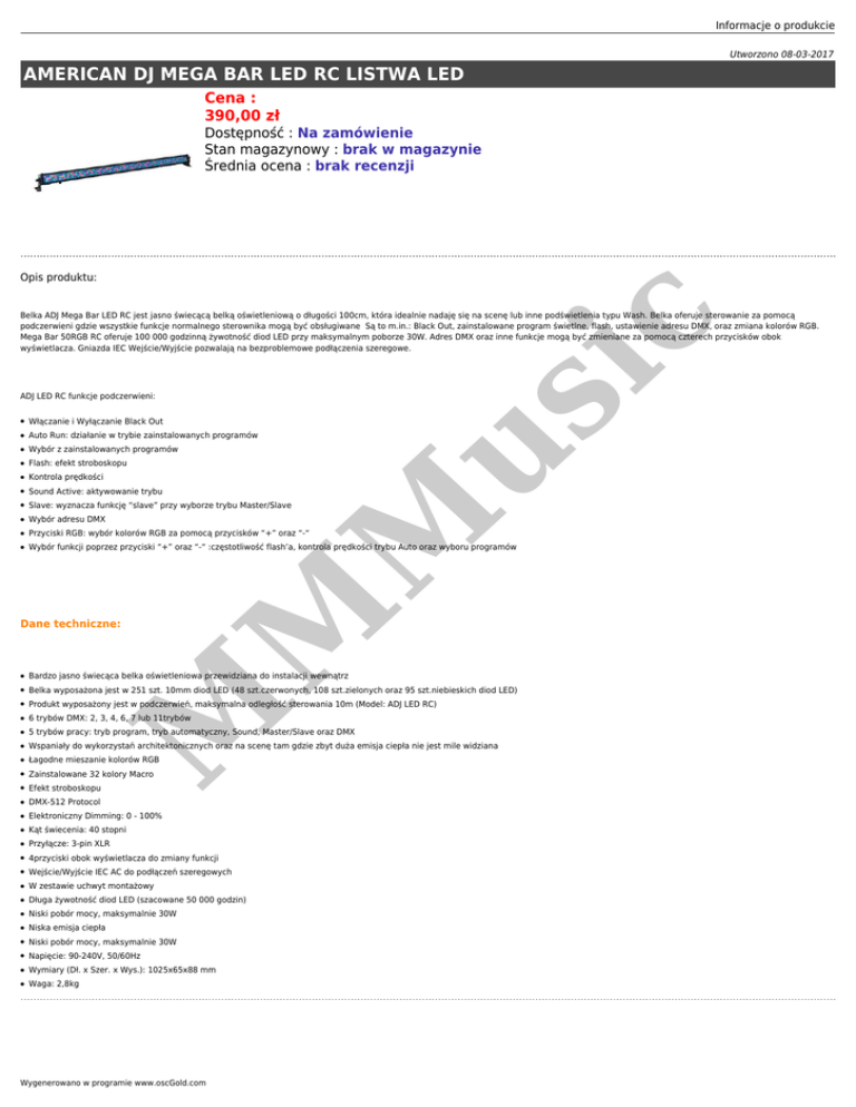 Informacje o produkcie Utworzono 08-03-2017 AMERICAN DJ MEGA BAR LED RC LISTWA LED Cena : 390,00 zł Dostępność : Na zamówienie Stan magazynowy : brak w magazynie Średnia ocena : brak recenzji Opis produktu: ADJ LED RC funkcje podczerwieni: us ic Belka ADJ Mega Bar LED RC jest jasno świecącą belką oświetleniową o długości 100cm, która idealnie nadaję się na scenę lub inne podświetlenia typu Wash. Belka oferuje sterowanie za pomocą podczerwieni gdzie wszystkie funkcje normalnego sterownika mogą być obsługiwane Są to m.in.: Black Out, zainstalowane program świetlne, flash, ustawienie adresu DMX, oraz zmiana kolorów RGB. Mega Bar 50RGB RC oferuje 100 000 godzinną żywotność diod LED przy maksymalnym poborze 30W. Adres DMX oraz inne funkcje mogą być zmieniane za pomocą czterech przycisków obok wyświetlacza. Gniazda IEC Wejście/Wyjście pozwalają na bezproblemowe podłączenia szeregowe. Włączanie i Wyłączanie Black Out ● Auto Run: działanie w trybie zainstalowanych programów ● Wybór z zainstalowanych programów ● Flash: efekt stroboskopu ● Kontrola prędkości ● Sound Active: aktywowanie trybu ● Slave: wyznacza funkcję “slave” przy wyborze trybu Master/Slave ● Wybór adresu DMX ● Przyciski RGB: wybór kolorów RGB za pomocą przycisków “+” oraz “-“ ● Wybór funkcji poprzez przyciski “+” oraz “-“ :częstotliwość flash’a, kontrola prędkości trybu Auto oraz wyboru programów M Dane techniczne: M ● Bardzo jasno świecąca belka oświetleniowa przewidziana do instalacji wewnątrz ● Belka wyposażona jest w 251 szt. 10mm diod LED (48 szt.czerwonych, 108 szt.zielonych oraz 95 szt.niebieskich diod LED) ● Produkt wyposażony jest w podczerwień, maksymalna odległość sterowania 10m (Model: ADJ LED RC) ● 6 trybów DMX: 2, 3, 4, 6, 7 lub 11trybów ● 5 trybów pracy: tryb program, tryb automatyczny, Sound, Master/Slave oraz DMX ● Wspaniały do wykorzystań architektonicznych oraz na scenę tam gdzie zbyt duża emisja ciepła nie jest mile widziana ● Łagodne mieszanie kolorów RGB ● Zainstalowane 32 kolory Macro ● Efekt stroboskopu ● DMX-512 Protocol ● Elektroniczny Dimming: 0 - 100% ● Kąt świecenia: 40 stopni ● Przyłącze: 3-pin XLR ● 4przyciski obok wyświetlacza do zmiany funkcji ● Wejście/Wyjście IEC AC do podłączeń szeregowych ● W zestawie uchwyt montażowy ● Długa żywotność diod LED (szacowane 50 000 godzin) ● Niski pobór mocy, maksymalnie 30W ● Niska emisja ciepła ● Niski pobór mocy, maksymalnie 30W ● Napięcie: 90-240V, 50/60Hz ● Wymiary (Dł. x Szer. x Wys.): 1025x65x88 mm ● Waga: 2,8kg M ● Wygenerowano w programie www.oscGold.com