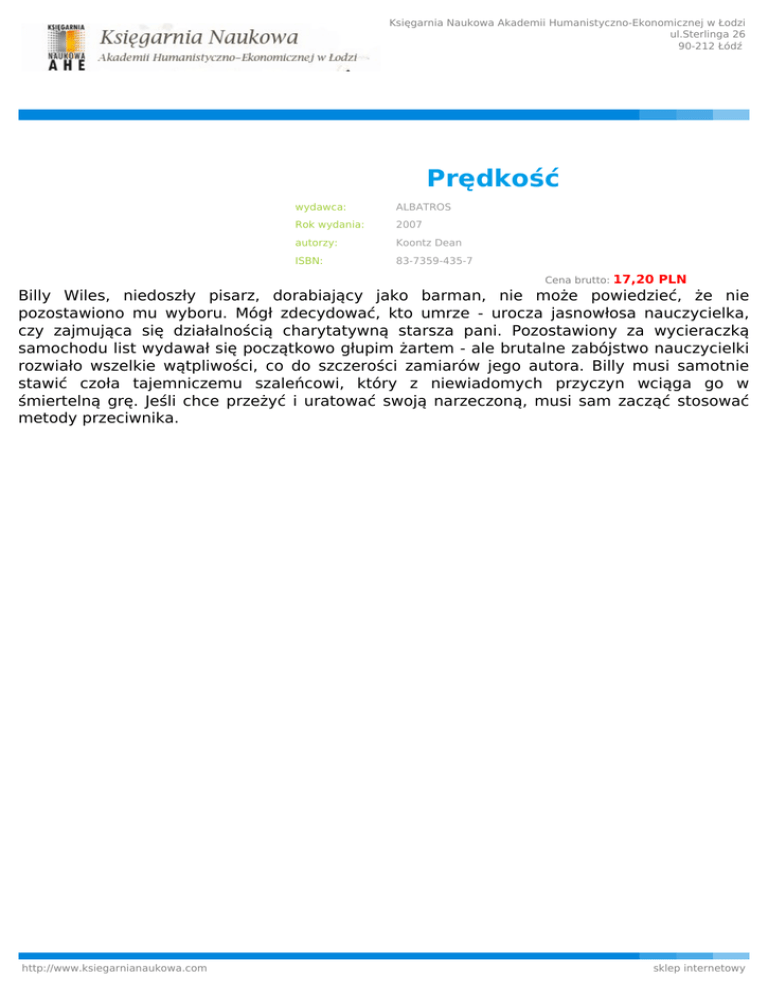 Księgarnia Naukowa Akademii Humanistyczno-Ekonomicznej w Łodzi ul.Sterlinga 26 90-212 Łódź Prędkość wydawca: ALBATROS Rok wydania: 2007 autorzy: Koontz Dean ISBN: 83-7359-435-7 Cena brutto: 17,20 PLN Billy Wiles, niedoszły pisarz, dorabiający jako barman, nie może powiedzieć, że nie pozostawiono mu wyboru. Mógł zdecydować, kto umrze - urocza jasnowłosa nauczycielka, czy zajmująca się działalnością charytatywną starsza pani. Pozostawiony za wycieraczką samochodu list wydawał się początkowo głupim żartem - ale brutalne zabójstwo nauczycielki rozwiało wszelkie wątpliwości, co do szczerości zamiarów jego autora. Billy musi samotnie stawić czoła tajemniczemu szaleńcowi, który z niewiadomych przyczyn wciąga go w śmiertelną grę. Jeśli chce przeżyć i uratować swoją narzeczoną, musi sam zacząć stosować metody przeciwnika. http://www.ksiegarnianaukowa.com sklep internetowy