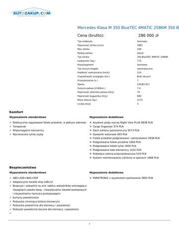 Mercedes Klasa M 350 BlueTEC 4MATIC 258KM 350 Bl Cena (brutto): 286 000 zł Typ nadwozia terenowy Pojemność silnika (ccm) 2987 Moc silnika 258 Rodzaj paliwa diesel Typ silnika 350 BlueTEC 4MATIC 258KM Ładowność (kg.) 775 Klasa/segment terenowe Typ skrzyni biegów automatyczna Prędkość maksymalna (km/h) 224 Częstotliwość przeglądu (km.) Brak danych Przyspieszenie (s.) 7 Opony 235/65 R17 Zużycie paliwa (l/100km.) 7.4 Pojemność zbiornika paliwa (litry) 70 Pojemność bagażnika (litry) 690 Masa własna (kg.) 2175 Liczba drzwi 5 Komfort Wyposażenie standardowe Wyposażenie dodatkowe ✓ Elektrycznie regulowane fotele przednie, w pełnym zakresie ✕ Asystent jazdy nocnej Night View PLUS 6838 PLN ✓ Tempomat ✕ Cargo Organizer 574 PLN ✓ Wspomaganie kierownicy ✕ Dach szklany panoramiczny 9573 PLN ✓ Wycieraczka tylnej szyby ✕ Dywaniki welurowe 493 PLN ✕ Fotele przednie podgrzewane i wentylowane 3938 PLN ✕ Podgrzewane fotele przednie 1859 PLN ✕ Podgrzewane fotele tylne 1859 PLN ✕ Podgrzewane koło kierownicy 1422 PLN ✕ Podwójna osłona przeciwsłoneczna 519 PLN ✕ System monitorowania ciśnienia w oponach 1668 PLN Bezpieczeństwo Wyposażenie standardowe Wyposażenie dodatkowe ✓ ABS+ASR+BAS+ESP ✕ PARKTRONIC z asystentem parkowania 3993 PLN ✓ Adaptacyjne światła stop (ABL)\n ✓ Brzęczyk i wskaźnik na zint. tablicy wskaźników ostrzegają o niezapięciu pasów bezp., niewyłączeniu świateł postojowych i niezwolnieniu hamulca postojowego\n ✓ Kurtyny powietrzne\n ✓ Poduszka chroniąca kolana kierowcy\n ✓ Poduszka powietrzna dla kierowcy i pasażera\n ✓ Poduszki powietrzne boczne dla kierowcy i pasażera\n ✓ 1 Status zapiętych tylnych pasów\n 2 ✓ Sygnalizacja spadku ciśnienia w oponach\n ✓ System DSR (Dynamic steering Recommendation)\n Dodatki Wyposażenie standardowe Wyposażenie dodatkowe ✓ Adaptacyjne światło hamowania ✕ Active Curve System 16958 PLN ✓ Aktywna maska chroniąca pieszych ✕ AIRMATIC DC (aktywne zawieszenie pneumatyczne) 9299 ✓ Atermiczne szyby w kolorze zielonym ✕ Aluminiowe PLN poprzeczki do bagażników dachowych 957 PLN ✓ Centralny zamek ✕ Aluminiowe stopnie przyprogowe 2571 PLN ✓ Chromowane relingi dachowe ✕ Becker MAP PILOT - zestaw nawigacyjny 4376 PLN ✓ Dwa uchwyty na kubki z przodu ✕ Boczne poduszki powietrzne dla pasażerów tylnej kanapy ✓ Elektroniczny kluczyk chromowany ✕ COMAND Online 14332 PLN ✓ Elektrycznie zamykane szyby ✕ COMAND Online ze zmieniarką DVD 15973 PLN ✓ Elektryczny hamulec postojowy z funkcją komfortowej ✕ Deska rozdzielcza obszyta skórą ARTICO 4923 PLN ✓ Elementy obsługi wykończenia wnętrza w aluminium ✕ EASY-PACK 2844 PLN ✓ Felgi kół ze stopów metali lekkich 17; 10-ramienne ✕ EASY-PACK - osłona przestrzeni bagażowej 328 PLN ✓ Funkcja ECO Start-Stop ✕ EASY-PACK system FIXKIT 1613 PLN ✓ Gniazdo 12 V na konsoli środkowej, pod tylną kanapą z ✕ Elementy wykończenia wnętrza w drewnie eukaliptusa 1094 1859 PLN prawej strony w przestrzeni bagażowej PLN ✓ Gwarancja + Assistance ✕ Elementy wykończenia wnętrza w drewnie jesionu 1969 PLN ✓ Kanapa tylna z oparciem składanym 1/3:2/3 ✕ Elementy wykończenia wnętrza w drewnie orzechowym 1969 PLN ✓ Kierownica wielofunkcyjna obszyta skórą nappa z aplikacjami ✕ Elementy wykończenia wnętrza w drewnie topoli 1969 PLN drewnianymi ✓ klimatyzacja THERMATIC ✕ Felgi kół AMG ze stopów metali lekkich 20"; 5-ramienne 4540 PLN ✓ Lakier standardowy ✕ Felgi kół AMG ze stopów metali lekkich 21"; 5-ramienne, 2-szprychowe 3282 PLN ✓ Lusterka zewnętrzne podgrzewane, regulowane elektrycznie ✕ Felgi kół ze stopów metali lekkich 17"; od wewnątrz, asferyczne ✓ Mechaniczna regulacja wysokości i długości kolumny 7-ramienne,2-szprychowe 437 PLN ✕ Felgi kół ze stopów metali lekkich 17; 10-ramienne 437 PLN kierownicy ✓ Mechaniczne zabezpieczenie tylnych drzwi przed ✕ Felgi kół ze stopów metali lekkich 18"; 7-ramienne otwieraniem przez dzieci ✓ Mocowanie fotelików dziecięcych ISOFIX z tyłu 1367 PLN ✕ Felgi kół ze stopów metali lekkich 19"; 5-ramienne 3555 PLN ✓ Osłony przeciwsłoneczne z lusterkiem do makijażu, ✕ Felgi kół ze stopów metali lekkich 19"; 7-ramienne podświetlane i odchylane na bok 2735 PLN ✓ Program do jazdy terenowej z przyciskiem offroad ✕ Felgi kół ze stopów metali lekkich 19; 5-ramienne, ✓ Reflektory do jazdy dziennej ✕ Felgi kół ze stopów metali lekkich 20"; 10-ramienne ✓ Reflektory projekcyjne H7 pokryte szkłem przeźroczystym ✕ Felgi kół ze stopów metali lekkich 20"; ✓ Schowek na okulary w dachowym panelu obsługowym, ✕ Hak z zaczepem kulowym składany elektrycznie 4978 PLN 2-szprychowe 4649 PLN 3555 PLN 5-ramienne,2-szprychowe 6838 PLN podświetlany ✓ 3 Światła tylne LED ✕ 4 Kamera cofania 2188 PLN 5 ✓ System Audio 20 ze zmieniarką CD i 8 głośnikami ✕ KEYLESS-GO 4868 PLN ✓ System ochrony pieszych z aktywną maską silnika ✕ Klimatyzacja Thermatronic 3655 PLN ✓ System ostrzegający o spadku ciśnienia w oponach ✕ Koło dojazdowe 382 PLN ✓ System PRE-SAFE ✕ Lakier metalik 4759 PLN ✓ Szyba tylna podgrzewana, ze sterowaniem czasowym ✕ Media interface 1203 PLN ✓ Wycieraczki z czujnikiem deszczu ✕ Możliwość załadunku dłuższych przedmiotów 1039 PLN ✓ Zestaw do naprawy opon TIREFIT z pompką elektryczną ✕ Opony Run-Flat 1914 PLN ✕ Oświetlenie AMBIENTE 1914 PLN ✕ Osłona przestrzeni bagażowej z siatką bezpieczeństwa 1258 PLN ✕ Pilot otwierania bramy garażu (HomeLink) 1230 PLN ✕ Plastikowa wykładzina bagażnika 344 PLN ✕ Podgrzewany układ spryskiwaczy przedniej szyby 929 PLN ✕ Podsufitka materiałowa designo - czarna 1914 PLN ✕ Przyciemniane szyby tylne 2133 PLN ✕ Przygotowanie do montażu Becker MAP PILOT 1614 PLN ✕ Przygotowanie do montażu systemu multimedialnego dla pasażerów tylnej kanapy 902 PLN ✕ Przygotowanie do 