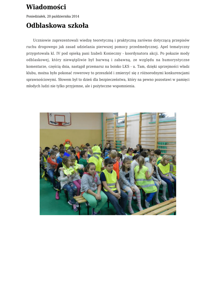 Wiadomości Poniedziałek, 20 października 2014 Odblaskowa szkoła Uczniowie zaprezentowali wiedzę teoretyczną i praktyczną zarówno dotyczącą przepisów ruchu drogowego jak zasad udzielania pierwszej pomocy przedmedycznej. Apel tematyczny przygotowała kl. IV pod opieką pani Izabeli Konieczny - koordynatora akcji. Po pokazie mody odblaskowej, który niewątpliwie był barwną i zabawną, ze względu na humorystyczne komentarze, częścią dnia, nastąpił przemarsz na boisko LKS - u. Tam, dzięki uprzejmości władz klubu, można było pokonać rowerowy to przeszkód i zmierzyć się z różnorodnymi konkurencjami sprawnościowymi. Słowem był to dzień dla bezpieczeństwa, który na pewno pozostawi w pamięci młodych ludzi nie tylko przyjemne, ale i pożyteczne wspomnienia.