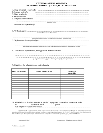 KWESTIONARIUSZ OSOBOWY DLA OSOBY UBIEGAJĄCEJ SIĘ O ZATRUDNIENIE 1. Imię (imiona) i nazwisko .................................................................................................. 2. Imiona rodziców ...................................................................................................... 3. Data urodzenia ...................................................................................................... 4. Obywatelstwo ...................................................................................................... 5. Miejsce zamieszkania ............................................................................................. ............................................................................................................................................ dokładny adres Adres do korespondencji .................................................................................................... ............................................................................................................................................. 6. Wykształcenie ...................................................................................................................... (nazwa szkoły i rok jej ukończenia) ............................................................................................................................................ zawód, specjalność, stopień naukowy, tytuł zawodowy, tytuł naukowy 7. Wykształcenie uzupełniające ................................................................................................ ........................................................................................................................................... ........................................................................................................................................... kurs, studia podyplomowe, data ukończenia nauki lub data rozpoczęcia nauki w przypadku jej trwania 8. Dodatkowe uprawnienia, umiejętności, zainteresowania ……………………………………………………………………………………………… ……………………………………………………………………………………………… ……………………………………………………………………………………………… ( np. stopień znajomości języków obcych, prawo jazdy, obsługa komputera ) 9. Przebieg dotychczasowego zatrudnienia okres zatrudnienia nazwa zakładu pracy zajmowane stanowisko 10. Oświadczam, że dane zawarte w pkt 1- 3 są zgodne z dowodem osobistym seria………… nr ………. …… wydanym dnia ……………przez …………………………………… lub innym dowodem tożsamości…………………………………………………………… Wyrażam zgodę na przetwarzanie moich danych osobowych zawartych w kwestionariuszu osobowym dla osoby ubiegającej się o zatrudnienie dla potrzeb niezbędnych do realizacji procesu rekrutacji (zgodnie z Ustawą z dn. 29.08.97 roku o Ochronie Danych Osobowych Dz. Ust. Nr 133 poz. 883 z późniejszymi zmianami) teraz i w przyszłości do momentu wycofania jej w jakiejkolwiek formie. …………………………………………… ( miejscowość i data ) ___________________ * właściwe podkreślić ………………………………………………… ( podpis osoby ubiegającej się o zatrudnienie )