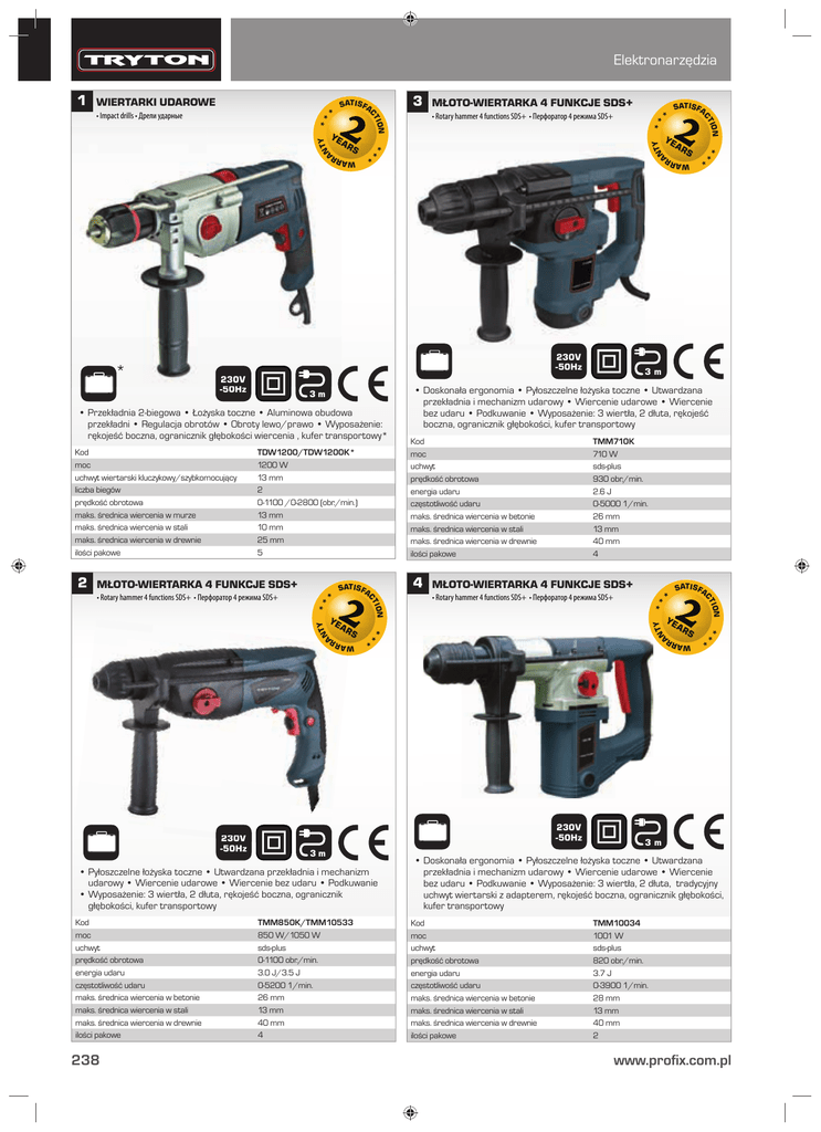 Elektronarzędzia 1 WIERTARKI UDAROWE SATISFA 3 MŁOTO-WIERTARKA 4 FUNKCJE SDS+ SATISFA Y NT Y NT ION CT • Rotary hammer 4 functions SDS+ • Перфоратор 4 режима SDS+ ION CT • Impact drills • Дрели ударные WARR A WARR A 230V -50Hz 230V 50H -50Hz 3m • Przekładnia 2-biegowa • Łożyska toczne • Aluminowa obudowa przekładni • Regulacja obrotów • Obroty lewo/prawo • Wyposażenie: rękojeść boczna, ogranicznik głębokości wiercenia , kufer transportowy* Kod moc uchwyt wiertarski kluczykowy/szybkomocujący liczba biegów prędkość obrotowa maks. średnica wiercenia w murze maks. średnica wiercenia w stali maks. średnica wiercenia w drewnie ilości pakowe 2 TDW1200/TDW1200K* 1200 W 13 mm 2 0-1100 /0-2800 (obr./min.) 13 mm 10 mm 25 mm 5 MŁOTO-WIERTARKA 4 FUNKCJE SDS+ SATISFA • Doskonała ergonomia • Pyłoszczelne łożyska toczne • Utwardzana przekładnia i mechanizm udarowy • Wiercenie udarowe • Wiercenie bez udaru • Podkuwanie • Wyposażenie: 3 wiertła, 2 dłuta, rękojeść boczna, ogranicznik głębokości, kufer transportowy Kod moc uchwyt prędkość obrotowa energia udaru częstotliwość udaru maks. średnica wiercenia w betonie maks. średnica wiercenia w stali maks. średnica wiercenia w drewnie ilości pakowe 4 TMM710K 710 W sds-plus 930 obr./min. 2.6 J 0-5000 1/min. 26 mm 13 mm 40 mm 4 MŁOTO-WIERTARKA 4 FUNKCJE SDS+ SATISFA • Rotary hammer 4 functions SDS+ • Перфоратор 4 режима SDS+ ION CT Y NT ION CT • Rotary hammer 4 functions SDS+ • Перфоратор 4 режима SDS+ 3m Y NT * WARR A WARR A 230V -50Hz 230V -50Hz 3m • Pyłoszczelne łożyska toczne • Utwardzana przekładnia i mechanizm udarowy • Wiercenie udarowe • Wiercenie bez udaru • Podkuwanie • Wyposażenie: 3 wiertła, 2 dłuta, rękojeść boczna, ogranicznik głębokości, kufer transportowy Kod moc uchwyt prędkość obrotowa energia udaru częstotliwość udaru maks. średnica wiercenia w betonie maks. średnica wiercenia w stali maks. średnica wiercenia w drewnie ilości pakowe 238 TMM850K/TMM10533 850 W/1050 W sds-plus 0-1100 obr./min. 3.0 J/3.5 J 0-5200 1/min. 26 mm 13 mm 40 mm 4 3m • Doskonała ergonomia • Pyłoszczelne łożyska toczne • Utwardzana przekładnia i mechanizm udarowy • Wiercenie udarowe • Wiercenie bez udaru • Podkuwanie • Wyposażenie: 3 wiertła, 2 dłuta, tradycyjny uchwyt wiertarski z adapterem, rękojeść boczna, ogranicznik głębokości, kufer transportowy Kod moc uchwyt prędkość obrotowa energia udaru częstotliwość udaru maks. średnica wiercenia w betonie maks. średnica wiercenia w stali maks. średnica wiercenia w drewnie ilości pakowe TMM10034 1001 W sds-plus 820 obr./min. 3.7 J 0-3900 1/min. 28 mm 13 mm 40 mm 2 www.profix.com.pl