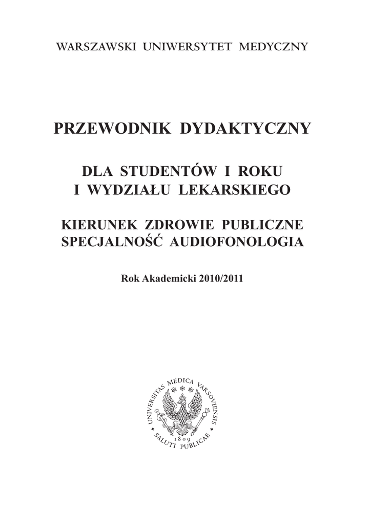 WARSZAWSKI UNIWERSYTET MEDYCZNY PRZEWODNIK DYDAKTYCZNY DLA STUDENTÓW I ROKU I WYDZIAŁU LEKARSKIEGO Kierunek zdrowie publiczne specjalność AUDIOFONOLOGIA Rok Akademicki 2010/2011 Opracowanie edytorskie i druk: Oficyna Wydawnicza Warszawskiego Uniwersytetu Medycznego Zam. 332 / 2010 nakład 50 egz. tel. (22) 5720 327 e-mail: [email protected] www.oficynawydawnicza.wum.edu.pl Koledzy Studenci! Pierwszy rok studiów na Wydziale Lekarskim Warszawskiego Uniwersytetu Medycznego jest dla Was początkiem drogi, która za sześć lat zakończy się uzyskaniem Dyplomu Lekarza. Osiągnięcie tego celu to spełnienie marzeń wszystkich, którzy rozpoczynają studia medyczne. Czas studiów to okres piękny ale i trudny. Wraz z przekroczeniem progu naszej Alma Mater bierzecie na siebie nie tylko prawa, ale i obowiązki studentów, które nie są jeszcze Wam dobrze znane. W tych trudnych początkach będą pomagać Wam władze dziekańskie, pracownicy dziekanatu, nauczyciele akademiccy, samorząd studentów i organizacje studenckie. W czasie pierwszych lat studiów nie będzie wielu okazji do sprawdzenia się w niesieniu pomocy chorym. Jest to jednak okres bardzo ważny, bo poświęcony przede wszystkim naukom podstawowym, których zgłębienie pozwoli potem na łatwe zrozumienie przedmiotów klinicznych. Program jest obszerny, a jego opanowanie będzie wymagało nie tylko zmiany sposobu uczenia się w stosunku do poprzednich lat, ale również dużej mobilizacji i wewnętrznej dyscypliny. Przewodnik Dydaktyczny, który w tej chwili dotarł do Waszych rąk, pozwala na uzyskanie informacji o przedmiotach nauczania, programie zajęć, ich organizacji, a także zasadach i formach ich zaliczania. Przy każdym z przedmiotów podane zostały podręczniki i piśmiennictwo, które pomagają w opanowaniu obowiązujących wiadomości. Dane te, mamy nadzieję, ułatwią przygotowanie się do zajęć i pozwolą na uzyskanie lepszych wyników. Ważną informacją zawartą w przewodniku są nazwiska nauczycieli akademickich odpowiedzialnych za nauczanie danego przedmiotu. Od pierwszych lat studiów zachęcamy do uczestniczenia w pracach Studenckich Kół Naukowych przy zakładach i katedrach. Aktywne uczestnictwo w pracach kół, chociaż zazwyczaj absorbujące czasowo, pozwala nie tylko na rozwinięcie własnych zainteresowań, ale także na nawiązanie bliższych kontaktów z pracownikami naukowymi zakładu, przy którym działa Koło i zdobywanie zazwyczaj najnowszej, nie zawartej jeszcze w podręcznikach wiedzy z danej dziedziny. Władze Dziekańskie zapewniają, że będą otwarte na wszelkie konstruktywne propozycje i uwagi młodzieży akademickiej dotyczące procesu dydaktycznego w Uczelni. Prodziekan ds. I roku Dziekan I Wydziału Lekarskiego Prof. dr hab. Barbara Górnicka Prof. dr hab. Mirosław Wielgoś Spis treści . WŁADZE WARSZAWSKIEGO UNIWERSYTETU MEDYCZNEGO...............5 . PODZIAŁ ROKU AKADEMICKIEGO 2010 / 2011.................................................6 . SKŁAD ZARZĄDU SAMORZĄDU STUDENTÓW WUM W KADENCJI 2010-2012.........................................................................................7 4. PLAN STUDIÓW NA ROK AKADEMICKI 2010/2011.........................................8 5. PATOLOGIA SŁUCHU, GŁOSU, MOWY I RÓWNOWAGI.............................10 6. NAUKA O CZŁOWIEKU.......................................................................................11 7. PROMOCJA ZDROWIA I EDUKACJA ZDROWOTNA....................................14 8. PODSTAWY ZDROWIA PUBLICZNEGO............................................................15 9. ETYKA......................................................................................................................16 0. PRAWO......................................................................................................................17 . SOCJOLOGIA...........................................................................................................18 . OCHRONA ŚRODOWISKA....................................................................................19 . EKONOMIA..............................................................................................................20 4. EKONOMIKA I FINANSOWANIE W OCHRONIE ZDROWIA.......................21 15. ORGANIZACJA I ZARZĄDZANIE W OCHRONIE ZDROWIA......................22 6. UBEZPIECZENIA SPOŁECZNE I ZDROWOTNE..............................................23 17. POLITYKA SPOŁECZNA I ZDROWOTNA........................................................24 8. ZDROWIE ŚRODOWISKOWE...............................................................................25 9. ZABURZENIA POROZUMIEWANIA SIĘ JĘZYKOWEGO...............................26 0. KWALIFIKOWANA PIERWSZA POMOC............................................................27 . ELEMENTY FIZYKI Z ELEKTRONIKĄ.............................................................29 . ELEMENTY MATEMATYKI .................................................................................30 . PROPEDEUTYKA ZDROWIA I CHOROBY.......................................................31 4. JĘZYK OBCY (do wyboru język angielski, francuski, niemiecki lub rosyjski)......32 25. WYCHOWANIE FIZYCZNE...................................................................................34 6. PRZYSPOSOBIENIE BIBLIOTECZNE.................................................................35 27. BEZPIECZEŃSTWO I HIGIENA PRACY.............................................................36 KIERUNEK ZDROWIE PUBLICZNE SPECJALNOŚĆ AUDIOFONOLOGIA RAMOWY PROGRAM PRAKTYKI DLA STUDENTÓW I ROKU AUDIOFONOLOGII Po pierwszym roku studiów obowiązuje studentów 4 tygodniowa (20 dni roboczych) praktyka zawodowa w tym 2 tygodnie ze zdrowia publicznego oraz 2 tygodnie badań słuchu, równowagi i mowy. Termin, miejsce oraz harmonogram praktyki ze zdrowia publicznego oraz praktyki z badań narządu słuchu równowagi i mowy należy ustalić z Kierownikiem/Dyrektorem ośrodka