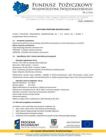 Kielce, 19/08/2015 ZAPYTANIE OFERTOWE SEK/OFE/1/2015 Fundusz Pożyczkowy Województwa Świętokrzyskiego Sp. z o.o. zwraca się z prośbą o przygotowanie oferty cenowej na: 1.1 Przedmiot zamówienia: Opracowanie graficzne oraz produkcja materiałów promocyjnych w formie kalendarzy na rok 2016. Zakres rzeczowy zamówienia: Kody Wspólnego Słownika Zamówień CPV 79342200 - 5 Usługi w zakresie promocji 39294100 - 0 Artykuły informacyjne i promocyjne 1.2 Specyfikacja, ilość i rodzaj materiałów promocyjnych: - Kalendarz tygodniowy 70 szt. Format: 170 x 230 mm (docięty blok książkowy) Ilość stron: 128/1 tydzień = 2 strony Kalendarium: PL-GB-D-RUS + imieniny i święta Druk: 2-kolorowy, granatowo-niebieski, druk offsetowy wysokiej jakości Papier: 80 g/m2, bezchlorowy, kremowy Wykończenie: oprawa szyta, kapitałka i zakładka w kolorze granatowym, część informacyjna, wszyty zeszyt teleadresowy, oprawa miękka, termoprzebarwialna w dotyku przypominająca nubuk, kolor oprawy granatowy; - Kalendarz ścienny trójdzielny 50 szt. Wymiar kalendarza 32 x 86cm Wymiar zdjęcia 32 x 22cm Zdjęcie lakierowane UV oprawione z efektem przestrzennym Kalendarium czterojęzyczne (PL, GB, D, RUS) z numeracja tygodni i imieninami Kalendarz ma pasek z czerwonym przesuwanym okienkiem Kolory świąt czerwone lub granatowe Kartonowa koperta Miejsce na loga, herby i emblematy na dole kalendarza 30 x 9cm 1.3 Warunki szczegółowe zamówienia: na każdym z w/w materiałów promocyjnych znajdować się: > logo, nazwa, adres strony internetowej zamawiającego, > logo Programu Regionalnego Narodowa Strategia Spójności, > herb Województwa Świętokrzyskiego, > emblemat Unii Europejskiej z dopiskiem Europejski Fundusz Rozwoju Regionalnego, > pasek na którym winien być napis ...dla rozwoju Województwo Świętokrzyskiego… > projekt graficzny poszczególnych artykułów z uwzględnieniem logotypów - logo, nazwa, dane teleadresowe Zamawiającego oraz Programu Regionalnego Narodowa Strategia Spójności, herb Województwa Świętokrzyskiego i emblemat Unii Europejskiej z dopiskiem Europejski Fundusz Rozwoju Regionalnego. U dołu powinien znajdować się również pasek, na którym winien być napis ...dla rozwoju Województwa Świętokrzyskiego… . 1.4 Warunki udziału w postępowaniu: - oferta musi obejmować całość zamówienia, oferty częściowe ani wariantowe nie będą brane pod uwagę, - każdy wykonawca przedkłada tylko jedną ofertę, - ofertę należy przygotować w wersji papierowej, - wykonawcy ponoszą wszelkie koszty związane z przygotowaniem i złożeniem oferty, - cena oferty musi uwzględniać wszelkie koszty realizacji usługi, Zamawiający zastrzega sobie prawo do weryfikacji projektów Wykonawcy przed wykonaniem materiałów promocyjnych. 1.5 Miejsce i termin składania ofert: Oferty należy złożyć osobiście lub przesłać pocztą na adres: Fundusz Pożyczkowy Województwa Świętokrzyskiego Sp. z o.o. ul. św. Leonarda 1/14, 25-311 Kielce z dopiskiem: „Oferta na wykonanie gadżetów promocyjnych - nie otwierać do dnia 02.09.2015 do godz. 16.00" w terminie do dnia 2 września 2015r. do godziny 16:00 1.6 Kryteria i sposób oceny ofert: Cena brutto oferty - 100%. 1.7 Inne informacje: Otwarcie ofert nastąpi w dniu 3 września 2015r. o godzinie 12:00. Wybór oferty nastąpi do dnia 3 września 2015r. do końca dnia roboczego. O wynikach oferenci zostaną powiadomieni telefonicznie lub mailowo. Oferty należy składać do dnia 2 września 2015 roku. Dopuszczalne jest złożenie oferty osobiście. Fundusz Pożyczkowy Województwa Świętokrzyskiego Sp. z o.o. zastrzega, że o wyborze Usługodawcy poinformuje firmę, która złoży najkorzystniejszą ofertę i zostanie tym samym wybrana Usługodawcą. 1.8 Osoba do kontaktu: Elżbieta Woźnica - tel. 41-360-02-80; e-mail: [email protected]