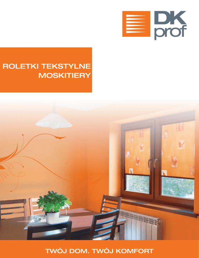 Roletka tekstylna to funkcjonalna i estetyczna zasłona okienna wykonana z tkaniny poliestrowej, podgumowanej, papierowej lub żakardowej. Zapewnia intymność każdego pomieszczenia, a zarazem jest łatwa do zamontowania. Taki rodzaj zasłony to alternatywne rozwiązanie proponowane do regulacji oświetlenia docierającego z zewnątrz, a także ciekawy element dekoracji wnętrz. Bogata kolekcja roletek DK-prof obejmująca kilkadziesiąt wzorów i kolorów tkanin, pozwala na idealne kompozycje zarówno we wnętrzach mieszkaniowych, jak i użytkowych. Jednocześnie podkreśla indywidualny charakter każdego pomieszczenia. DK-prof do produkcji roletek używa tylko najnowszej generacji tkanin, które są impregnowane i antystatyczne, dzięki czemu łatwo je utrzymać w czystości. Oferta obejmuje kilka systemów, co pozwala na maksymalne dostosowanie asortymentu do potrzeb Klienta. System MAJA Roletki MAJA to niezwykle proste w montażu, wolnowiszące zasłony okienne do zamontowania bezpośrednio na ramie okiennej. Zaletą tego systemu jest niewielki rozmiar mechanizmu oraz niska cena. System BLANKA Blanka to elegancki i zarazem nowoczesny rodzaj zasłon okiennych. Prosty i wygodny w obsłudze mechanizm łańcuszkowy pozwala na płynne i ciche sterowanie roletką, a bogaty wybór tkanin sprawia, że roletki BLANKA są bardzo popularną formą zasłon. Można ją zamontować do skrzydła okna lub poza otworem do ściany lub sufitu. Wzmocniona konstrukcja roletki sprawia, że mogą być przeznaczone do zasłaniania większych powierzchni np. witryn sklepowych czy wnęk okiennych. System VERA roletki w tym systemie, po zamontowaniu, stanowią integralną część okna. Mechanizm roletki ukryty jest w dyskretnej kasetce, która montowana jest do skrzydła okiennego w świetle szyby. Dodatkowo roleta wyposażona jest w prowadnice przyklejone do skrzydła okiennego, co zapewnia stabilność i pozwala na swobodne korzystanie z funkcji okna. Kasetka, poza walorami estetycznymi, spełnia także funkcję ochronną dla materiału. System NINA Atutem tego systemu jest możliwość montażu kasetki i prowadnic na skrzydle okiennym za pomocą taśmy klejącej, co nie wymaga ingerencji w ramę okna. Elementy te montowane są poza światłem szyby. Zastosowany system prowadnic zapewnia stabilność i pozwala na swobodne korzystanie z funkcji okna. System IGA Roletki w kasetkach IGA posiadają wszystkie cechy roletek w systemie NINA. Dodatkowym atutem, ze względu na większą pojemność kasetki, jest możliwość stosowania tego systemu do większych okien i drzwi balkonowych oraz szersza paleta kolorystyczna kasetek i prowadnic. System LUISA Roletki w systemie LUISA, w przeciwieństwie do innych roletek w kasetkach, montowane są bezpośrednio na ścianie lub na suficie. Doskonale sprawdzają się do zasłaniania większych powierzchni takich jak witryny sklepowe, wnęki okienne. W roletkach LUISA, oprócz obsługi za pomocą klasycznego mechanizmu łańcuszkowego, można stosować sprężynę lub silnik elektryczny. Moskitiery są skutecznym, coraz bardziej popularnym, a jednocześnie estetycznym rozwiązaniem, stosowanym do zabezpieczania przed owadami, gryzoniami oraz różnego rodzaju pyłkami, a nawet nadmiernym promieniowaniem słonecznym. Składają się z aluminiowej ramy i naciągniętej siatki antyinsektowej. Jest to idealne rozwiązanie do zastosowania zarówno w mieszkaniach, jak i obiektach użyteczności publicznej np. w szpitalach, ośrodkach wczasowych itp. Mogą być montowane do okien, drzwi, okien balkonowych oraz drzwi tarasowych. Proste w montażu, wykonane z estetycznej, trwałej siatki, doskonale spełniają funkcję ochronną. Moskitiera zwijana w skrzynce roletowej - jest to bardzo praktyczne rozwiązanie, ponieważ w systemie tym moskitiera i roleta mieszczą się w jednej skrzynce (moskitiera znajduje się pomiędzy pancerzem rolety, a oknem). Duża zaletą tego rozwiązania jest dyskretnie ukryty wałek, na który zwijana jest siatka moskitiery. Ten rodzaj moskitiery może być montowany w następujących systemach rolet: • Zewnętrzny Owal, • Zewnętrzny Standard, • Integro, • Nadstawny DUO. Dostępne kolory siatki: szary, czarny (w systemie Nadstawnym DUO, tylko kolor szary). Moskitiera zwijana – może być montowana do ściany, sufitu lub ramy okna. Siatka zwijana jest do estetycznej kasetki, która nie zajmuje wiele miejsca. Dostępne kolory siatki: szary. Dostępne kolory skrzynek: biały i brązowy. Moskitiery drzwiowe - stosowane są najcześciej do drzwi balkonowych. Moskitiera montowana jest na zawiasach i otwierana na zewnatrz. Dostępne kolory siatki: szary i czarny. 1 Moskitiera ramkowa – montowana jest na ościeżnicę za pomocą specjalnych zaczepów. Dużym atutem tego systemu jest to, że moskitierę można bardzo łatwo założyć np. tylko na okres letni, a następnie w kilkaście sekund zdemontować. Dostępne kolory siatki: szary, czarny. 4 KOLORY RAMEK MOSKITIER 2 3 1 - orzech (brąz RAL - 8028), 2 - czekoladowy (brąz RAL - 8017), 3 - złoty dąb (RAL - 8003), 4 - ciemny brąz (brąz RAL - 8022). Ramki dostępne również w kolorze białym (RAL 9016). Punkt sprzedaży WYDANIE 1/07-08/PL Produkty prezentowane w materiale zdjęcowym niejednokrotnie posiadają wyposażenie specjalne i nie zawsze są zgodne z wykonaniem standardowym. Wszelkie prawa zastrzeżone. Powielanie i wykorzystywanie, również częściowe, tylko za zgodą firmy DK-prof. Producent zastrzega sobie prawo do dokonywania zmian.
