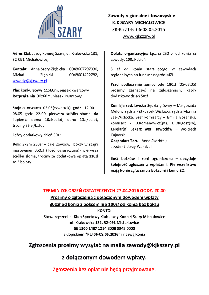 Zawody regionalne i towarzyskie KJK SZARY MICHAŁOWICE ZR-B i ZT-B 06-08.05.2016 www.kjkszary.pl Adres Klub Jazdy Konnej Szary, ul. Krakowska 131, 32-091 Michałowice, Opłata organizacyjna łączna 250 zł od konia za zawody, 100zł/dzień Kontakt Anna Szary-Ziębicka Michał Ziębicki [email protected] 5 zł od konia startującego w regionalnych na fundusz nagród MZJ 0048607797030, 0048601422782, Plac konkursowy 55x80m, piasek kwarcowy Rozprężalnia 30x60m, piasek kwarcowy Stajnia otwarta 05.05(czwartek) godz. 12.00 – 08.05 godz. 22.00, pierwsza ściółka słoma, do kupienia słoma 10zł/balot, siano 10zł/balot, trociny 55 zł/balot każdy dodatkowy dzień 50zł Boks 3x3m 250zł – całe Zawody, boksy w stajni murowanej 350zł (ilość ograniczona)- pierwsza ściółka słoma, trociny za dodatkową opłatą 110zł za 2 baloty zawodach Prąd podłączenie samochodu 180zł (05-08.05) prosimy zaznaczyć na zgłoszeniach, każdy dodatkowy dzień 50zł Komisja sędziowska Sędzia główny – Małgorzata Melon, sędzia PZJ - Jacek Wisłocki, sędzia Monika Sas-Wisłocka, Szef komisarzy – Emilia Bożańska, komisarz - B.Romanowicz(pt), B.Długosz(sb), J.Kielar(n) Lekarz wet. zawodów – Wojciech Kujawski Gospodarz Toru - Anna Skorbtal; asystent- Jerzy Wandzel Ilość boksów i koni ograniczona – decyduje kolejność zgłoszeń z wpłatami. Pierwszeństwo mają konie zgłaszane z boksami i konie ZO. TERMIN ZGŁOSZEŃ OSTATECZNYCH 27.04.2016 GODZ. 20.00 Prosimy o zgłoszenia z dołączonym dowodem wpłaty 300zł od konia z boksem lub 100zł od konia bez boksu KONTO: Stowarzyszenie - Klub Sportowy Klub Jazdy Konnej Szary Michałowice ul. Krakowska 131, 32-091 Michałowice 66 1500 1487 1214 8008 3948 0000 z dopiskiem "PLJ 06-08.05.2016" i nazwą konia Zgłoszenia prosimy wysyłać na maila [email protected] z dołączonym dowodem wpłaty. Zgłoszenia bez opłat nie będą przyjmowane. Wymagane dokumenty Konie szczepienia ochronne przeciwko grypie koni, aktualne licencje zgodne z przepisami MZJ/PZJ (tylko zawody regionalne) . Paszport musi być dostarczony do Biura Zawodów przed pierwszym startem. Ewentualna opłata za start jednorazowy konia musi być wykupiona w MZJ przed zawodami. Zawodnicy z. regionalne - aktualne badania lekarskie, ubezpieczenie oraz aktualne licencje; z. towarzyskie aktualne badanie lekarskie, ubezpieczenie, w przypadku niepełnoletnich zgoda rodziców na start. KONKURS NIEDZIELA 8.00 SOBOTA 8.00 PIĄTEK 8.00 1r LL60 Sprawdzanie dokumentów czwartek 05.05.2016, godz. 18.00-20.00. i na godzinę przed rozpoczęciem konkursów. Organizator nie zwraca opłat za konie w wypadku wycofania po ostatecznym terminie zgłoszeń. Organizator zastrzega sobie prawo do zmian w programie. Organizator nie ponosi żadnej odpowiedzialności w razie wypadków i zachorowań zawodników, luzaków, koni, jak również w przypadku kradzieży, zniszczeń, pożarów i innych zdarzeń losowych. W przypadku złych warunków atmosferycznych organizator zastrzega sobie prawo przeniesienia zawodów na hale. WYS. (cm) RODZAJ KONKURSU PULA NAGRÓD (zł) 60 cm Zwykły 238.2.1 100zł –nagrody rzeczowe (50/25/25) 2r LL80 80 cm 3r 4r L P 100 cm 110 cm TOWARZYSKI A - Zwykły 238.2.1 TOWARZYSKI Zwykły 238.2.1 Zwykły 238.2.1 8r LL60 60 cm Zwykły 238.2.1 9r LL80 80 cm 10r L 100 cm TOWARZYSKI A - Zwykły 238.2.1 TOWARZYSKI Zwykły 238.2.1 12r P 110 cm Dwufazowy 274.5.3 16r LL60 60 cm Zwykły 238.2.1 17r LL80 80 cm 18r L 100 cm TOWARZYSKI A - Zwykły 238.2.1 TOWARZYSKI Zwykły 238.2.1 ŁĄCZNIE 4 300 zł 100zł –nagrody rzeczowe (50/25/25) 100zł –nagrody rzeczowe (50/25/25) 100zł –nagrody rzeczowe(50/25/25) 100zł –nagrody rzeczowe(50/25/25) 100zł –nagrody rzeczowe(50/25/25) 200zł –nagrody rzeczowe (50/50/25/25/25/25) 200zł –nagrody rzeczowe (50/50/25/25/25/25) 100zł –nagrody rzeczowe (50/25/25) 100zł –nagrody rzeczowe(50/25/25) 200zł –nagrody rzeczowe (50/50/25/25/25/25) 19r P 110 cm Zwykły 238.2.1 200zł –nagrody rzeczowe (50/50/25/25/25/25) Wszystkich skreśleń z listy startowej należy dokonywać na minimum 30 minut przed rozpoczęciem konkursu. Wszyscy zawodnicy, którzy tego nie zrobią zostaną ukarani karą 20zł za każdy brak skreślenia. Flots dla 25 % uczestników każdego konkursu. Dekoracja 6 pierwszych par po zakończeniu każdego konkursu. Protesty: wyłącznie na piśmie z dołączeniem kaucji 200 zł. W NIEDZIELĘ 08.05 każdy koń ma prawo startu 1 raz. NA TERENIE OŚRODKA PSY MOGĄ PORUSZAĆ SIĘ TYLKO NA SMYCZY. WŁAŚCICIEL ZOBOWIĄZANY JEST DO SPRZĄTANIA PO SWOIM PUPILU I ODPOWIADA ZA SZKODY WYRZĄDZONE PRZEZ ZWIERZĘ. KODEKS POSTĘPOWANIA Z KONIEM Polski Związek Jeździecki prosi wszystkie osoby zaangażowane w jakikolwiek sposób w sporty konne, o przestrzeganie poniżej przedstawionego kodeksu oraz zasady, że dobro konia jest najważniejsze. Dobro konia musi być zawsze i wszędzie uwzględniane w sportach konnych i nie może być podporządkowane współzawodnictwu sportowemu ani innym celom np. komercyjnym. I. Na wszystkich etapach treningu i przygotowań konia do startu w zawodach, dobro konia musi stać ponad wszelkimi innymi wymaganiami. Dotyczy to stałej opieki, metod treningu, starannego obrządku, kucia i transportu. II. Konie i jeźdźcy muszą być wytrenowani, kompetentni i zdrowi zanim wezmą udział w zawodach. Odnosi się to także do podawania leków i środków medycznych, zabiegów chirurgicznych zagrażających dobru konia lub ciąży klaczy, oraz do przypadków nadużywania pomocy. III. Zawody nie mogą zagrażać dobru konia. Wymaga to zwrócenia szczególnej uwagi na teren zawodów, powierzchnię podłoża, pogodę, warunki stajenne, kondycję koni i ich bezpieczeństwo także podczas podroży powrotnej z zawodów. IV. Należy dołożyć wszelkich starań, aby zapewnić koniom staranną opiekę po zakończeniu zawodów, a także humanitarne traktowanie po zakończeniu kariery sportowej. Dotyczy to właściwej opieki 