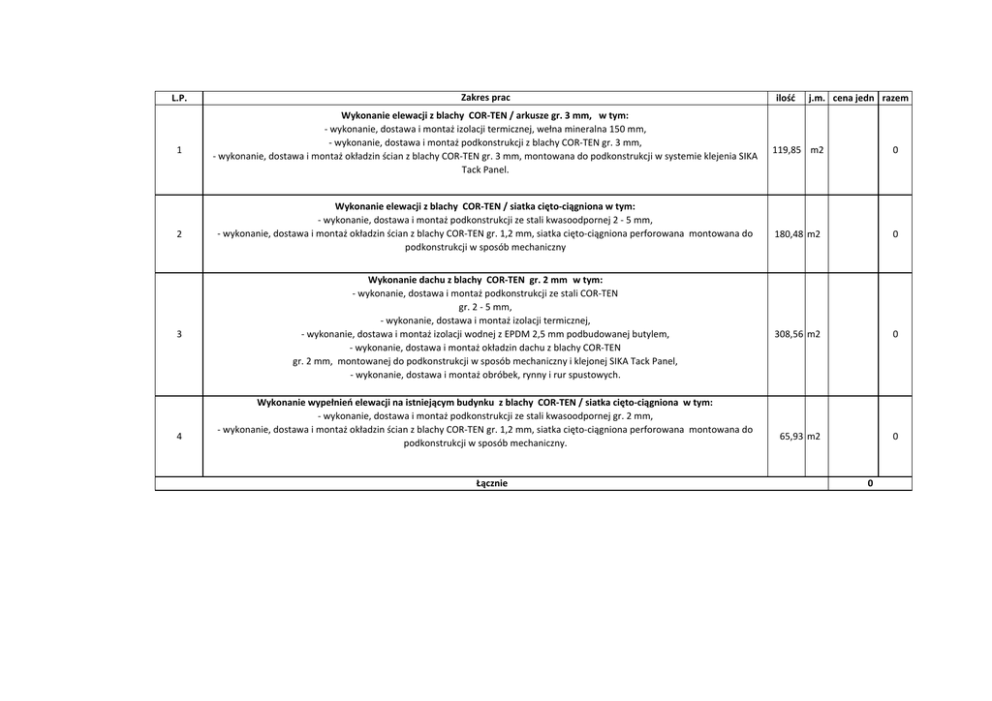 L.P. 1 2 3 4 Zakres prac ilość j.m. cena jedn razem Wykonanie elewacji z blachy COR‐TEN / arkusze gr. 3 mm, w tym: ‐ wykonanie, dostawa i montaż izolacji termicznej, wełna mineralna 150 mm, ‐ wykonanie, dostawa i montaż podkonstrukcji z blachy COR‐TEN gr. 3 mm, 119,85 m2 ‐ wykonanie, dostawa i montaż okładzin ścian z blachy COR‐TEN gr. 3 mm, montowana do podkonstrukcji w systemie klejenia SIKA Tack Panel. 0 Wykonanie elewacji z blachy COR‐TEN / siatka cięto‐ciągniona w tym: ‐ wykonanie, dostawa i montaż podkonstrukcji ze stali kwasoodpornej 2 ‐ 5 mm, ‐ wykonanie, dostawa i montaż okładzin ścian z blachy COR‐TEN gr. 1,2 mm, siatka cięto‐ciągniona perforowana montowana do 180,48 m2 podkonstrukcji w sposób mechaniczny 0 Wykonanie dachu z blachy COR‐TEN gr. 2 mm w tym: ‐ wykonanie, dostawa i montaż podkonstrukcji ze stali COR‐TEN gr. 2 ‐ 5 mm, ‐ wykonanie, dostawa i montaż izolacji termicznej, ‐ wykonanie, dostawa i montaż izolacji wodnej z EPDM 2,5 mm podbudowanej butylem, 308,56 m2 ‐ wykonanie, dostawa i montaż okładzin dachu z blachy COR‐TEN gr. 2 mm, montowanej do podkonstrukcji w sposób mechaniczny i klejonej SIKA Tack Panel, ‐ wykonanie, dostawa i montaż obróbek, rynny i rur spustowych. Wykonanie wypełnień elewacji na istniejącym budynku z blachy COR‐TEN / siatka cięto‐ciągniona w tym: ‐ wykonanie, dostawa i montaż podkonstrukcji ze stali kwasoodpornej gr. 2 mm, ‐ wykonanie, dostawa i montaż okładzin ścian z blachy COR‐TEN gr. 1,2 mm, siatka cięto‐ciągniona perforowana montowana do podkonstrukcji w sposób mechaniczny. Łącznie 0 65,93 m2 0 0