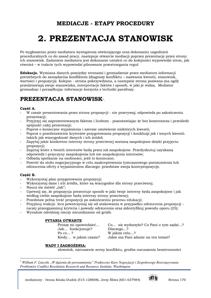 MEDIACJE - ETAPY PROCEDURY 2. PREZENTACJA STANOWISK Po wygłoszeniu przez mediatora wystąpienia otwierającego oraz dokonaniu uzgodnień proceduralnych co do zasad pracy, następuje otwarcie mediacji poprzez prezentację przez strony ich stanowisk. Zadaniem mediatora jest dokonanie ustaleń co do kolejności wypowiedzi stron, jak również – w trakcie tych wypowiedzi pilnowanie przestrzegania reguł Edukacja. Wymiana danych pomiędzy stronami i gromadzenie przez mediatora informacji potrzebnych do zarządzenia konfliktem (diagnozy konfliktu – nazwania kwestii, stanowisk, wartości i propozycji). Kolejno - strona pokrzywdzona, a następnie strona pozwana (na ogół) przedstawiają swoje stanowiska, interpretacje faktów i sposób, w jaki je widzą. Mediator gromadząc i porządkując informacje korzysta z techniki parafrazy. PREZENTACJA STANOWISK1. Część A. - W czasie prezentowania przez stronę propozycji - nie przerywaj; odpowiedz po zakończeniu prezentacji; - Przyjrzyj się zaprezentowanym faktom i liczbom - pozostawiając że bez komentarza i prześledź spójność całej prezentacji; - Poproś o konieczne wyjaśnienia i szersze omówienie niektórych kwestii; - Poproś o przedstawienie kryteriów przygotowania propozycji i konkluzji jak i innych kwestii. takich jak wiarygodność danych i ich źródeł; - Zapytaj jakie konkretne interesy strony przeciwnej zostaną zaspokojone dzięki przyjęciu propozycji; - Zapytaj które z twoich interesów będą przez niż zaspokojone. Przedyskutuj uzyskaną odpowiedź i przyczyny zaspokojenia lub nie zaspokojenia interesów; - Odbędą spotkanie na osobności, jeśli to konieczne; - Powróć do stołu negocjacyjnego w celu zaakceptowania tymczasowego porozumienia lub odrzucenia oferty z wyjaśnieniem dlaczego: przedstaw swoją kontrpropozycję. Część B. - Wykorzystaj plan przygotowania propozycji; - Wykorzystaj dane i ich źródła, które są wiarygodne dla strony przeciwnej; - Naucz się mówić „tak”; - Upewnij się, że propozycja prezentuje sposób w jaki twoje interesy będą zaspokojone i jak według ciebie zaspokojone będą interesy strony przeciwnej; - Przedstaw pełną treść propozycji po zakończeniu procesu edukacji; - Przyjmuj reakcje. lecz powstrzymaj się od atakowania w przypadku odrzucenia propozycji raczej przeegzaminuj kryteria i powody odrzucenia oraz zidentyfikuj powodu oporu (25); - Wyraźnie odróżniaj rzeczy nieuniknione od gróźb. PYTANIA OTWARTE Proszę mi opowiedzieć... Jak... funkcjonuje? Po co... ? Kiedy... w jakim czasie? Co... się wydarzyło? Co Pani o tym sądzi...? Dlaczego...? W jakim celu...? Jakie ma Pani zdanie na ten temat? WADY I ZAGROŻENIA: słowotok, naruszenie areny konfliktu, groźba naruszenia bezstronności William F. Lincoln „W dążeniu do porozumienia” Praktyczny Kurs Negocjacji i Zespołowego Rozwiązywania Problemów Conflict Resolution Research and Resource Institute, Washington 1 mediatorzy - Iwona Kitala-Dudek (515-128808), Jerzy Śliwa (601-637984) Strona 170