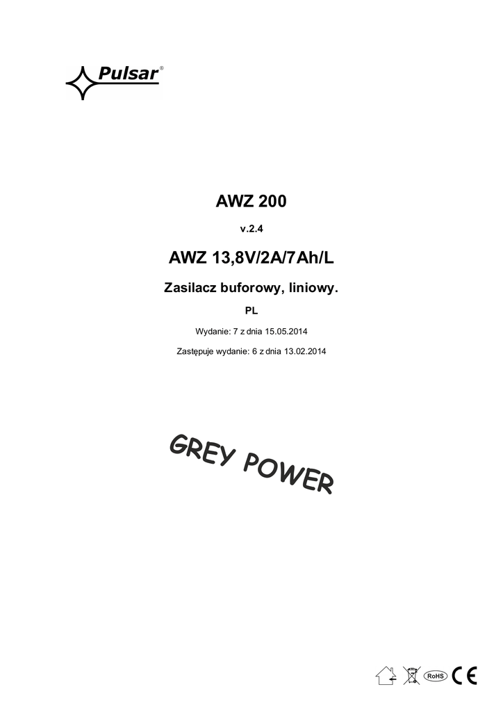 AWZ 200 v.2.4 AWZ 13,8V/2A/7Ah/L Zasilacz buforowy, liniowy. PL Wydanie: 7 z dnia 15.05.2014 Zastępuje wydanie: 6 z dnia 13.02.2014 GRE Y POW ER www.pulsar.pl GREY POWER AWZ200 Cechy zasilacza: bezprzerwowe zasilanie 13,8VDC/2A miejsce na akumulator 7Ah/12V napięcie zasilania 230VAC liniowy stabilizator napięcia ochrona akumulatora przed nadmiernym rozładowaniem (UVP) kontrola ładowania i konserwacji akumulatora zabezpieczenie wyjścia akumulatora przed zwarciem i odwrotnym podłączeniem prąd ładowania akumulatora 0,3A sygnalizacja optyczna LED zabezpieczenia: przeciwzwarciowe SCP przeciążeniowe OLP termiczne OHP przepięciowe antysabotażowe gwarancja – 5 lat od daty produkcji SPIS TREŚCI: 1. Opis techniczny. 1.1. Opis ogólny 1.2. Schemat blokowy 1.3. Opis elementów i złącz zasilacza 1.4. Parametry techniczne 2. Instalacja. 2.1. Wymagania 2.2. Procedura instalacji 3. Sygnalizacja pracy zasilacza. 3.1. Sygnalizacja optyczna 3.2. Wyjścia techniczne 4. Obsługa oraz eksploatacja. 4.1. Przeciążenie lub zwarcie wyjścia zasilacza 4.2. Praca bateryjna 4.3. Konserwacja 1. Opis techniczny. 1.1. Opis ogólny. Zasilacz buforowy przeznaczony jest do nieprzerwanego zasilania urządzeń systemów alarmowych wymagających stabilizowanego napięcia 12V DC (+/-15%). Zastosowany w urządzeniu liniowy układ stabilizacyjny dostarcza napięcia o mniejszym poziomie szumów i krótszym czasie odpowiedzi na zakłócenie, niż w przypadku stosowania stabilizatora impulsowego. Zasilacz dostarcza napięcia przy pracy buforowej Uout = 12,8V ÷ 13,8V DC o sumarycznej wydajności prądowej: 1. Prąd wyjściowy 2A (bez akumulatora) 2. Prąd wyjściowy 1,7A + 0,3A ładowanie akumulatora Sumaryczny prąd odbiorników + akumulator wynosi max 2A W przypadku zaniku napięcia sieciowego następuje natychmiastowe przełączenie na zasilanie akumulatorowe. Akumulator zasilacza jest chroniony przed nadmiernym rozładowaniem (UVP). Zasilacz umieszczony jest w obudowie metalowej z miejscem na akumulator 7Ah/12V. Zasilacz wyposażony jest w mikroprzełącznik(TAMPER) sygnalizujący otwarcie drzwiczek (czołówki). UWAGA! W przypadku zastosowania zasilacza do zasilania urządzeń CCTV, KD, SSWiN oraz innych urządzeń o podobnym charakterze wymagane jest zastosowanie modułu zabezpieczenia nadnapięciowego MZN1 w obwodzie wyjścia zasilania DC. 2 www.pulsar.pl GREY POWER AWZ200 1.2. Schemat blokowy (rys.1). Rys. 1. Schemat blokowy zasilacza. 1.3. Opis elementów i złącz zasilacza. Tabela 1. Elementy płyty pcb zasilacza (patrz rys. 2). Element nr Opis [1] Złącze: wejście zasilania AC– podłączenie fabryczne [2] FBAT bezpiecznik w obwodzie akumulatora – F4A [3] P1 potencjometr, regulacja napięcia DC w zakresie 12V÷ 14,5V [4], [5] [6] [7] [8] Sygnalizacja optyczna LED: AC – dioda LED sygnalizująca obecność napięcia AC AUX – dioda LED sygnalizująca obecność napięcia wyjściowego DC Złącza: +BAT- Wyjście zasilania DC akumulatora, (+BAT= czerwony, -BAT = czarny) +AUX- Wyjście zasilania DC, (+AUX= +U, -AUX=GND) TAMPER - styki wyłącznika antysabotażowego - NC PBAT; zworka - konfiguracja funkcji ochrony akumulatora UVP PBAT = funkcja ochrony (odłączenia) akumulatora wyłączona PBAT = funkcja ochrony (odłączenia) akumulatora włączona - str.7 pkt.4.2 START – przycisk (uruchomienie zasilacza z akumulatora) - str.7 pkt.4.2 Rys. 2. Widok płyty pcb zasilacza. 3 www.pulsar.pl GREY POWER AWZ200 Tabela 2. Elementy zasilacza (patrz rys. 3). Element nr Opis [1] Transformator separacyjny [2] Płyta zasilacza (tab. 1, rys. 2) TAMPER; mikrowyłącznik (styki) ochrony antysabotażowej (NC) [3] [4] [5] [6] FMAIN bezpiecznik w obwodzie zasilania (230V/AC) L-N zacisk zasilania 230V/AC, Zacisk ochronny PE Konektory akumulatora: +BAT = czerwony, - BAT = czarny Rys.3. Widok zasilacza. 1.4. Parametry techniczne: - parametry elektryczne (tab.3) - parametry mechaniczne (tab.4) - bezpieczeństwo użytkowania (tab.5) - parametry eksploatacyjne (tab.6) Parametry elektryczne (tab. 3). Typ zasilacza: Napięcie zasilania Pobór prądu Częstotliwość zasilania Moc zasilacza Napięcie wyjściowe Prąd wyjściowy Zakres regulacji napięcia wyjściowego Napięcie tętnienia Pobór prądu przez układy zasilacza Prąd ładowania akumulatora Zabezpieczenie przed zwarciem SCP A (EPS - External Power Source) 230V/AC (-10%/+10%) 0,28 A max. 50Hz 28 W 12,8V ÷ 13,8V DC – praca buforowa 2A (bez akumulatora) 1,7A + 0,3A ładowanie akumulatora 12V ÷ 14,5V 20 mV p-p max. 5 mA – praca bateryjna 1,4A (max.) 0,3A /24h (Iśr/24h) 200% ÷ 250% mocy zasilacza - ograniczenie prądu i/lub 4 www.pulsar.pl GREY POWER AWZ200 Zabezpieczenie przed przeciążeniem OLP Zabezpieczenie w obwodzie akumulatora SCP i odwrotna polaryzacja podłączenia Zabezpieczenie akumulatora przed nadmiernym rozładowaniem UVP Wyjście techniczne: - TAMPER; wyjście sygnalizujące otwarcie obudowy zasilacza Bezpiecznik FBAT Bezpiecznik FMAIN uszkodzenie bezpiecznika topikowego w obwodzie akumulatora (wymaga wymiany wkładki topikowej) 110% ÷ 150% (@65 ºC ÷25ºC) mocy zasilacza ograniczenie prądu poprzez bezpiecznik powracalny PTC, ponowne uruchomienie ręczne (awaria wymaga odłączenie obwodu wyjściowego DC) F4A- ograniczenie prądu, bezpiecznik topikowy FBAT (awaria wymaga wymiany wkładki topikowej) U<10 V (± 5%) – odłączenie (-BAT) akumulatora - mikrowyłącznik , styki NC (obudowa zamknięta), 0,5A@50V DC (max.) F4A / 250V T500mA / 250V Parametry mechaniczne (tab. 4). Wymiary obudowy 200 x 230 x 80+8 (WxHxD) [mm] (+/- 2) Mocowanie 175 x 203 x Φ 6 x 4szt (WxH) Miejsce na akumulator 7Ah/12V (SLA) max. H W 165x100x75mm (WxHxD) max D Waga netto/brutto 2,5 / 2,7 kg Obudowa Blacha stalowa DC01 0,8mm, kolor RAL9003 Zamykanie Wkręt walcowy (z czoła) Złącza Wyjścia: Ф0,51÷2,5 (AWG 24-12) Wyjścia akumulatora BAT: 6,3F-0,75, 19cm Bezpieczeństwo użytkowania (tab.5). Klasa ochronności PN-EN 60950-1:2007 Stopień ochrony PN-EN 60529