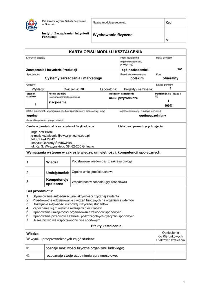 Państwowa Wyższa Szkoła Zawodowa w Gnieźnie Nazwa modułu/przedmiotu Instytut Zarządzania i Inżynierii Produkcji Wychowanie fizyczne Kod A1 KARTA OPISU MODUŁU KSZTAŁCENIA Kierunek studiów Profil kształcenia Rok / Semestr (ogólnoakademicki, praktyczny) Zarządzanie i Inzynieria Produkcji Specjalność Przedmiot oferowany w języku: Systemy zarządzania i marketingu polskim Wykłady: I Kurs (obligatoryjny/obieralny) obieralny Liczba punktów Godziny Stopień studiów: 1/2 ogólnoakademicki Ćwiczenia: 30 Laboratoria: Forma studiów (stacjonarna/niestacjonarna) 1 Projekty / seminaria: Obszar(y) kształcenia nauki przyrodnicze Podział ECTS (liczba i %) 1 100% stacjonarne Status przedmiotu w programie studiów (podstawowy, kierunkowy, inny) (ogólnouczelniany, z innego kierunku) Liczba punktów ogólny ogólnouczelniany Jednostka prowadząca przedmiot: xx Osoba odpowiedzialna za przedmiot / wykładowca: xxxzajęcia: Lista osób prowadzących mgr Piotr Brenk e-mail: [email protected] tel. 61 424 29 42 Instytut Ochrony Środowiska ul. Ks. S. Wyszyńskiego 38, 62-200 Gniezno Wymagania wstępne w zakresie wiedzy, umiejętności, kompetencji społecznych: Podstawowe wiadomości z zakresu biologii 1 Wiedza: 2 Umiejętności: Ogólne umiejętności ruchowe 3 Kompetencje społeczne Współpraca w zespole (gry zespołowe) Cel przedmiotu: 1. Stymulowanie autoedukacujnej aktywności fizycznej studenta 2. Prozdrowotne oddziaływanie ćwiczeń fizycznych na organizm studentów 3. Rozwijanie aktywności ruchowej i fizycznej studentów 4. Zapoznanie się z wieloma rodzajami gier i zabaw 5. Opanowanie umiejętności organizowania zawodów sportowych 6. Opanowanie przepisów z zakresu poszczególnych dyscyplin sportowych 7. Uczestnictwo we współzawodnictwie sportowym Efekty kształcenia Wiedza. W wyniku przeprowadzonych zajęć student: 01 poznaje możliwości fizyczne organizmu ludzkiego; 02 rozpoznaje swoje uzdolnienia sprawnościowe. Odniesienie do Kierunkowych Efektów Kształcenia 1 Państwowa Wyższa Szkoła Zawodowa w Gnieźnie Nazwa modułu/przedmiotu Instytut Zarządzania i Inżynierii Produkcji Wychowanie fizyczne A1 Odniesienie do Kierunkowych Efektów Kształcenia Umiejętności. W wyniku przeprowadzonych zajęć student potrafi: 01 wykonywać podstawowe ćwiczenia fizyczne; 02 czynnie uczestniczyć w grach zespołowych. Kompetencje społeczne. W wyniku przeprowadzonych zajęć student zdobędzie następujące kompetencje: 01 02 Kod Odniesienie do Kierunkowych Efektów Kształcenia rozumie potrzebę dbałości o rozwój fizyczny organizmu; K_K01 potrafi współdziałać w grupie przyjmując w niej różne role. K_K07 Sposoby sprawdzenia efektów kształcenia Ćwiczenia: Sprawdziany z umiejętności piłki siatkowej i koszykowej oraz frekwencja studentów podczas zajęć. Treści programowe Prowadzenie zajęć z gier sportowych – piłka siatkowa i piłka koszykowa. Piłka siatkowa: 1. Technika postawy wysokiej, poruszania się po boisku, przyjęcia z podaniem sposobem oburącz górnym w postawie wysokiej, przyjęcia z podaniem sposobem oburącz dolnym w postawie wysokiej 2. Zagrywki, wystawienia piłki, zbicia sposobem tenisowym, zastawianie, odbicia piłki w postawie niskiej i o zachwianej równowadze 3. Taktyka indywidualna i zespołowa. Ustawienia przy zagrywce własnej i pzy zagrywce przeciwnika. 4. Przepisy gry Piłka koszykowa: 1. Poruszanie się po boisku w ataku i w obronie; bieg, start, zatrzymanie, zmiana kierunku i tempa biegu, wyskok 2. Technika chwytów i podań piłki, rzutów z miejsca, z półdystansu, w biegu prawą i lewą ręką, kozłowanie, zwody 3. Taktyka indywidualna w ataku i obronie, atak szybki, pozycyjny, obrona zespołowa 4. Przepisy gry Literatura podstawowa: Literatura uzupełniająca: Obciążenie pracą studenta forma aktywności godzin ECTS 2 Państwowa Wyższa Szkoła Zawodowa w Gnieźnie Nazwa modułu/przedmiotu Instytut Zarządzania i Inżynierii Produkcji Wychowanie fizyczne Kod A1 Łączny nakład pracy 35 1 Zajęcia wymagające indywidualnego kontaktu z nauczycielem 30 1 - - Zajęcia o charakterze praktycznym 3