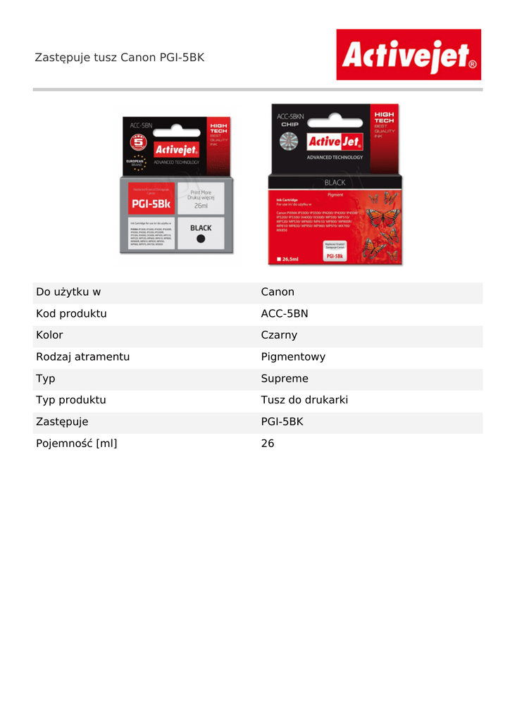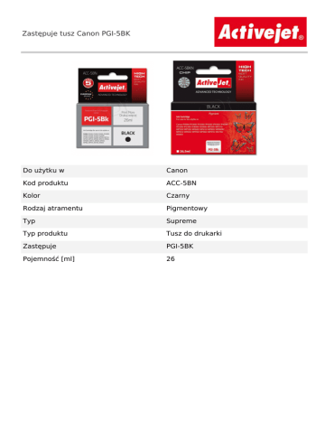 Zastępuje tusz Canon PGI-5BK Do użytku w Canon Kod produktu ACC-5BN Kolor Czarny Rodzaj atramentu Pigmentowy Typ Supreme Typ produktu Tusz do drukarki Zastępuje PGI-5BK Pojemność [ml] 26