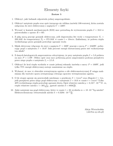 Elementy fizyki Zestaw 5 1. Obliczyć, jaki ładunek odpowieda jednej amperogodzinie. 2. Obliczyć natężenie prądu oraz opór żarzącego sie włókna żarówki 100-watowej, która została załączona do sieci elektrycznej o napięciu U = 220V . 3. Wyrazić w koniach mechanicznych (KM) moc potrzebną do wytworzenia prądu I = 10A w przewodniku o oporze R = 6Ω. 4. Z jaką mocą pracuje grzejnik elektryczny, jeśli doprowadza litr wody o temperaturze T1 = 293.16K do temperaturzy T2 = 373.16K w czasie t = 10min. Zakładamy, że połowa ciepła wydzielanego przez grzejnik powoduje ogrzanie wody. 5. Silnik eletryczny włączony do sieci o napięciu U = 220V pracuje z mocą P = 1840W , pobierając prąd o natężeniu I = 10A? Jaki procent energii dostarczanej przez sieć wykorzystuje ten silnik? 6. Z danych katalogowych amperomierza odczytujemy, że przy natężeniu prądu I = 5A pobiera on moc P = 1.5W . Oblicz opór oraz moc pobieraną przez amperomierz podczas przepływu przez niego prądu o natężeniu I1 = 2.5A. 7. Obliczyć ile kcal ciepła wydziela w czasie jedenej sekundy żarówka o mocy P = 100W , jeśli tylko 75% energii elektrycznej zostaje zamienione na ciepło. 8. Wykazać, że moc w obwodzie zewnętrznym ogniwa o sile elektromotorycznej E osiąga maksimum dla wartości oporu zewnętrznego równego oporowo wewnętrznemu ogniwa. 9. O ile stopni ogrzeje się przewodnik miedziany o przekroju S = 1mm2 oraz długości l = 1m, jeśli przepływa przez niego prąd elektryczny o natężeniu I = 10A w czasie t = 1min? Tylko 40% wydzielonego ciepła powoduje ogrzanie drutu. Opór właściwy miedzi ρ = 0, 017 · 10−6 Ω · m, kg J , gęstość miedzi d = 8930 m ciepło właściwe miedzi c = 385 kg·K 3. 10. Jakie natężenie ma prąd elektryczny, który w czasie t = 3h wydziela m = 18 · 10−3 kg miedzi? kg Elektorochemiczny równoważnik miedzi k = 0.3294 · 10−6 As . Alicja Wierzcholska ([email protected])