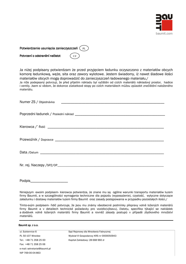 Potwierdzenie usunięcia zanieczyszczeń Potvrzení o odstranění nečistot PL CZ Ja niżej podpisany potwierdzam że przed przyjęciem ładunku oczyszczono z materiałów obcych komorę ładunkową, węże, sita oraz zawory wylotowe. Jestem świadomy, iż nawet śladowe ilości materiałów obcych mogą doprowadzić do zanieczyszczeń ładowanego materiału./ Ja níže podepsaný potvrzuji, že před přijetím nákladu byl vyčištěn od cizích materiálů nákladový prostor, hadice i ventily. Jsem si vědom, že dokonce zůstatkové stopy po cizích materiálech můžou způsobit znečištění naloženého materiálu. Numer ZS / Objednávka _______________________________________________________ Poprzedni ładunek / Poslední náklad ________________________________________________ Kierowca /’ Řidič ______________________________________________________________ Przewoźnik / Dopravce __________________________________________________________ Data /Datum __________________________________________________________________ Nr. rej. Naczepy /SPZ/OP_____________________________________________________________________________________ Podpis____________________ Niniejszym -swoim podpisem- kierowca potwierdza, że znane mu są ogólne warunki transportu materiałów luzem firmy Baumit, a w szczególności wymagania techniczne dla pojazdu (wyposażenie), czystość, wytyczne dotyczące załadunku i dostawy materiałów luzem firmy Baumit oraz zasady postępowania w przypadku pozostałych ilości./ Tímto-svým podpisem- řidič potvrzuje, že jsou mu známy všeobecné podmínky přepravy volně ložených materiálů firmy Baumit a v detailech technické požadavky pro vozidlo(výbavu), čistotu, specifika týkající se nakládek a dodávek volně ložených materiálů firmy Baumit a rovněž zásady postupů v případě zbytkového množství materiálů. Baumit sp. z o.o. ul. Sukiennice 6 Sąd Rejonowy dla Wrocławia Fabrycznej PL 50-107 Wrocław Wydział VI Gospodarczy KRS nr 0000050943 Tel.: +48 71 358 25 00 Kapitał Zakładowy: 28 668 960 zł Fax: +48 71 358 25 06 e-mail: [email protected] NIP 769-00-04-863 Potwierdzam poprawność wprowadzonych przez kierowcę danych oraz stwierdzam po przeprowadzonych oględzinach, iż wszystkie komory, wyloty, przewody oraz węże wylotowe są czyste./ czyste./ Potvrzuji správnost řidičem zadaných údajú a potvrzuji po vykonané prohlídce, že všechny komory, komory, výpustě i hadice jsou čisté. čisté. ___________________________________ Podpis osoby przeprowadzającej załadunek / Podpis osoby vykonávající nakládku ) Proszę o każdorazowe wypełnienie niniejszego oświadczenia przed załadunkiem w firmie Baumit i przekazanie osobie przeprowadzającej załadunek w celu weryfikacji, a następnie dołączenie do dokumentów przewozowych i przesłanie wraz z fakturą za transport do odpowiedniej placówki firmy Baumit . / Prosím o vyplnění tohoto potvrzení před každou nakládkou ve firmě Baumit a odevzdání osobě vykonávající nakládku pro kontrolu a následně o přiložení k přepravním dokladům a zaslání společně s fakturou za dopravu příslušné pobočce firmy Baumit) Baumit sp. z o.o. ul. Sukiennice 6 Sąd Rejonowy dla Wrocławia Fabrycznej PL 50-107 Wrocław Wydział VI Gospodarczy KRS nr 0000050943 Tel.: +48 71 358 25 00 Kapitał Zakładowy: 28 668 960 zł Fax: +48 71 358 25 06 e-mail: [email protected] NIP 769-00-04-863