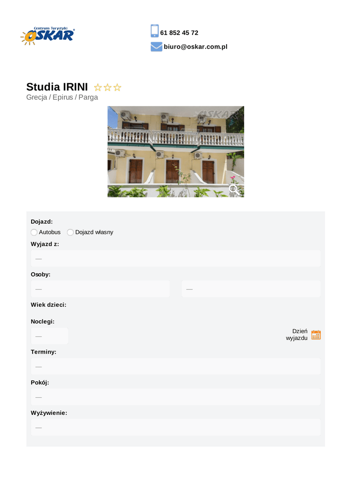 61 852 45 72 [email protected] Studia IRINI Grecja / Epirus / Parga Dojazd: Autobus Dojazd własny Wyjazd z: Osoby: Wiek dzieci: Noclegi: Dzień wyjazdu Terminy: Pokój: Wyżywienie: Najtańsza oferta Styczniowe Rabaty zniżka 20% cena katalogowa do 11 marca 2017: 2329,00 zł do 11 marca 2017: 698,70 zł do 11 kwietnia 2017: 0,00 zł do 11 kwietnia 2017: 1630,30 zł Suma: 2329,00 zł Suma: 2329,00 zł Opis oferty Miejscowość Atuty Wycieczki bliskość plaży fakultatywne blisko do głównej promenady spokój i cisza Opinie płaski teren bardzo dobry serwis aneks w każdym studio Rozkład jazdy Położenie Studia zlokalizowane w spokojnej części Pargi, jedynie 400 m od najbliższej plaży (Piso Krioneri) i około 600 m od promenady portowej. Idealna lokalizacja obiektu pod każdym względem -najbliższa restauracja i bar - 20 m, a supermarket jedynie 10 m. Naprzeciwo studia Irini znajduje się Alpha Hotel, który posiada basen otwarty do użytku publicznego (warunek - zakup napojów i przekąski w barze przy basenie). Zakwaterowanie Studia 2 osobowe z aneksem kuchennym, TV i łazienką. Każde studio ma balkon lub taras. Klimatyzacja opcjonalna dodatkowo płatna 5 euro/doba. Dostępne opcje zakwaterowania Studio 2 osobowe Studio 2 osobowe z dostawką dokwaterowanie (bez dopłat*) lub studio 1 osobowe (dopłata) * dokwaterowanie: osoby wybierając się pojedynczo, które w momencie rezerwacji nie dokonują dopłaty do pokoju jednoosobowego, mogą zostać zakwaterowanie z jedną lub kilkoma osobami tej samej płci w tzw. opcji dokwaterowania; jednakże w przypadku braku innej rezerwacji w opcji dokwaterowania w terminie do 7 dni przed rozpoczęciem imprezy wymagana jest dopłata do pokoju 1 osobowego Dostępne opcje wyżywienia we własnym zakresie śniadania obiadokolacje śniadania i obiadokolacje Pakiet KOMFORT gwarancja wyboru miejsca w autokarze napoje w autokarze w cenie (6 x do wyboru: kawa, herbata, zimny napój 0,2l) cena: 50 zł/os Pakiet PRESTIGE gwarancja wyboru miejsca w autokarze napoje w autokarze w cenie (6 x do wyboru: kawa, herbata, zimny napój 0,2l) pierwszeństwo wejścia na pokład autokaru nadbagaż 5 kg w cenie suchy prowiant na drogę powrotną cena: 100 zł/os Ubezpieczenie Warunki ubezpieczenia Bezpieczne Podróże Signal Iduna dokument do pobrania www.oskar.com.pl/zalaczniki/owu Warunki ubezpieczenia Kosztów Imprezy Turystycznej Signal Iduna dokument do pobrania www.oskar.com.pl/zalaczniki/owurg Karta Dużej Rodziny www.oskar.com.pl/zalaczniki/karta_duzej_rodziny Warunki promocji FIRST MINUTE www.oskar.com.pl/zalaczniki/warunki_promocji Turystyczny Fundusz Gwarancyjny W związku z powołaniem do życia w dniu 26.11.2016 Turystycznego Funduszu Gwarancyjnego każdy klient Biura Podróży Oskar zobowiązany jest do zapłaty kwoty w wysokości 10zł/os. przy każdorazowej rezerwacji imprezy turystycznej (obowiązuje od dnia 26.11.2016). Kwota przeznaczona na Turystyczny Fundusz Gwarancyjny zostanie automatycznie doliczona do wartości rezerwacji (w momencie jej dokonania). Wyjątkiem są imprezy turystyczne odbywające się w krajach posiadających granicę z Rzeczpospolitą Polską. Składka nie jest przychodem biura. Udogodnienia Klimatyzacja Regulowane fotele Tacki Nowoczesna flota Zawodowy kierowca Pasy bezpieczeństwa Toaleta w autokarze Podnóżki Dla rodzin z dziećmi Wi-Fi Lodówka AGD RTV Blisko centrum Bez paszportu Spokojna okolica Region nadmorski Program ramowy Dzień 1 - 2 Wyjazd z Polski zgodnie z rozkładem jazdy autokarów. Przejazd przez Czechy, Słowację, Węgry, Serbię, Macedonię. Dzień 3 Przyjazd do Pargi w godzinach popołudniowych. Zakwaterowanie. Dzień 4 - 12 Pobyt na miejscu. Możliwość korzystania z dodatkowych wycieczek fakultatywnych. Dzień 12 Wykwaterowanie do godz. 09.00. Czas wolny. Wyjazd do Polski w godzinach popołudniowych. Dzień 13 - 14 Przejazd przez Macedonię, Serbię, Węgry, Słowację, Czechy. Przyjazd do Polski. Orientacyjne godziny powrotu do poszczególnych miast zgodnie z rozkładem jazdy autokarów. Cena obejmuje przejazd autokarem klasy LUX (klimatyzacja, cafe - bar, DVD, WC) zakwaterowanie: 9 noclegów w Studio IRINI opiekę pilota w czasie podróży oferta obejmuje sprzątanie początkowe i końcowe; w czasie pobytu sprzątanie we własnym zakresie opieka rezydenta na miejscu podatek VAT ubezpieczenie KL 10000 euro, NNW 10000 zł, bagaż (utrata 500 zł) Cena nie obejmuje Dopłaty wymagane na miejscu opłata serwisowo-kwaterunkowa 10 euro/os, dzieci do 12 lat płacą 50% - płatne u pilota w autokarze Dopłaty opcjonalne ubezpieczenie od chorób przewlekłych i nowotworowych KL 20000 euro, NNW 10000 zł, bagaż (utrata 500 zł): 160 zł/os ubezpieczenie od kosztów rezygnacji: 3,5% wartości rezerwacji Informacje dodatkowe dokumenty: paszport lub dowód osobisty (zgodnie z obowiązującymi przepisami) zaleca się wyrobienie karty EKUZ aneks kuchenny o podstawowym wyposażeniu (lodówka, kuchenka gazowa lub elektryczna, garnki, naczynia, sztućce) należy posiadać własne ręczniki i środki czystości Chcesz wiedzieć szybciej? Polub nas na facebooku Wycieczki fakultatywne 41 € /os. 42 € /os. M ITOLOGICZNY EPIR Korfu 40 € /os. Klasztory M eteory OSKAR Sp. z o.o. pl.Wolności 2/4c, 61-738 Poznań Potrzebujesz pomocy? 50 € /os. Albania 40 € /os. WYSPY JONSKIE Zadzwoń lub napisz: 61 852 45 72 [email protected] Zadzwoń Projekt i wdrożenie: Simply User