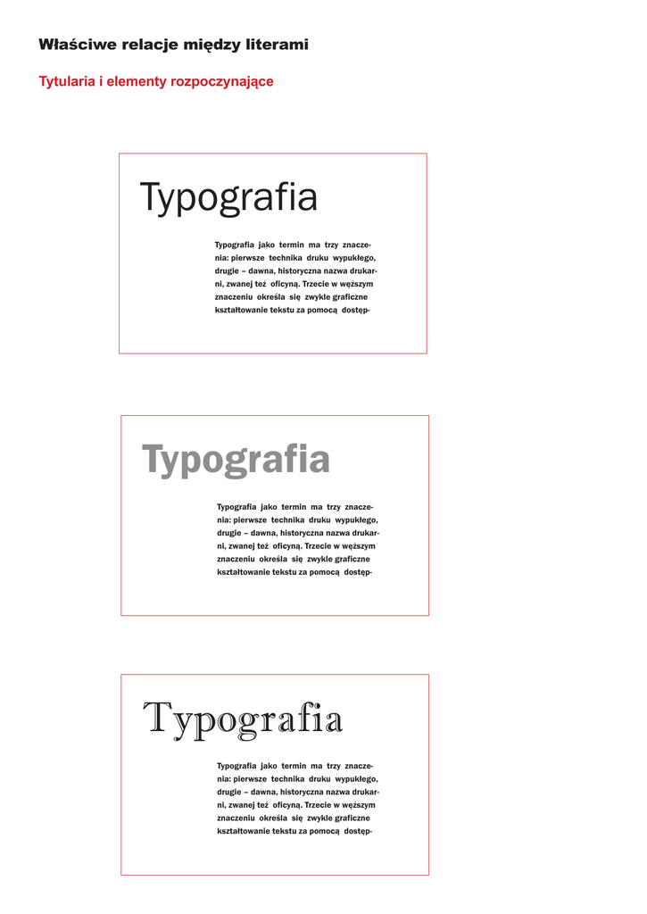 Właściwe relacje między literami Tytularia i elementy rozpoczynające Typografia Typografia jako termin ma trzy znaczenia: pierwsze technika druku wypukłego, drugie – dawna, historyczna nazwa drukarni, zwanej też oficyną. Trzecie w węższym znaczeniu określa się zwykle graficzne kształtowanie tekstu za pomocą dostęp- Typografia Typografia jako termin ma trzy znaczenia: pierwsze technika druku wypukłego, drugie – dawna, historyczna nazwa drukarni, zwanej też oficyną. Trzecie w węższym znaczeniu określa się zwykle graficzne kształtowanie tekstu za pomocą dostęp- Typografia Typografia jako termin ma trzy znaczenia: pierwsze technika druku wypukłego, drugie – dawna, historyczna nazwa drukarni, zwanej też oficyną. Trzecie w węższym znaczeniu określa się zwykle graficzne kształtowanie tekstu za pomocą dostęp- Odznaczenie każdego początku i wznowienia tekstu Inicjały, ornamenty typograficzne T jako termin ma trzy znaczenia: pierwsze technika druku wypukłego, drugie – dawna, historyczna nazwa drukarni, zwanej też oficyną. Trzecie w węższym znaczeniu określa się zwykle graficzne kształtownie tekstu za pomocą dostępnych krojów pisma (nie chodzi tu więc o kaligrafię ani o projektowanie krojów). Pojęcia „typografia” w znaczeniu szerszym używa się, obejmując nim T YPOGRAFIA ypografia jako termin ma trzy znaczenia: pierwsze technika druku wypukłego, drugie – dawna, historyczna nazwa drukarni, zwanej też oficyną. Trzecie w węższym znaczeniu określa się zwykle graficzne kształtownie tekstu za pomocą dostępnych krojów pisma (nie chodzi tu więc o kaligrafię ani o projektowanie krojów). N V A L IGFDERTYB jako termin ma trzy znaczenia: pierwsze technika druku wypukłego, drugie – dawna, historyczna nazwa drukarni, zwanej też oficyną. Trzecie w węższym znaczeniu określa się zwykle graficzne kształtownie tekstu za pomocą dostępnych krojów pisma (nie chodzi tu więc o kaligrafię ani o projektowanie krojów). Pojęcia „typografia” w znaczeniu szerszym używa się, obejmując nim ‹‹ jako termin ma trzy znaczenia: pierwsze technika druku wypukłego, drugie – dawna, historyczna nazwa drukarni, zwanej też oficyną. Trzecie w węższym znaczeniu określa się zwykle graficzne kształtownie tekstu za pomocą dostępnych krojów pisma (nie chodzi tu więc o kaligrafię ani o projektowanie krojów). Pojęcia „typografia” w znaczeniu szerszym używa się, obejmując nim również projekIGFDERTYB „ I G F D E R T Y B jako termin ma trzy znaczenia: pierwsze technika druku wypukłego, drugie – dawna, historyczna nazwa drukarni, zwanej też oficyną. Trzecie w węższym znaczeniu określa się zwykle graficzne kształtownie tekstu za pomocą dostępnych krojów pisma (nie chodzi tu więc o kaligrafię ani o projektowanie krojów). Pojęcia „typografia” w znaczeniu szerszym używa się, obejmując nim również projekIGFDERTYB MVFDRDH, jako termin ma trzy znaczenia: pierwsze technika druku wypukłego, drugie – dawna, historyczna nazwa drukarni, zwanej też oficyną. Trzecie w węższym znaczeniu określa się zwykle graficzne kształtownie tekstu za pomocą dostępnych krojów pisma (nie chodzi tu więc o kaligrafię ani o projektowanie krojów). Pojęcia „typografia” w znaczeniu szerszym używa się, obejmując nim również projektowanie rozkładu ilustracji i innych elementów graficznych na przykład: książkach, czasopismach, akcydensach. Definicja ta obejmuje nieskończoną ilość różnorodnych form typograficznych. Kryterium oceny ich wartości brzmi: cel określa środki. ♠ ♣ ♥ Tytularia Tytuł współgrający ze stylem całości Pozimy tytułów Tytuł części T Y P O G R A F I A jako termin ma trzy znaczenia: pierwsze technika druku wypukłego, drugie – dawna, historyczna nazwa drukarni, zwanej też oficyną. Trzecie w węższym znaczeniu określa się zwykle graficzne kształtownie tekstu za pomocą dostępnych krojów pisma (nie chodzi tu więc o kaligrafię ani o projektowanie krojów). Pojęcia „typografia” w znaczeniu szerszym używa się, obejmując nim również projektowanie rozkładu ilustracji i innych elementów graficznych na przykład: ŚRÓDTYTUŁ WERSALIKAMI Typografia jako termin ma trzy znaczenia: pierwsze technika druku wypukłego, drugie – dawna, historyczna nazwa drukarni, zwanej też oficyną. Trzecie w węższym znaczeniu określa się zwykle graficzne kształtownie tekstu za pomocą dostępnych krojów pisma (nie chodzi tu więc o kaligrafię ani o projektowanie krojów). Pojęcia „typogra- Śródtytuł odmianą półgrubą Typografia jako termin ma trzy znaczenia: pierwsze technika druku wypukłego, drugie – dawna, historyczna nazwa drukarni, zwanej też oficyną. Trzecie w węższym znaczeniu określa się zwykle graficzne kształtownie tekstu za pomocą dostępnych krojów pisma (nie chodzi tu więc o kaligrafię ani o projektowanie krojów). Pojęcia „typogra- ŚRÓDTYTUŁ KAPITALIKAMI Typografia jako termin ma trzy znaczenia: pierwsze technika druku wypukłego, drugie – dawna, historyczna nazwa drukarni, zwanej też oficyną. Trzecie w węższym znaczeniu określa się zwykle graficzne kształtownie tekstu za pomocą dostępnych krojów pisma (nie chodzi tu więc o kaligrafię ani o projektowanie krojów). Pojęcia „typografia” w znaczeniu szerszym używa się, obejmując nim również projektowanie rozkładu Śródtytuł kursywą Typografia jako termin ma trzy znaczenia: pierwsze technika druku wypukłego, drugie – dawna, historyczna nazwa drukarni, zwanej też oficyną. Trzecie w węższym znaczeniu określa się zwykle graficzne kształtownie tekstu za pomocą dostępnych krojów pisma (nie chodzi tu więc o kaligrafię ani o projektowanie krojów). Pojęcia „typogra- T Y T U L I K W Ł A M A N Y – Typografia jako termin ma trzy znaczenia: pierwsze technika druku wypukłego, drugie – dawna, historyczna nazwa drukarni, zwanej te