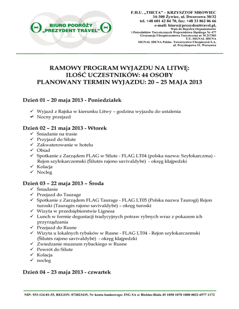 F.H.U. „THETA” – KRZYSZTOF MROWIEC 34-300 Żywiec, ul. Dworcowa 30/32 tel. +48 601 42 84 70, fax: +48 33 862 06 66 e-mail: [email protected], Wpis do Rejestru Organizatorów i Pośredników Turystycznych Województwa Śląskiego Nr 477 Gwarancja Ubezpieczeniowa Turystyczna nr M 217303 T.U. SIGNAL IDUNA SIGNAL IDUNA Polska Towarzystwo Ubezpieczeń S.A, ul. Przyokopowa 31, Warszawa RAMOWY PROGRAM WYJAZDU NA LITWĘ: ILOŚĆ UCZESTNIKÓW: 44 OSOBY PLANOWANY TERMIN WYJAZDU: 20 – 25 MAJA 2013 Dzień 01 – 20 maja 2013 - Poniedziałek Wyjazd z Rajska w kierunku Litwy – godzina wyjazdu do ustalenia Nocny przejazd Dzień 02 – 21 maja 2013 - Wtorek Śniadanie na trasie Przyjazd do Silute Zakwaterowanie w hotelu Obiad Spotkanie z Zarządem FLAG w Silute - FLAG LT04 (polska nazwa: Szyłokarczma) Rejon szyłokarczemski (Šilutės rajono savivaldybė) - okręg kłajpedzki Kolacja Nocleg Dzień 03 – 22 maja 2013 – Środa Śniadanie Przejazd do Taurage Spotkanie z Zarządem FLAG Taurage - FLAG LT05 (Polska nazwa Taurogi) Rejon turoski (Tauragės rajono savivaldybė) – okręg turoski Wizyta w przedsiębiorstwie Lignesa Lunch w formie degustacji tradycyjnych potraw rybnych wraz z pokazem ich przyrządzania Przejazd do Rusne Wizyta u lokalnych rybaków w Rusne - FLAG LT04 - Rejon szyłokarczemski (Šilutės rajono savivaldybė) - okręg kłajpedzki Zwiedzanie muzeum rybackiego w Rusne Powrót do Silute Kolacja nocleg Dzień 04 – 23 maja 2013 - czwartek NIP: 553-124-81-55, REGON: 072823435, Nr konta bankowego: ING SA o/ Bielsko-Biała 45 1050 1070 1000 0022 6977 1172 F.H.U. „THETA” – KRZYSZTOF MROWIEC 34-300 Żywiec, ul. Dworcowa 30/32 tel. +48 601 42 84 70, fax: +48 33 862 06 66 e-mail: [email protected], Wpis do Rejestru Organizatorów i Pośredników Turystycznych Województwa Śląskiego Nr 477 Gwarancja Ubezpieczeniowa Turystyczna nr M 217303 T.U. SIGNAL IDUNA SIGNAL IDUNA Polska Towarzystwo Ubezpieczeń S.A, ul. Przyokopowa 31, Warszawa Śniadanie – wykwaterowanie Przejazd do Kintai Wizyta u lokalnych rybaków w Kintai – opcja do zrealizowania - FLAG LT04 Rejon szyłokarczemski (Šilutės rajono savivaldybė) - okręg kłajpedzki Przejazd do Minge - obserwacje zagospodarowania turystycznego obszarów rybackich – przykłady dywersyfikacji działalności gospodarczej przez rybaków regionu kurońskiego cz 1. Obiad Transfer do Nidy (obserwacje zagospodarowania turystycznego obszarów rybackich – przykłady dywersyfikacji działalności gospodarczej przez rybaków regionu kurońskiego cz 2 Przejazd do Palangi Po drodze kolacja w Kłajpedzie Zakwaterowanie w hotelu Nocleg Dzień 05 – 24 maja 2013 - Piątek Śniadanie Spotkanie z Zarządem Lokalnej Grupy Rybackiej w Palandze - FLAG LT01 (polska nazwa: Połąga) - Połąga rejon miejski (Palangos miesto savivaldybė) – okręg kłajpedzki Obiad - wykwaterowanie Wyjazd w kierunku Polski Kolacja na trasie Nocny przejazd – ok. 750 km Dzień 06 – 25 maja 2013 - Sobota Przyjazd do Rajska Zakończenie wizyty studyjnej Uwaga: Niniejszy program ma charakter ramowy. Stronę merytoryczną wyjazdu przygotowuje LGR Taurogi, w związku z czym kolejność poszczególnych punktów programu może ulec zmianie. NIP: 553-124-81-55, REGON: 072823435, Nr konta bankowego: ING SA o/ Bielsko-Biała 45 1050 1070 1000 0022 6977 1172