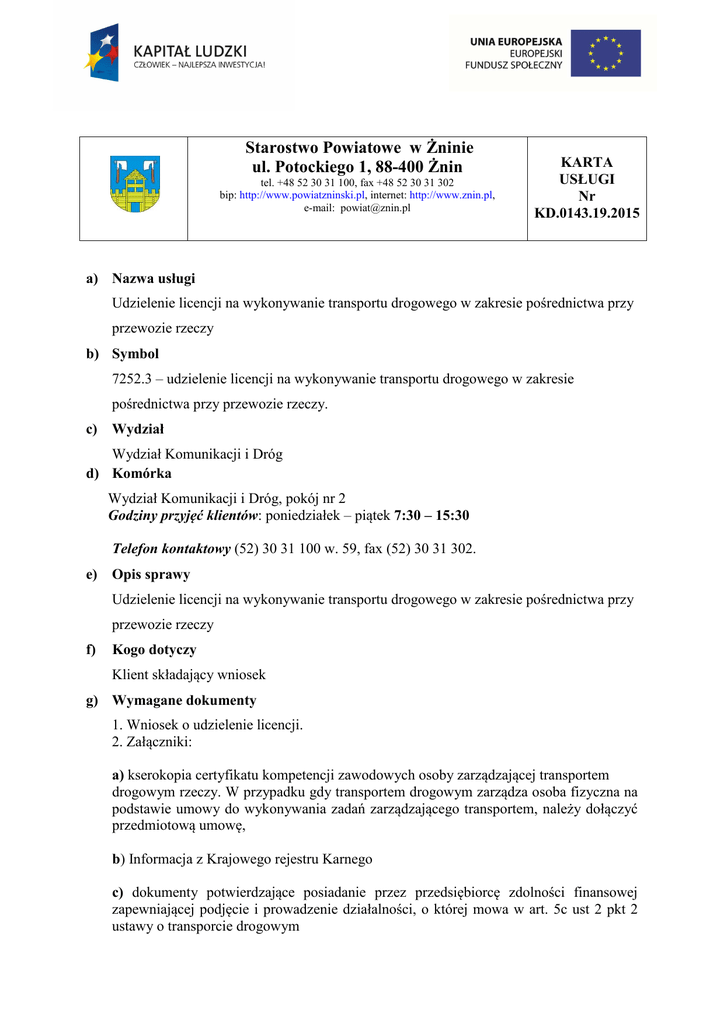 Starostwo Powiatowe w Żninie ul. Potockiego 1, 88-400 Żnin tel. +48 52 30 31 100, fax +48 52 30 31 302 bip: http://www.powiatzninski.pl, internet: http://www.znin.pl, e-mail: [email protected] KARTA USŁUGI Nr KD.0143.19.2015 a) Nazwa usługi Udzielenie licencji na wykonywanie transportu drogowego w zakresie pośrednictwa przy przewozie rzeczy b) Symbol 7252.3 – udzielenie licencji na wykonywanie transportu drogowego w zakresie pośrednictwa przy przewozie rzeczy. c) Wydział Wydział Komunikacji i Dróg d) Komórka Wydział Komunikacji i Dróg, pokój nr 2 Godziny przyjęć klientów: poniedziałek – piątek 7:30 – 15:30 Telefon kontaktowy (52) 30 31 100 w. 59, fax (52) 30 31 302. e) Opis sprawy Udzielenie licencji na wykonywanie transportu drogowego w zakresie pośrednictwa przy przewozie rzeczy f) Kogo dotyczy Klient składający wniosek g) Wymagane dokumenty 1. Wniosek o udzielenie licencji. 2. Załączniki: a) kserokopia certyfikatu kompetencji zawodowych osoby zarządzającej transportem drogowym rzeczy. W przypadku gdy transportem drogowym zarządza osoba fizyczna na podstawie umowy do wykonywania zadań zarządzającego transportem, należy dołączyć przedmiotową umowę, b) Informacja z Krajowego rejestru Karnego c) dokumenty potwierdzające posiadanie przez przedsiębiorcę zdolności finansowej zapewniającej podjęcie i prowadzenie działalności, o której mowa w art. 5c ust 2 pkt 2 ustawy o transporcie drogowym d) dowód uiszczenia opłaty. 3. Do wglądu: • dowód osobisty, • pełnomocnictwo. f) Miejsce składania pism Starostwo Powiatowe w Żninie - parter, pokój nr 2 g) Termin i sposób załatwienia Wnioski o udzielenie zezwolenia rozpatruje się w jak najkrótszym terminie, nie dłużej niż trzy miesiące od daty otrzymania przez Starostę Żnińskiego wszystkich dokumentów, koniecznych do rozpatrzenia wniosku. W należycie uzasadnionych przypadkach organ może wydłużyć ten termin o miesiąc. h) Opłaty Okres ważności licencji na wykonywanie transportu drogowego w zakresie pośrednictwa przy przewozie rzeczy: • • • Okres ważności licencji od 2 do 15 lat – 800,00 zł Okres ważności licencji od 15 do 30 lat – 900,00 zł Okres ważności licencji od 31 – 50 lat – 1000,00 zł 17,00 zł za zaświadczenie potwierdzające wykonywanie działalności gospodarczej w zakresie pośrednictwa przy przewozie rzeczy – opłata skarbowa, 17,00 zł za pełnomocnictwo, jeżeli między mocodawcą, a pełnomocnikiem nie zostaje zachowane pokrewieństwo w linii pierwszej (zstępni, wstępni, małżonkowie) – opłata skarbowa. Opłatę za udzielenie licencji, wydanie wypisów uiszcza się: - uiszcza się w kasie Starostwa Powiatowego w Żninie, parter – kasa czynna w godzinach od 7:45 do 14:30 lub przelewem - Bank Spółdzielczy „PAŁUKI” w Żninie, ul. 700–lecia 41, w godz. 7.30 – 16.30 nr konta 80 8181 0000 0001 4717 2000 0004 Opłatę skarbową uiszcza się: - przelewem na konto bankowe Urzędu Miejskiego w Żninie, numer konta bankowego: Bank Spółdzielczy „Pałuki” w Żninie 47 8181 0000 0001 2742 2000 0038 i) Podstawa prawna - ustawa z dnia 6 września 2001 r. o transporcie drogowym (Dz. U. 2013 r. poz. 1414.), - ustawa z dnia 14 czerwca 1960 r. Kodeks postępowania administracyjnego (Dz. U. 2013 r. poz. 267), - ustawa z dnia 16 listopada 2006 r. o opłacie skarbowej (Dz. U. 2014 r. poz. 1628), - rozporządzenie Parlamentu Europejskiego i Rady (WE) Nr 1071/2009 z dnia 21 października 2009 r. ustanawiające wspólne zasady dotyczące warunków wykonywania zawodu przewoźnika drogowego i uchylające dyrektywę Rady 96/26/WE (Dz. U. UE L z 14.11.2009 r. L300.51), - rozporządzenie Ministra Infrastruktury z dnia 4 grudnia 2007 r. w sprawie wysokości opłat za czynności administracyjne związane z wykonywaniem przewozu drogowego oraz za egzaminowanie i wydanie certyfikatu kompetencji zawodowych (Dz. U. 2013, poz.916) j) Tryb odwoławczy Od decyzji służy stronie odwołanie do Samorządowego Kolegium Odwoławczego w Bydgoszczy, w terminie 14 dni od daty doręczenia decyzji stronie, za pośrednictwem Starosty Żnińskiego. k) Inne informacje Tomasz Michalczak – kierownik wydziału pokój nr 1 , tel. (52) 30 31 100 wew. 32, e-mail: [email protected] Agnieszka Jagodzińska – podinspektor pokój nr 2, tel. (52) 30 31 100 wew. 59, e-mail: [email protected]