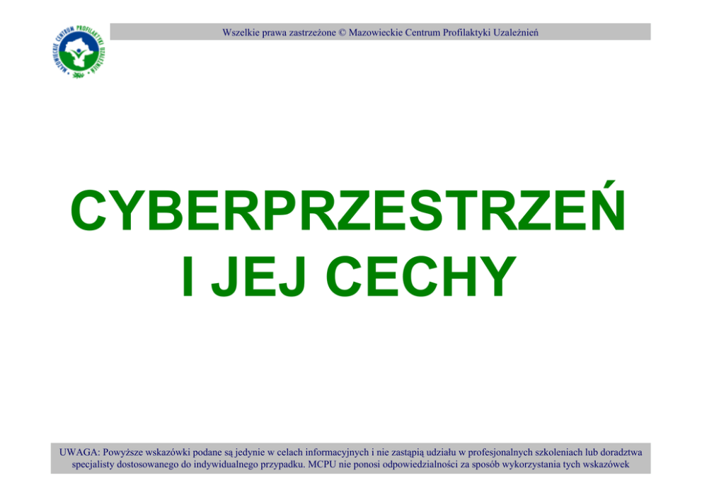 Wszelkie prawa zastrzeŜone © Mazowieckie Centrum Profilaktyki UzaleŜnień CYBERPRZESTRZEŃ I JEJ CECHY UWAGA: PowyŜsze wskazówki podane są jedynie w celach informacyjnych i nie zastąpią udziału w profesjonalnych szkoleniach lub doradztwa specjalisty dostosowanego do indywidualnego przypadku. MCPU nie ponosi odpowiedzialności za sposób wykorzystania tych wskazówek Wszelkie prawa zastrzeŜone © Mazowieckie Centrum Profilaktyki UzaleŜnień CECHY XXI WIEKU - powszechność dostępu do dóbr, - powszechna zdolność do posiadania, dóbr (kontekst finansowy i praktyczny), - świat oparty na technice, - świat multitechnologii elektronicznych - globalna wioska informacyjna. Wszelkie prawa zastrzeŜone © Mazowieckie Centrum Profilaktyki UzaleŜnień CYFROWI IMIGRANCI Cyberprzestrzeń współczesnych 40.. 50.. 60. 70…-latków • Radio • Gramofon • Magnetofon (szpulowy, potem kasetowy) • Telewizor (czarno-biały, potem kolorowy) Wyraźny podział cykli Ŝyciowych: ODPOCZYNEK – PRACA (NAUKA) – REKREACJA Przewaga relacji interpersonalnych (osobistych): TWARZĄ W TWARZ Wszelkie prawa zastrzeŜone © Mazowieckie Centrum Profilaktyki UzaleŜnień CYFROWI AUTOCHTONI Cyberprzestrzeń współczesnych 10.. 20.. 30.. -latków • Telewizor HD • Komputer • MP3 / MP4 • Telefon komórkowy • Internet • Programy satelitarne Przewaga relacji cyberprzestrzennych (wirtualnych): EKRAN W EKRAN Wszelkie prawa zastrzeŜone © Mazowieckie Centrum Profilaktyki UzaleŜnień PODSTAWOWE SŁOWNICTWO W KONTAKTACH… ... personalnych to: 600-800 słów ... cyberprzestrzennych to: 200-350 słów +emotikiony Wszelkie prawa zastrzeŜone © Mazowieckie Centrum Profilaktyki UzaleŜnień Cechy wiedzy XXI wieku Więcej źródeł wiedzy Więcej informacji Szybsze zmiany Krótsze skrypty wiedzy Wszelkie prawa zastrzeŜone © Mazowieckie Centrum Profilaktyki UzaleŜnień Podstawowe źródła wiedzy XXI w. 73% Internet 14% ksiąŜki 6% telewizja 5% inne DEFRAGMENTYZACJA WIEDZY Wszelkie prawa zastrzeŜone © Mazowieckie Centrum Profilaktyki UzaleŜnień Wynik dominacji Internetu w gromadzeniu wiedzy DEFRAGMENTARYZACJA WIEDZY trudność w łączeniu róŜnych obszarów wiedzy WIEDZA UBOGA hasła, fakty, problem z analizą INFORMACJA A NIE WIEDZA „kolory” a nie treść” Wszelkie prawa zastrzeŜone © Mazowieckie Centrum Profilaktyki UzaleŜnień Co praktycznie oznacza „defragmentaryzacja wiedzy”? - Wiem duŜo i nie wiem nic - Wiedza fragmentaryczna: • wiem coś ale nie wiem wszystkiego wiem coś, • nie wiem najwaŜniejszego. Wszelkie prawa zastrzeŜone © Mazowieckie Centrum Profilaktyki UzaleŜnień Co praktycznie oznacza „wiedza uboga” - Nie potrafię wyjaśnić istoty problemu - Nie rozumiem źródeł problemu Wszelkie prawa zastrzeŜone © Mazowieckie Centrum Profilaktyki UzaleŜnień Co praktycznie oznacza „masz informację a nie wiedzę” - Mówię i myślę hasłami – nie potrafię podjąć dyskusji na argumenty. - Ludzie, którzy nie mają wiedzy są bardziej pobudliwi i agresywni. Wszelkie prawa zastrzeŜone © Mazowieckie Centrum Profilaktyki UzaleŜnień WNIOSKI DLA PRAKTYKI komputer = „bolid F1” + Internet = „autostrada” wymagają „prawa jazdy”