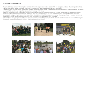 III Łódzki Dzień Wody Drużyna łódzkiego Zakładu Wodociągów i Kanalizacji wygrała tegoroczną wodną sztafetę VIP-ów rozegraną podczas III Łódzkiego Dnia Wody. Impreza pod hasłem „Woda a kultura" odbyła się 9 czerwca przy zbiorniku Zgierska na rzece Sokołówce. Zawodnicy ZWiK już po raz drugi byli najlepsi w biegu ze szklanką wody, której - podczas wyścigu wokół zbiornika - stracili najmniej. Wcześniej wodną sztafetę „zwikowcy" wygrali podczas ubiegłorocznego Dnia Wody. W pikniku nad zbiornikiem na Skołówce uczestniczyła głównie młodzież z łódzkich gimnazjów i liceów, która mogła się dowiedzieć między innymi wszystkiego o łódzkiej "kranówce", zobaczyć skąd się ją wydobywa i co się z nią dzieje zanim trafi do łódzkich domów. Zabawie towarzyszyły występy artystyczne, pokaz ratownictwa w wykonaniu łódzkich strażaków, konkursy: plastyczny, wiedzy o wodzie i konkurs na najładniejszy wianek. Wianki były później puszczane przez młodzież na stawie przy ul. Zgierskiej. III Łódzki Dzień Wody zorganizował Wydział Gospodarki Komunalnej UMŁ przy współudziale łódzkich firm komunalnych: Zakładu Wodociągów i Kanalizacji, Grupowej Oczyszczalni Ścieków i Zakładu Usług Komunalnych.