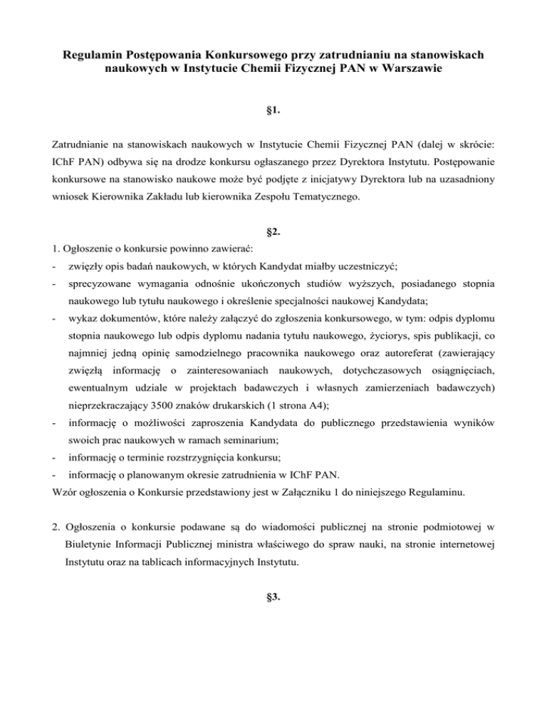 Regulamin Postępowania Konkursowego przy zatrudnianiu na stanowiskach naukowych w Instytucie Chemii Fizycznej PAN w Warszawie §1. Zatrudnianie na stanowiskach naukowych w Instytucie Chemii Fizycznej PAN (dalej w skrócie: IChF PAN) odbywa się na drodze konkursu ogłaszanego przez Dyrektora Instytutu. Postępowanie konkursowe na stanowisko naukowe może być podjęte z inicjatywy Dyrektora lub na uzasadniony wniosek Kierownika Zakładu lub kierownika Zespołu Tematycznego. §2. 1. Ogłoszenie o konkursie powinno zawierać: - zwięzły opis badań naukowych, w których Kandydat miałby uczestniczyć; - sprecyzowane wymagania odnośnie ukończonych studiów wyższych, posiadanego stopnia naukowego lub tytułu naukowego i określenie specjalności naukowej Kandydata; - wykaz dokumentów, które należy załączyć do zgłoszenia konkursowego, w tym: odpis dyplomu stopnia naukowego lub odpis dyplomu nadania tytułu naukowego, życiorys, spis publikacji, co najmniej jedną opinię samodzielnego pracownika naukowego oraz autoreferat (zawierający zwięzłą informację o zainteresowaniach naukowych, dotychczasowych osiągnięciach, ewentualnym udziale w projektach badawczych i własnych zamierzeniach badawczych) nieprzekraczający 3500 znaków drukarskich (1 strona A4); - informację o możliwości zaproszenia Kandydata do publicznego przedstawienia wyników swoich prac naukowych w ramach seminarium; - informację o terminie rozstrzygnięcia konkursu; - informację o planowanym okresie zatrudnienia w IChF PAN. Wzór ogłoszenia o Konkursie przedstawiony jest w Załączniku 1 do niniejszego Regulaminu. 2. Ogłoszenia o konkursie podawane są do wiadomości publicznej na stronie podmiotowej w Biuletynie Informacji Publicznej ministra właściwego do spraw nauki, na stronie internetowej Instytutu oraz na tablicach informacyjnych Instytutu. §3. 1. Postępowanie konkursowe na stanowiska profesora zwyczajnego, profesora nadzwyczajnego i profesora wizytującego przeprowadza Komisja ds. Wyróżnień i Awansów Rady Naukowej IChF PAN. 2. Komisja zasięga opinii Kierownika Zakładu, w którym kandydat miałby być zatrudniony oraz może poprosić o opinię recenzentów spoza Instytutu, specjalistów w danej dziedzinie. 3. Komisja przygotowuje listę rankingową Kandydatów uczestniczących w postępowaniu konkursowym i przedstawia ją Dyrektorowi Instytutu. §4. 1. Postępowanie konkursowe na stanowiska asystenta i adiunkta przeprowadza Komisja ds. Osobowych Rady Naukowej IChF PAN. 2. Komisja zasięga opinii Kierownika Zakładu oraz Kierownika Zespołu Tematycznego, w których Kandydat miałby zostać zatrudniony. 3. Komisja przygotowuje listę rankingową Kandydatów uczestniczących w postępowaniu konkursowym i przedstawia ją Dyrektorowi Instytutu. §5. Dyrektor Instytutu rozstrzyga i ogłasza wynik konkursu oraz podejmuje decyzję o zatrudnieniu w IChF PAN kandydata lub kandydatów wyłonionych w konkursie. §6. Jeśli żaden z kandydatów nie uzyska rekomendacji Komisji, lub w określonym terminie nie wpłynie żadna kandydatura, Dyrektor Instytut może ogłosić nowy konkurs. §7. Postępowania konkursowego nie przeprowadza się gdy: 1. Kandydat uzyskał wynik pozytywny rozmowy kwalifikacyjnej na Studium Doktoranckie przeprowadzanej w IChF PAN przez Komisje ds. Kształcenia Rady Naukowej, został przyjęty na Międzynarodowe Studia Doktoranckie w IChF PAN i jest zatrudniany na stanowisku asystenta. 2. Osoba zatrudniona na stanowisku asystenta po przejściu przez procedurę konkursową i uzyskaniu stopnia naukowego doktora habilitowanego, jest awansowana na stanowisko adiunkta po pozytywnym zaopiniowaniu przez Radę Naukową. 3. Osoba zatrudniona na stanowisku adiunkta po przejściu przez procedurę konkursową i uzyskaniu stopnia naukowego doktora habilitowanego, jest awansowana na stanowisko profesora nadzwyczajnego po pozytywnym zaopiniowaniu jej programu badawczego przez Radę Naukową. 4. Osoba zatrudniona na stanowisku profesora nadzwyczajnego i uzyskaniu tytułu naukowego profesora, jest awansowana na stanowisko profesora zwyczajnego po pozytywnym zaopiniowaniu przez Radę Naukową. 5. Kandydat przeszedł konkursowy tryb rekrutacji do projektów finansowanych z funduszy zewnętrznych i istnieje wymóg zatrudnienia go na stanowisku naukowym. Załącznik 1 Instytut Chemii Fizycznej Polskiej Akademii Nauk ul. Kasprzaka 44/52, 01-224 Warszawa Tel. +(48 22) 343 3109 Fax +(48 22) 343 3333 Warszawa, dnia DYREKTOR INSTYTUTU OGŁASZA KONKURS OTWARTY NA STANOWISKO …………..W ZESPOLE/ZAKŁADZIE………..ICHF PAN Do Konkursu mogą przystąpić osoby, które spełniają warunki określone w Ustawie o Polskiej Akademii Nauk z dnia 30 kwietnia 2010 roku, Dz. Ustaw Nr 96, poz. 619 oraz Regulaminie Postępowania Konkursowego przy zatrudnianiu na stanowiskach naukowych w Instytucie Chemii Fizycznej PAN (www.ichf.edu.pl). I. Badania naukowe, w których Kandydat miałby uczestniczyć: ……………………… II. Warunki, jakie Kandydat powinien spełniać: 1. Posiadać ukończone studia wyższe w zakresie ………., tytuł zawodowy lub stopień naukowy………………….. nauk……………….., w dyscyplinie …………………..* 2. Posiadać doświadczenie w prowadzeniu badań naukowych w zakresie…………………. 3. Posiadać dorobek naukowy i organizacyjny oraz osiągnięcia dydaktyczne.* III. Zgłoszenie konkursowe powinno zawierać: 1. Podanie. 2. Życiorys. 3. Autoreferat (nieprzekraczający 3500 znaków drukarskich), zawierający zwięzłą informację o zainteresowaniach naukowych, dotychczasowych osiągnięciach, ewentualnym udziale w projektach badawczych i własnych zamierzeniach badawczych. 4. Odpis dyplomu ukończenia studiów wyższych, odpis dyplomu nadania stopnia naukowego, odpis dyplomu uzyskania tytułu naukowego. 5. Spis publikacji. 6. Przynajmniej jedną opinię o Kandydacie, wystawioną przez samodzielnego pracownika naukowego, specjalisty w zakresie ………