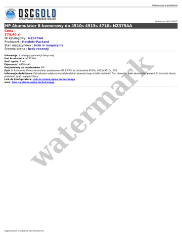 Informacje o produkcie Utworzono 08-03-2017 HP Akumulator 8-komorowy do 4510s 4515s 4710s NZ375AA Cena : 274,40 zł Nr katalogowy : NZ375AA Producent : Hewlett-Packard Stan magazynowy : brak w magazynie Średnia ocena : brak recenzji w at er m ar k Gwarancja: 6 miesięcy gwarancji fabrycznej Kod Producenta: NZ375AA Ilość ogniw: 8 szt. Pojemność: 4400 mAh Dedykowany do notebooków: HP Opis: 8 -komorowy litowy akumulator podstawowy HP 63 Wh do notbooków 4510s, 4515s,4710s, 610 Informacje dodatkowe: Potrzebujesz większej niezależności od zewnętrznego źródła zasilania? Ten niewielki, lekki akumulator pozwoli Ci znacznie dłużej pracować, grać i oglądać filmy. Link do konfiguratora: Link na stronę opisu technicznego www: Link na stronę opisu technicznego Wygenerowano w programie www.oscGold.com