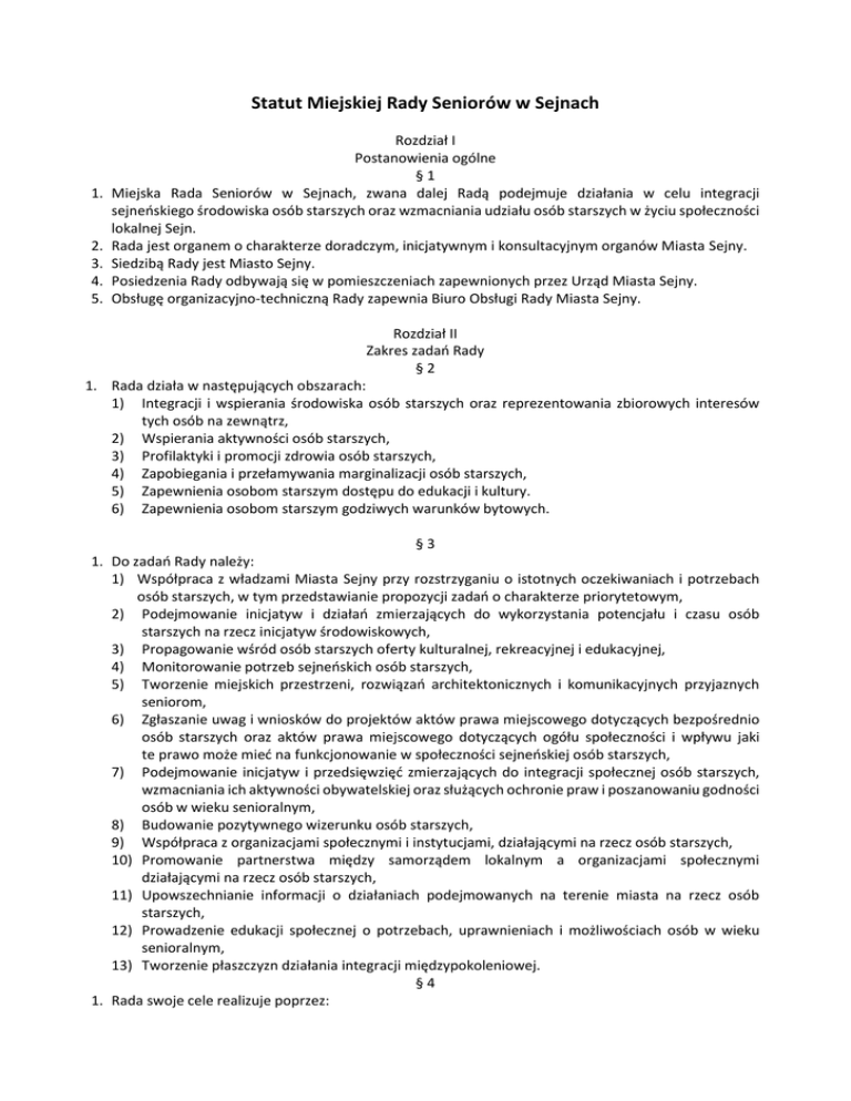Statut Miejskiej Rady Seniorów w Sejnach 1. 2. 3. 4. 5. Rozdział I Postanowienia ogólne §1 Miejska Rada Seniorów w Sejnach, zwana dalej Radą podejmuje działania w celu integracji sejneńskiego środowiska osób starszych oraz wzmacniania udziału osób starszych w życiu społeczności lokalnej Sejn. Rada jest organem o charakterze doradczym, inicjatywnym i konsultacyjnym organów Miasta Sejny. Siedzibą Rady jest Miasto Sejny. Posiedzenia Rady odbywają się w pomieszczeniach zapewnionych przez Urząd Miasta Sejny. Obsługę organizacyjno-techniczną Rady zapewnia Biuro Obsługi Rady Miasta Sejny. Rozdział II Zakres zadań Rady §2 1. Rada działa w następujących obszarach: 1) Integracji i wspierania środowiska osób starszych oraz reprezentowania zbiorowych interesów tych osób na zewnątrz, 2) Wspierania aktywności osób starszych, 3) Profilaktyki i promocji zdrowia osób starszych, 4) Zapobiegania i przełamywania marginalizacji osób starszych, 5) Zapewnienia osobom starszym dostępu do edukacji i kultury. 6) Zapewnienia osobom starszym godziwych warunków bytowych. §3 1. Do zadań Rady należy: 1) Współpraca z władzami Miasta Sejny przy rozstrzyganiu o istotnych oczekiwaniach i potrzebach osób starszych, w tym przedstawianie propozycji zadań o charakterze priorytetowym, 2) Podejmowanie inicjatyw i działań zmierzających do wykorzystania potencjału i czasu osób starszych na rzecz inicjatyw środowiskowych, 3) Propagowanie wśród osób starszych oferty kulturalnej, rekreacyjnej i edukacyjnej, 4) Monitorowanie potrzeb sejneńskich osób starszych, 5) Tworzenie miejskich przestrzeni, rozwiązań architektonicznych i komunikacyjnych przyjaznych seniorom, 6) Zgłaszanie uwag i wniosków do projektów aktów prawa miejscowego dotyczących bezpośrednio osób starszych oraz aktów prawa miejscowego dotyczących ogółu społeczności i wpływu jaki te prawo może mieć na funkcjonowanie w społeczności sejneńskiej osób starszych, 7) Podejmowanie inicjatyw i przedsięwzięć zmierzających do integracji społecznej osób starszych, wzmacniania ich aktywności obywatelskiej oraz służących ochronie praw i poszanowaniu godności osób w wieku senioralnym, 8) Budowanie pozytywnego wizerunku osób starszych, 9) Współpraca z organizacjami społecznymi i instytucjami, działającymi na rzecz osób starszych, 10) Promowanie partnerstwa między samorządem lokalnym a organizacjami społecznymi działającymi na rzecz osób starszych, 11) Upowszechnianie informacji o działaniach podejmowanych na terenie miasta na rzecz osób starszych, 12) Prowadzenie edukacji społecznej o potrzebach, uprawnieniach i możliwościach osób w wieku senioralnym, 13) Tworzenie płaszczyzn działania integracji międzypokoleniowej. §4 1. Rada swoje cele realizuje poprzez: 1) Uczestniczenie członków Rady w posiedzeniach, 2) Opiniowanie projektów uchwał skierowanych przez Burmistrza Miasta Sejny oraz Przewodniczącego Rady Miasta Sejny, 3) Występowanie do Rady Miasta Sejny za pośrednictwem Przewodniczącego Rady Miasta Sejny z wnioskiem o podjęcie inicjatywy uchwałodawczej, 4) Inicjowanie działań dotyczących życia seniorów w Mieście Sejny, 5) Współpraca z organizacjami pozarządowym, klubami seniora, uniwersytetem trzeciego wieku, związkiem emerytów i innymi podmiotami działającymi na rzecz osób starszych. 6) Monitorowanie działalności stowarzyszeń działających na rzecz osób starszych. 1. 2. 3. 4. 5. 1) 2) 3) 4) Rozdział III Skład Rady §5 Skład osobowy Rady powoływany jest na okres 4 letniej kadencji i nie pokrywa się z kadencjami Rady Miasta Sejny. Pierwsza kadencja Miejskiej Rady Seniorów będzie trwała 2 lata. Na Radnych Seniorów mogą być powołane wyłącznie osoby zamieszkałe w Mieście Sejny. Co najmniej połowa składu Rady stanowią osoby, które w dniu wyborów ukończyły 60 lat. W skład Rady wchodzi nie więcej niż 9 osób, zwanych dalej „Radnymi Seniorami”. Zakłada się następujący skład Rady: a) 8 osób zgłoszonych przez organizacje i podmioty działające na rzecz osób starszych, zamieszkałych na terenie Miasta Sejny, b) 1 osoba wskazana przez Radę Miasta Sejny. Rozdział IV Wybory Radnych Seniorów §6 Doboru organizacji i podmiotów działających na rzecz osób starszych oraz ilość ich przedstawicieli w Radzie (§ 5 ust. 5 pkt. a) dokona Burmistrz Miasta Sejny po konsultacji z Przewodniczącym Rady Miasta Sejny. Skład Rady zostanie ustalony na spotkaniu Przedstawicieli organizacji i podmiotów deklarujących swoje działanie na rzecz osób starszych z Sejn zwołanym przez Burmistrza Miasta Sejny z udziałem Przewodniczącego Rady Miasta Sejny. a) Termin spotkania, o którym mowa w ust. 2 Burmistrz Miasta Sejny ogłasza: na stronie internetowej miasta – www.um.sejny.pl , na tablicy ogłoszeń Urzędu Miasta Sejny, w inny, tradycyjnie stosowany w UM Sejny, sposób powiadamiania. b) W ogłoszeniu, o którym mowa w ust. 2, lit. a Burmistrz Miasta Sejny podaje w szczególności: informację o terminie i miejscu spotkania, termin, w jakim organizacje i podmioty działające na rzecz osób starszych mogą zgłaszać kandydatów do Rady oraz liczbę kandydatów. informację o trybie i zasadach wyborów do Rady. Każda wybrana organizacja lub podmiot działający na rzecz osób starszych zamieszkałych na terenie Miasta Sejny może oddelegować na zebranie, o którym mowa w § 6 ust. 2 a tym samym zgłosić dowolną liczbę kandydatów na Radnych Seniorów, jednak nie więcej niż 1 kandydata na 15 zarejestrowanych członków organizacji. Dobór sposobu wytypowania kandydatów w łonie każdej organizacji należy do wyłącznej dyspozycji danej organizacji. Wytypowane w ten sposób osoby nabywają czynne i bierne prawo wyborcze do Miejskiej Rady Seniorów w Sejnach. §7 Przedstawiciela Rady Miasta Sejny do Miejskiej Rady Seniorów w Sejnach wybiera Rada Miasta Sejny w wyniku głosowania. §8 1) Osoby wytypowane spotykają si