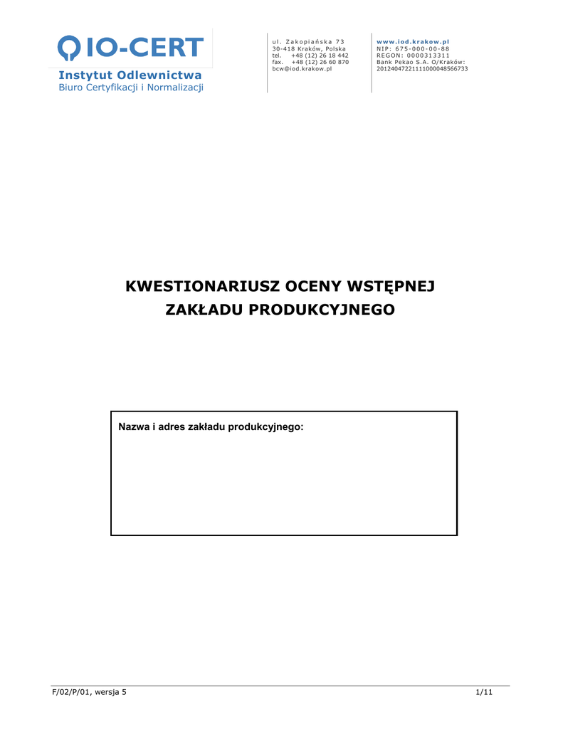 Instytut Odlewnictwa ul. Zakopiańska 73 30-418 Kraków, Pol ska tel. +48 (12) 26 18 442 fax. +48 (12) 26 60 870 [email protected] www.iod.k rak ow.pl NIP: 675-000-00-88 REGON: 0000313311 Bank Pekao S.A. O/Kraków: 20124047221111000048566733 Biuro Certyfikacji i Normalizacji KWESTIONARIUSZ OCENY WSTĘPNEJ ZAKŁADU PRODUKCYJNEGO Nazwa i adres zakładu produkcyjnego: F/02/P/01, wersja 5 1/11 Informacja wstępna: Kwestionariusz ten powinien być wypełniony i zwrócony razem z formularzem wniosku. Ma to na celu uzyskanie wstępnej informacji dotyczącej Wnioskującego o jego możliwości sterowania jakością oraz stałego utrzymania wyrobów z wymaganiami odpowiednich dokumentów. Dokument ten będzie używany przez personel jednostki certyfikującej w czasie auditu w zakładzie. Odpowiedzi prosimy umieszczać pod każdym zestawem pytań. Do kwestionariusza mogą być dołączone na oddzielnych stronach wszelkie inne dodatkowe informacje. Informacje podane w tym dokumencie będą traktowane z najwyższą poufnością. F/02/P/01, wersja 5 2/11 1. Organizacja zakładu produkcyjnego 1.1. 1.2. 1.3. 1.4. Wielkość zakładu (liczba pracowników). Struktura organizacyjna zakładu (wydziały, jednostki terenowe). Program produkcji podlegającej certyfikacji. Orientacyjna wielkość produkcji wyrobów podlegających certyfikacji. F/02/P/01, wersja 5 3/11 2. System jakości 2.1. Czy zakład posiada system jakości zgodny z normą ISO 9001? 2.2. Czy system jakości jest udokumentowany w postaci Księgi Jakości, procedur, instrukcji? 2.3. W przypadku braku Księgi Jakości, procedur, instrukcji prosimy opisać istniejący system sterowania jakością. F/02/P/01, wersja 5 4/11 3. Zapewnienie jakości dostaw 3.1. Czy zakład dokonuje oceny dostawców? 3.2. Czy zakład posiada wykaz dostawców kwalifikowanych? 3.3. Czy prowadzi się kontrolę dostawców? (Opisać zasady i tryb dokonywania kontroli dostaw) 3.4. Podać informację o zasadach składowania i zabezpieczania przed przenikaniem do produkcji dostaw niezgodnych z wymaganiami. 3.5. Kto i gdzie przechowuje dokumentację dostaw (zapisy dotyczące dostaw)? F/02/P/01, wersja 5 5/11 4. Proces produkcyjny 4.1. Opisać zasady planowania produkcji. 4.2. Wymienić stosowaną w produkcji dokumentację (instrukcje i karty technologiczne, produkcyjne, instrukcje robocze itp.) 4.3. Opisać sposoby nadzorowania materiału w czasie prowadzenia poszczególnych etapów produkcji. F/02/P/01, wersja 5 6/11 5. Podwykonastwo 5.1. Opisać wszystkie podzlecane procesy związane z produkcją i badaniami wnioskowanych do certyfikacji wyrobów, mające wpływ na zgodność z wymaganiami. 5.2. Podać nazwę(y) i adres(y) zakładów podwykonawców w odniesieniu do procesów wskazanych w pkt. 5.1. 5.3. Czy prowadzona jest ocena i monitowanie podwykonawców. 5.4. W jaki sposób prowadzona jest kontrola odbiorcza podzlecanych procesów/wyrobów. F/02/P/01, wersja 5 7/11 6. Kontrola i badania 6.1. W jaki sposób i wg jakich zasad prowadzi się kontrolę w toku produkcji? 2.2. W jaki sposób dokumentuje się przeprowadzone kontrole w toku produkcji? 6.3. W jaki sposób znakuje się, dokumentuje oraz przechowuje wyroby wadliwe powstałe w toku produkcji? 6.4. Czy istnieją pisemne instrukcje postępowania z wyrobem wadliwym? 6.5. Kto decyduje o zwolnieniu wyrobu po kontroli ostatecznej? 6.6. Czy wyrób gotowy jest poddawany kontroli i badaniom potwierdzającym zgodność z określonymi wymaganiami? (podać również częstotliwość prowadzenia kontroli i badań wyrobu gotowego) 6.7. Kto i gdzie przechowuje zapisy stanowiące dowód, że wyrób był poddany kontroli lub badaniom? 6.8. Podać rodzaj dokumentów potwierdzających zgodność wykonania wyrobu z określonymi wymaganiami np. atest, zaświadczenie jakości. F/02/P/01, wersja 5 8/11 7. Sprzęt kontrolno-pomiarowy 7.1. Czy jest dostępny i stosowany niezbędny sprzęt kontrolno-pomiarowy? 7.2. Czy stosowane wyposażenie kontrolno-pomiarowe jest oznaczane i nadzorowane (sprawdzane/wzorcowane/legalizowane) zgodnie z obowiązującymi przepisami? 7.3. Kto jest odpowiedzialny za nadzór nad sprzętem kontrolno-pomiarowymi ? 7.4. Czy istnieje identyfikowalność sprzętu z zapisami wynikającymi z nadzoru? 7.5. Sposoby zabezpieczania sprzętu niesprawnego przed wprowadzeniem do użytku. F/02/P/01, wersja 5 9/11 8. Reklamacje 8.1. Czy zakład prowadzi rejestr reklamacji? 8.2. Czy zakład posiada instrukcję/procedurę postępowania reklamacyjnego. 8.3. Wskazać osobę (stanowisko) lub komórkę odpowiedzialną za załatwianie reklamacji. F/02/P/01, wersja 5 10/11 9. Wykaz załączników ............................................................... (miejscowość, data) F/02/P/01, wersja 5 ................................................... (Przedstawiciel Producenta) 11/11