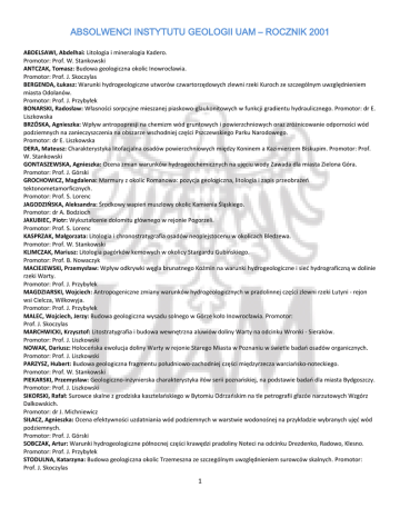 ABSOLWENCI INSTYTUTU GEOLOGII UAM – ROCZNIK 2001 ABDELSAWI, Abdelhai: Litologia i mineralogia Kadero. Promotor: Prof. W. Stankowski ANTCZAK, Tomasz: Budowa geologiczna okolic Inowrocławia. Promotor: Prof. J. Skoczylas BERGENDA, Łukasz: Warunki hydrogeologiczne utworów czwartorzędowych zlewni rzeki Kuroch ze szczególnym uwzględnieniem miasta Odolanów. Promotor: Prof. J. Przybyłek BONARSKI, Radosław: Własności sorpcyjne mieszanej piaskowo-glaukonitowych w funkcji gradientu hydraulicznego. Promotor: dr E. Liszkowska BRZÓSKA, Agnieszka: Wpływ antropopresji na chemizm wód gruntowych i powierzchniowych oraz zróżnicowanie odporności wód podziemnych na zanieczyszczenia na obszarze wschodniej części Pszczewskiego Parku Narodowego. Promotor: dr E. Liszkowska DERA, Mateusz: Charakterystyka litofacjalna osadów powierzchniowych między Koninem a Kazimierzem Biskupim. Promotor: Prof. W. Stankowski GONTASZEWSKA, Agnieszka: Ocena zmian warunków hydrogeochemicznych na ujęciu wody Zawada dla miasta Zielona Góra. Promotor: Prof. J. Górski GROCHOWICZ, Magdalena: Marmury z okolic Romanowa: pozycja geologiczna, litologia i zapis przeobrażeń tektonometamorficznych. Promotor: Prof. S. Lorenc JAGODZIŃSKA, Aleksandra: Środkowy wapień muszlowy okolic Kamienia Śląskiego. Promotor: dr A. Bodzioch JAKUBIEC, Piotr: Wykształcenie dolomitu głównego w rejonie Pogorzeli. Promotor: Prof. S. Lorenc KASPRZAK, Małgorzata: Litologia i chronostratygrafia osadów neoplejstocenu w okolicach Bledzewa. Promotor: Prof. W. Stankowski KLIMCZAK, Mariusz: Litologia pagórków kemowych w okolicy Stargardu Gubińskiego. Promotor: Prof. B. Nowaczyk MACIEJEWSKI, Przemysław: Wpływ odkrywki węgla brunatnego Koźmin na warunki hydrogeologiczne i sieć hydrograficzną w dolinie rzeki Warty. Promotor: Prof. J. Przybyłek MAGDZIARSKI, Wojciech: Antropogeniczne zmiany warunków hydrogeologicznych w pradolinnej części zlewni rzeki Lutyni - rejon wsi Cielcza, Wilkowyja. Promotor: Prof. J. Przybyłek MALEC, Wojciech, Jerzy: Budowa geologiczna wysadu solnego w Górze koło Inowrocławia. Promotor: Prof. J. Skoczylas MARCHWICKI, Krzysztof: Litostratygrafia i budowa wewnętrzna aluwiów doliny Warty na odcinku Wronki - Sieraków. Promotor: Prof. J. Liszkowski NOWAK, Dariusz: Holoceńska ewolucja doliny Warty w rejonie Starego Miasta w Poznaniu w świetle badań osadów organicznych. Promotor: Prof. J. Liszkowski PARZYSZ, Hubert: Budowa geologiczna fragmentu południowo-zachodniej części międzyrzecza warciańsko-noteckiego. Promotor: Prof. W. Stankowski PIEKARSKI, Przemysław: Geologiczno-inżynierska charakterystyka iłów serii poznańskiej, na podstawie badań dla miasta Bydgoszczy. Promotor: Prof. J. Liszkowski SIKORSKI, Rafał: Surowce skalne z grodziska kasztelańskiego w Bytomiu Odrzańskim na tle petrografii głazóe narzutowych Wzgórz Dalkowskich. Promotor: dr J. Michniewicz SIŁACZ, Agnieszka: Ocena efektywności uzdatniania wód podziemnych w warstwie wodonośnej na przykładzie wybranych ujęć wód podziemnych. Promotor: Prof. J. Górski SOBCZAK, Artur: Warunki hydrogeologiczne północnej części krawędzi pradoliny Noteci na odcinku Drezdenko, Radowo, Klesno. Promotor: Prof. J. Przybyłek STODULNA, Katarzyna: Budowa geologiczna okolic Trzemeszna ze szczególnym uwzględnieniem surowców skalnych. Promotor: Prof. J. Skoczylas 1 STASZAK, Radosław: Budowa geologiczna masywu Organów na podstawie zdjęcia geologicznego Jaskini Czarnej. Promotor: Prof. J. Głazek TOMASZEWSKI, Marcin: Problemy zagrożeń i ochrony wód podziemnych piętra czwartorzędowego na przykładzie ujęć wody miasta Gniezna. Promotor: Prof. J. Przybyłek WIECZOREK, Monika: Wpływ antropopresji na chemizm wód podziemnych na terenie gminy Buk. Promotor: Prof. J. Górski WOJCIECHOWSKI, Krzysztof: Budowa geologiczna wydm w Lasku koło Lubska. Promotor: Prof. B. Nowaczyk ZENKER, Andrzej: Wpływ czynników klimatycznych, hydrogeologicznych i eksploatacji ujęć na dynamikę wód podziemnych w rejonie basenu mosińskiego. Promotor: Prof. J. Przybyłek 2