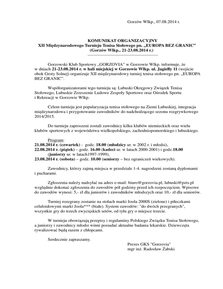 Gorzów Wlkp., 07.08.2014 r. KOMUNIKAT ORGANIZACYJNY XII Międzynarodowego Turnieju Tenisa Stołowego pn. „EUROPA BEZ GRANIC” (Gorzów Wlkp., 21-23.08.2014 r.) ----------------------------------------------Gorzowski Klub Sportowy „GORZOVIA” w Gorzowie Wlkp. informuje, Ŝe w dniach 21-23.08.2014 r. w hali miejskiej w Gorzowie Wlkp. ul. Jagiełły 11 (wejście obok Groty Solnej) organizuje XII międzynarodowy turniej tenisa stołowego pn. „EUROPA BEZ GRANIC”. Współorganizatorami tego turnieju są: Lubuski Okręgowy Związek Tenisa Stołowego, Lubuskie Zrzeszenie Ludowe Zespoły Sportowe oraz Ośrodek Sportu i Rekreacji w Gorzowie Wlkp. Celem turnieju jest popularyzacja tenisa stołowego na Ziemi Lubuskiej, integracja międzynarodowa i przygotowanie zawodników do nadchodzącego sezonu rozgrywkowego 2014/2015. Do turnieju zaproszeni zostali zawodnicy kilku klubów niemieckich oraz wielu klubów sportowych z województwa wielkopolskiego, zachodniopomorskiego i lubuskiego. Program: 21.08.2014 r. (czwartek) - godz. 18.00 (młodzicy ur. w 2002 r. i młodsi), 22.08.2014 r. (piątek) – godz. 16.00 (kadeci ur. w latach 2000-2001) i godz.18.00 (juniorzy ur. w latach1997-1999), 23.08.2014 r. (sobota) – godz. 10.00 (seniorzy – bez ograniczeń wiekowych). Zawodnicy, którzy zajmą miejsca w przedziale 1-4. nagrodzeni zostaną dyplomami i pucharami. Zgłoszenia naleŜy nadsyłać na adres e-mail: [email protected], [email protected] względnie dokonać zgłoszenia do zawodów pół godziny przed ich rozpoczęciem. Wpisowe do zawodów wynosi: 5,- zł dla juniorów i zawodników młodszych oraz 10,- zł dla seniorów. Turniej rozegrany zostanie na stołach marki Joola 2000S (zielone) i piłeczkami celuloidowymi marki Joola*** (białe). System zawodów: "do dwóch przegranych", wszystkie gry do trzech zwycięskich setów, od tyłu gry o miejsce trzecie. W turnieju obowiązują przepisy i regulaminy Polskiego Związku Tenisa Stołowego, a juniorzy i zawodnicy młodsi winni posiadać aktualne badania lekarskie. Dziewczęta rywalizować będą razem z chłopcami. Serdecznie zapraszamy. Prezes GKS "Gorzovia" mgr inŜ. Radosław śabski